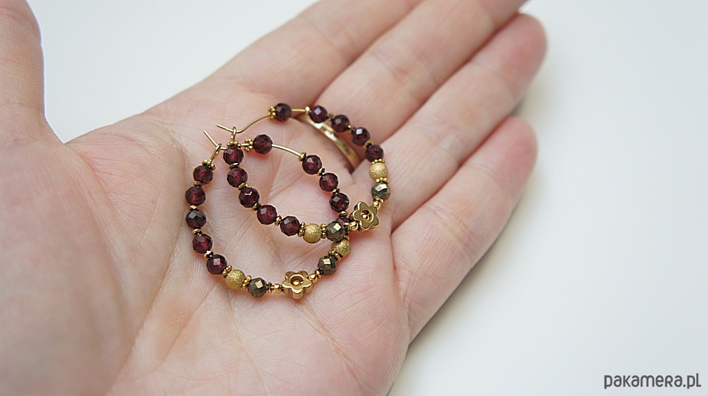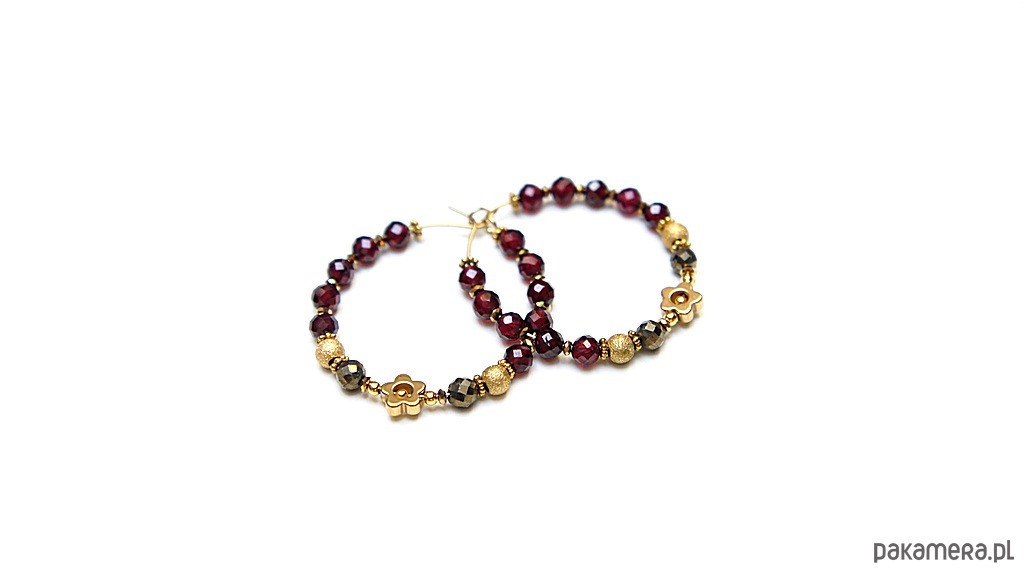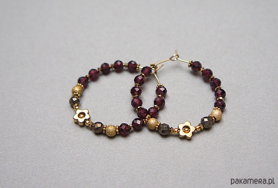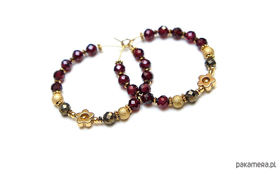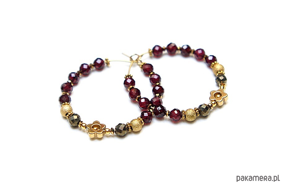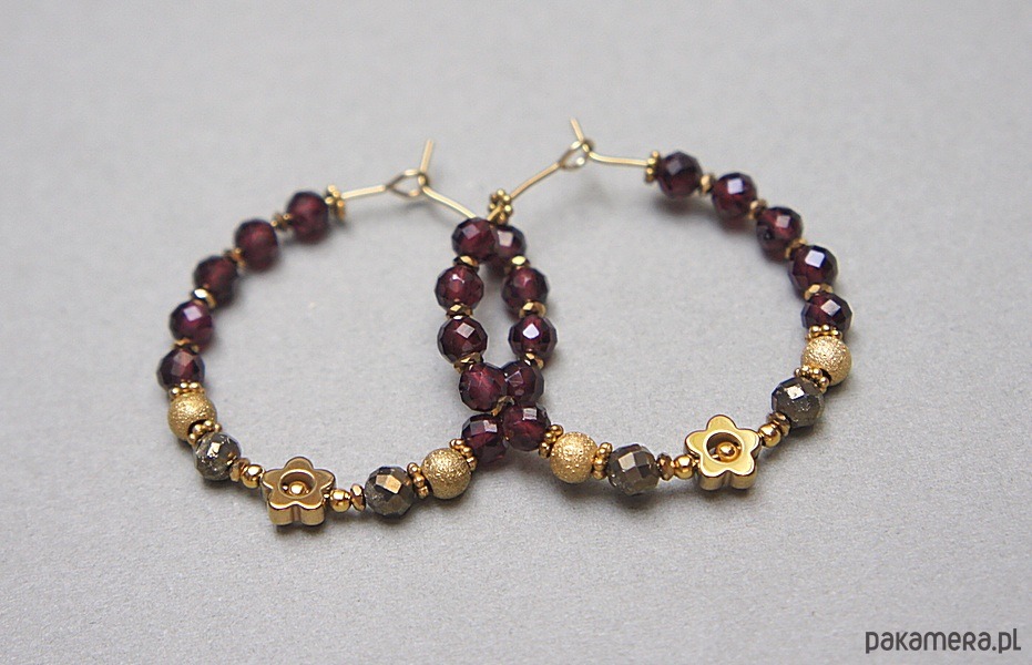 Kolczyki wykonane ze stali szlachetnej pokrytej zlotem, granatów fasetowanych [3,5mm], pirytów fasetowanych o surowym wyglądzie [3,5mm], hematytowych kwiatków [6mm]. Średnica kół 30mm. Biżuteria ozdobnie zapakowana.