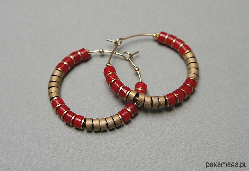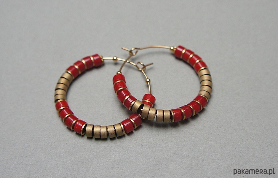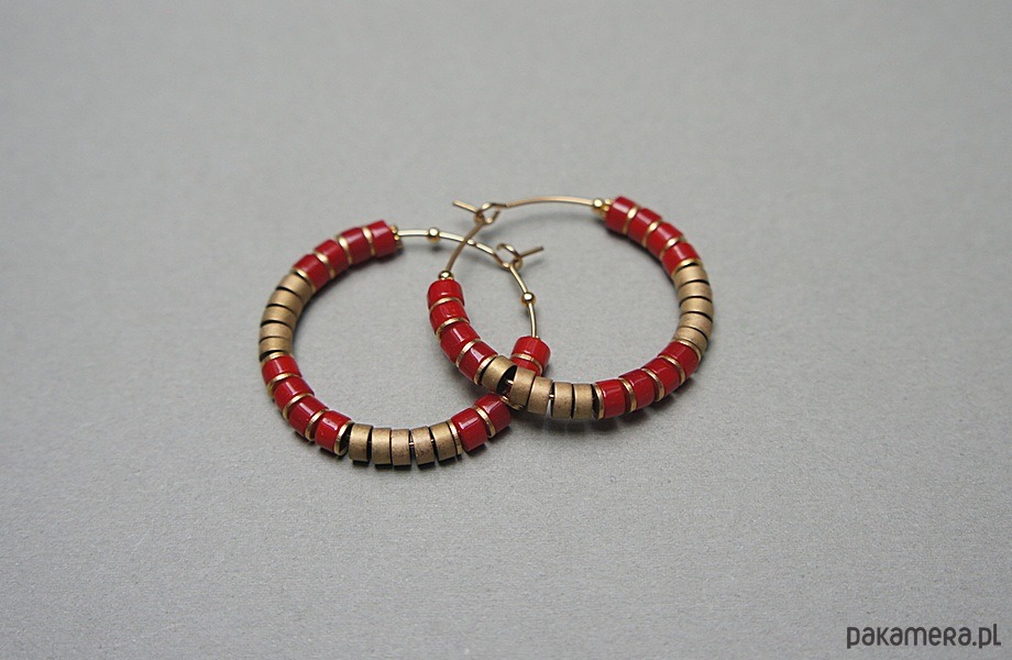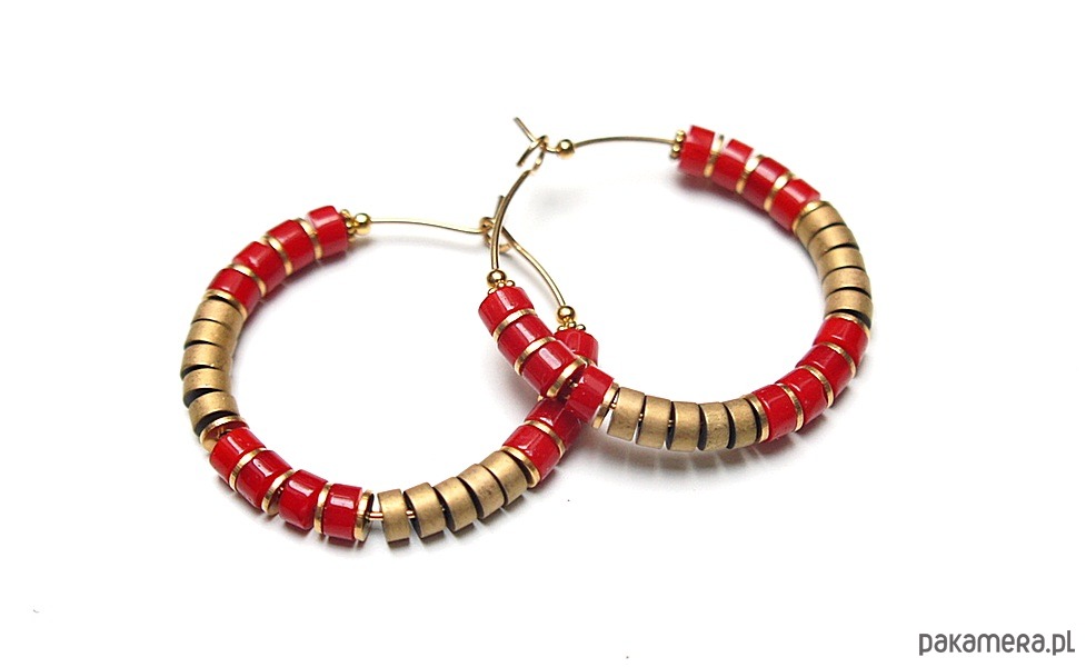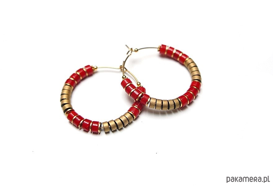 Kolczyki wykonane ze stali szlachetnej pokrytej zlotem, talarków naturalnego korala [4 x 2mm], hematytu matowego [4 x 2mm]. Średnica kół 30mm. Biżuteria ozdobnie zapakowana.