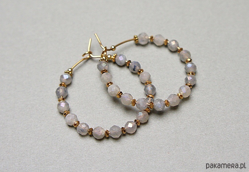 Kolczyki wykonane ze stali szlachetnej pokrytej zlotem, kuleczek fasetowanych, galwanizowanych labradorytów [3mm], oponek fasetowanych labradorytów [3mm] oraz przekładek z hematytu [1mm]. Średnica kół 30mm. Biżuteria ozdobnie zapakowana.