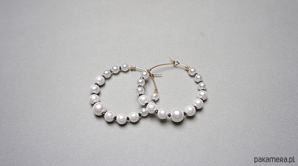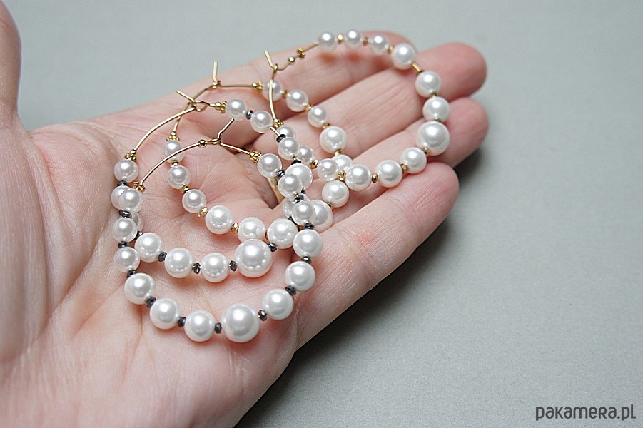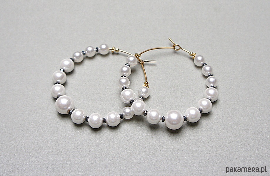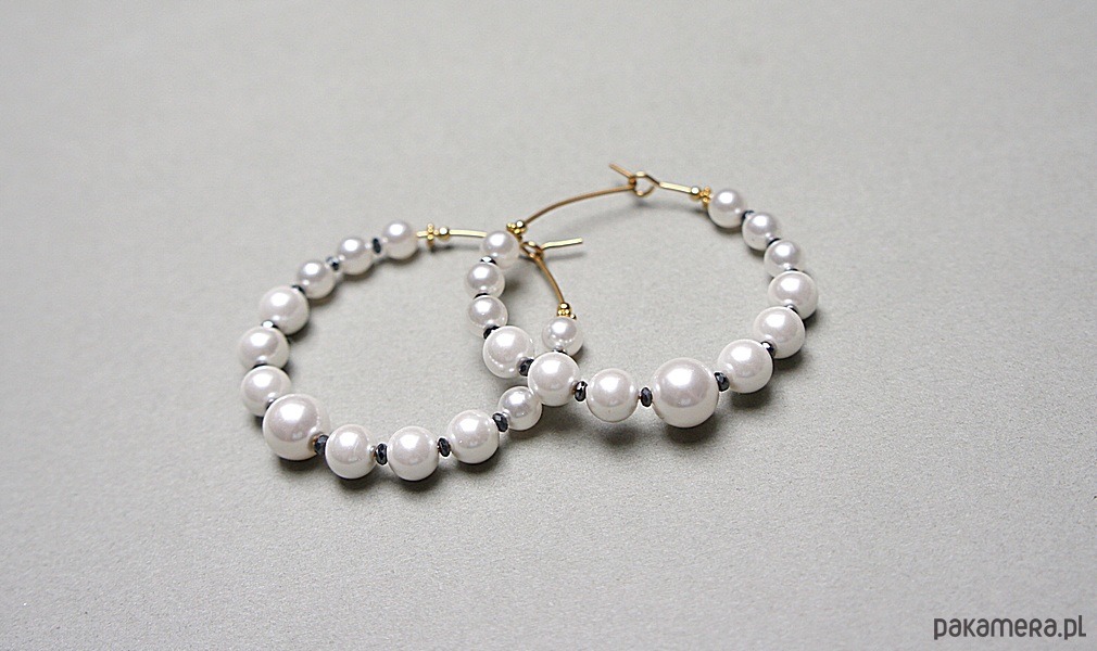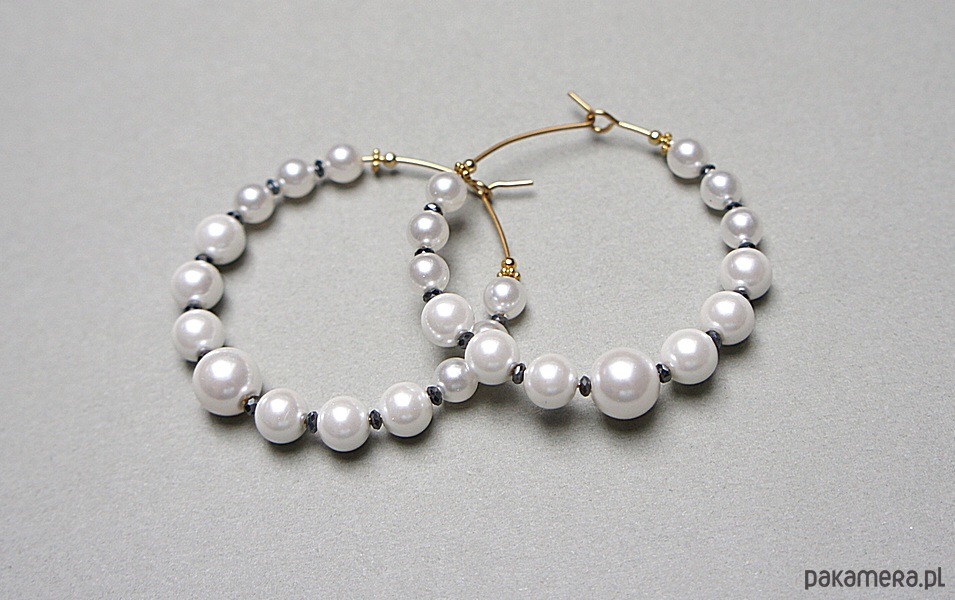 Kolczyki wykonane ze stali szlachetnej pokrytej zlotem, pereł seashell [5, 6, 8 i 10mm], przekładek z hematytu [4 x 1mm]. Średnica kół 40mm. Biżuteria ozdobnie zapakowana.