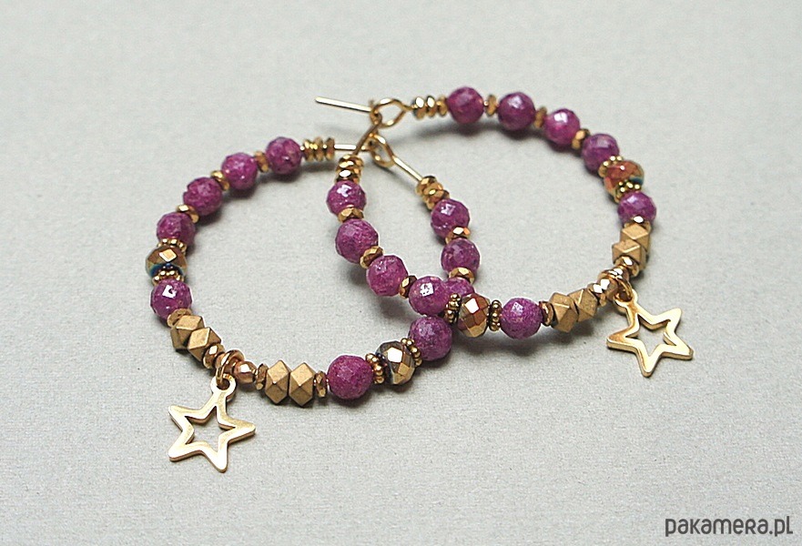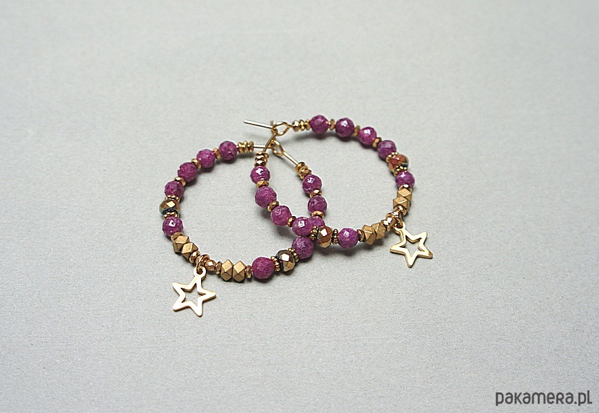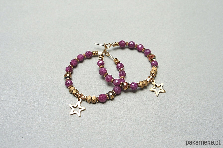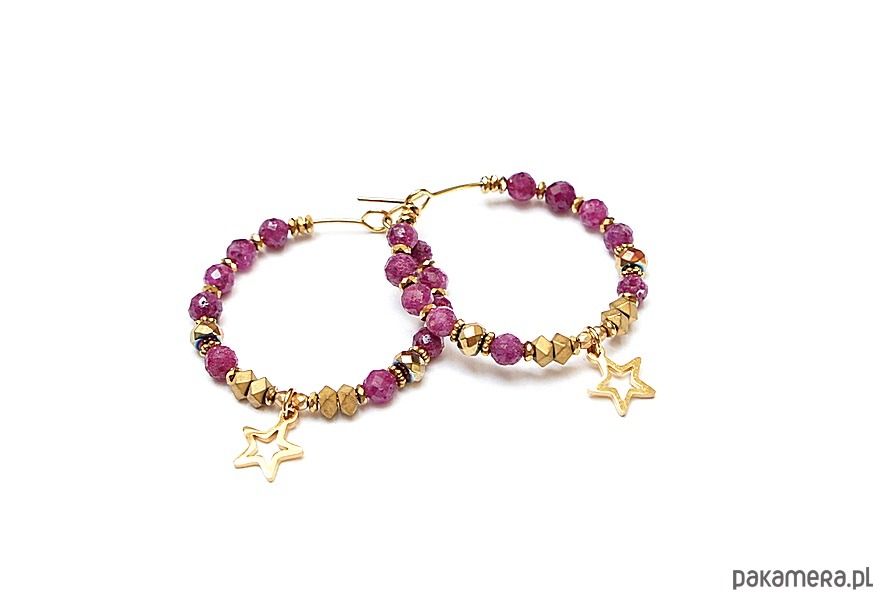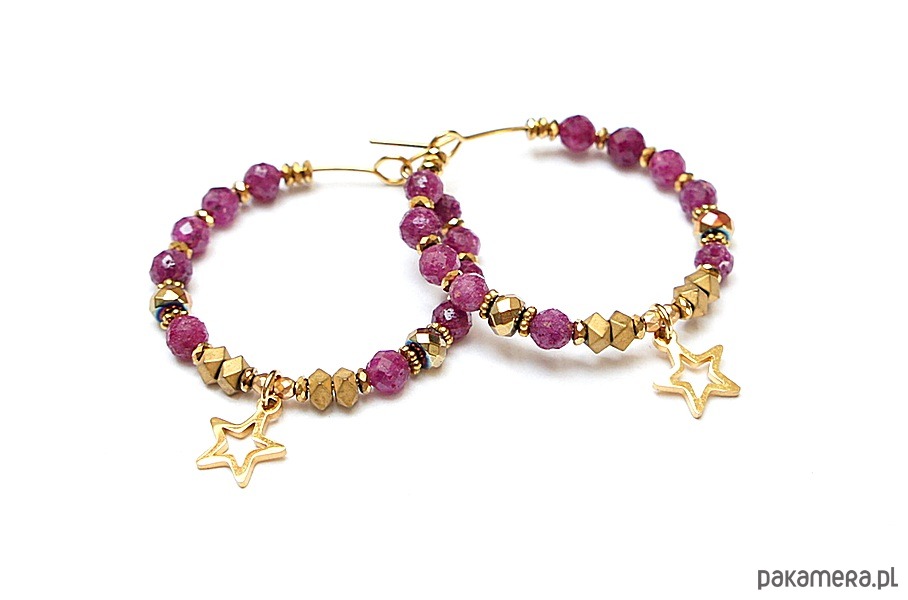 Kolczyki wykonane ze stali szlachetnej pokrytej zlotem, rubinów fasetowanych [3,5mm], oponek z hematytu [4 x 3mm], fasetowanych, platerowanych hematytów [3mm i 2mm], przekładek z hematytu [3 x 2mm oraz 1mm]. Średnica kół 30mm. Biżuteria ozdobnie zapakowana.