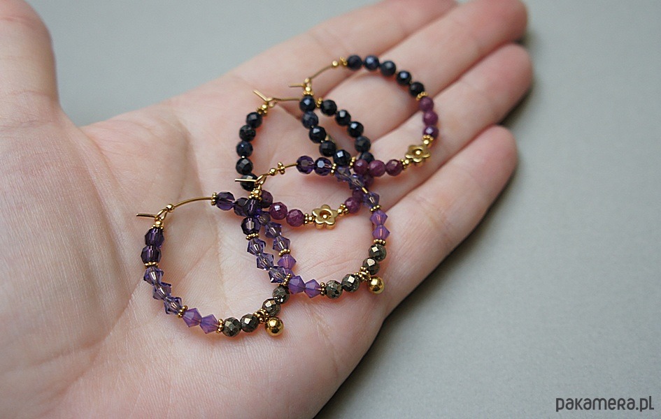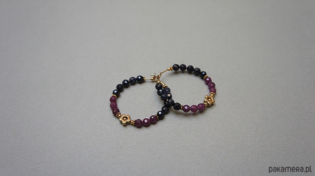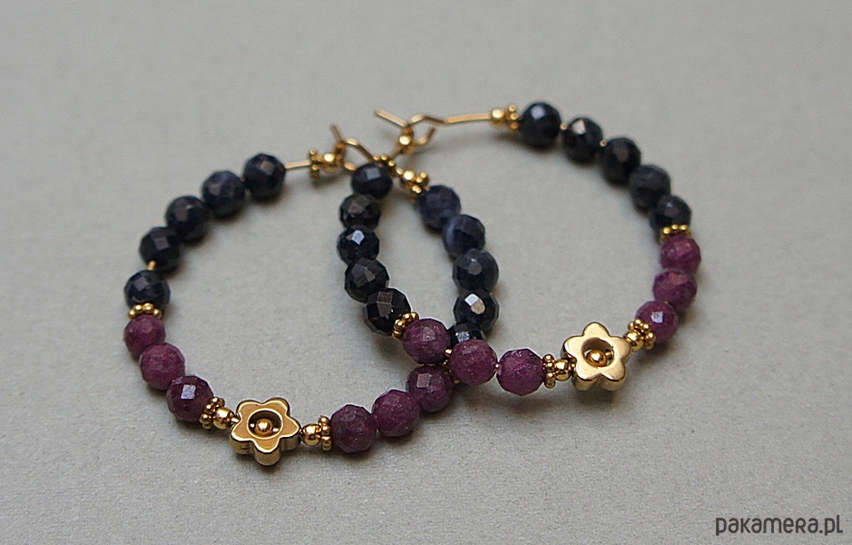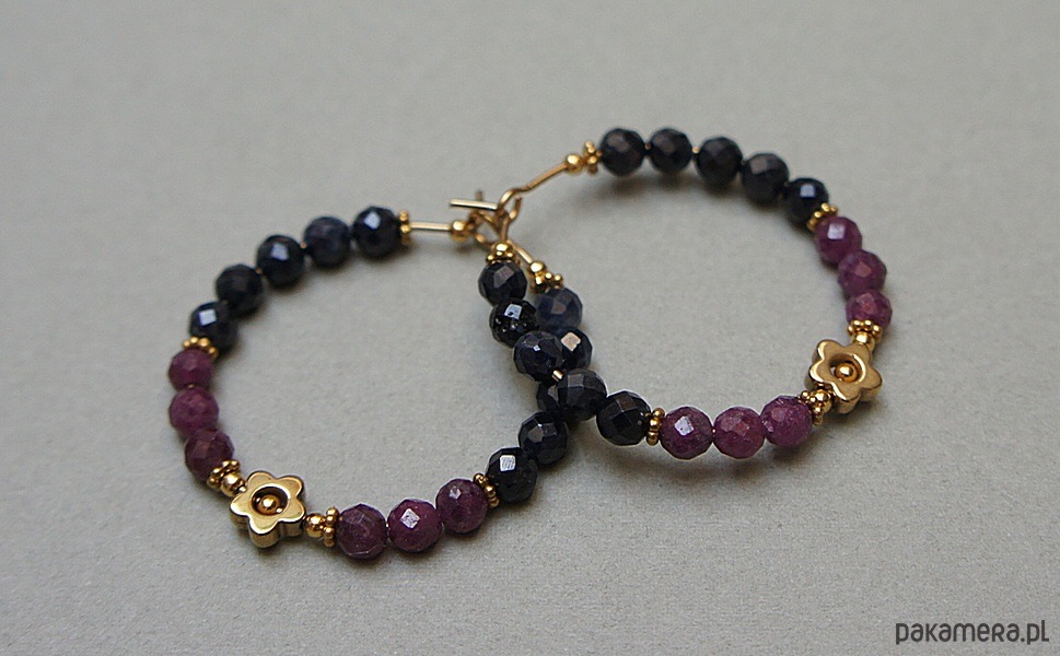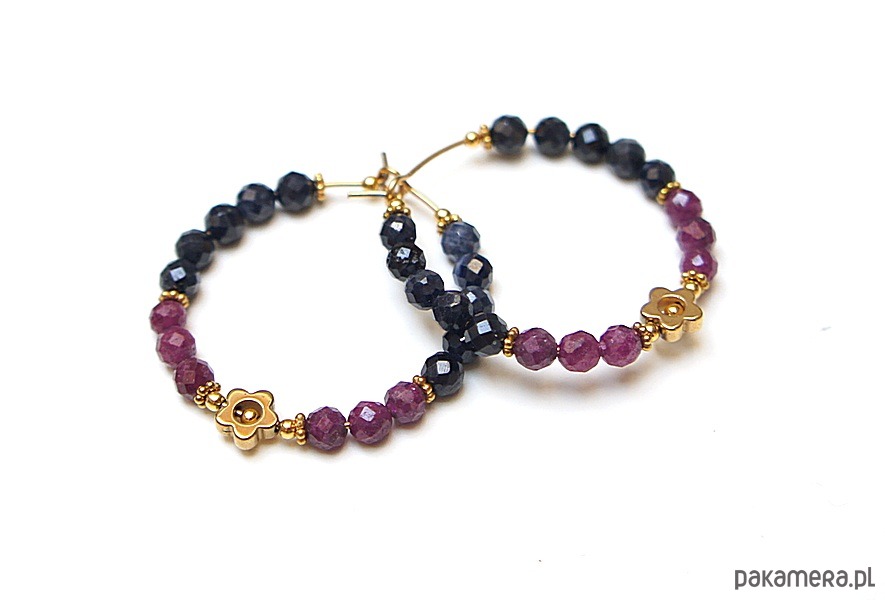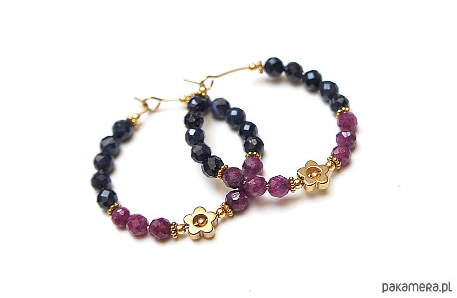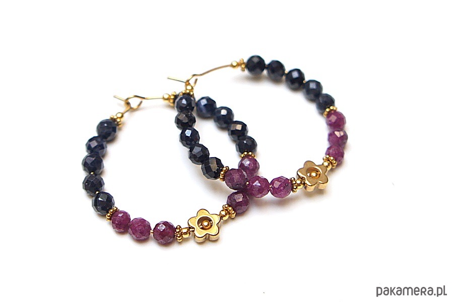 Kolczyki wykonane ze stali szlachetnej pokrytej zlotem, rubinów fasetowanych [3,5mm], szafirów fasetowanych [3,5mm], hematytowych kwiatków [6mm]. Średnica kół 35mm. Biżuteria ozdobnie zapakowana.
