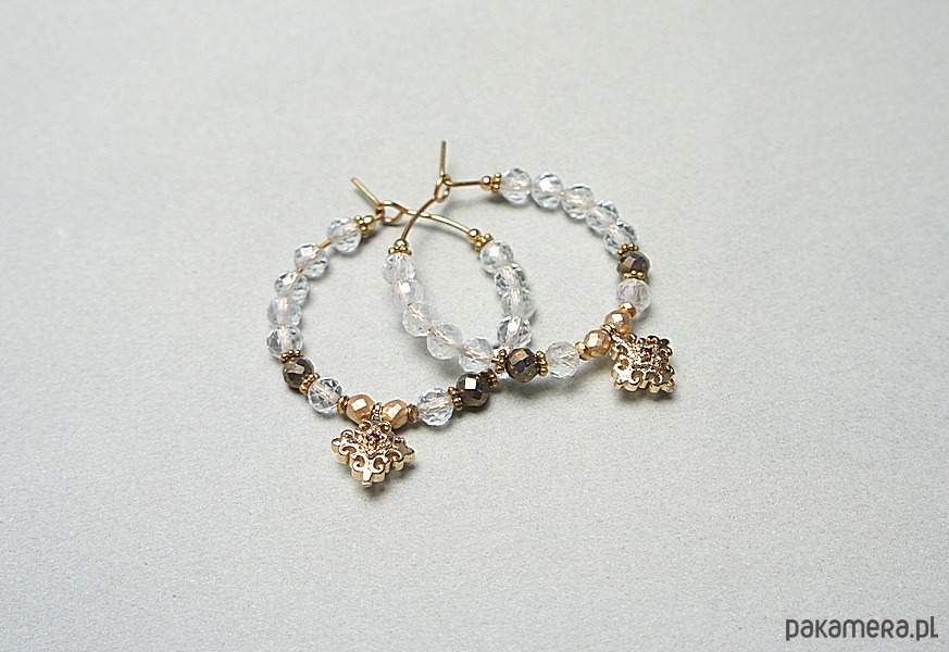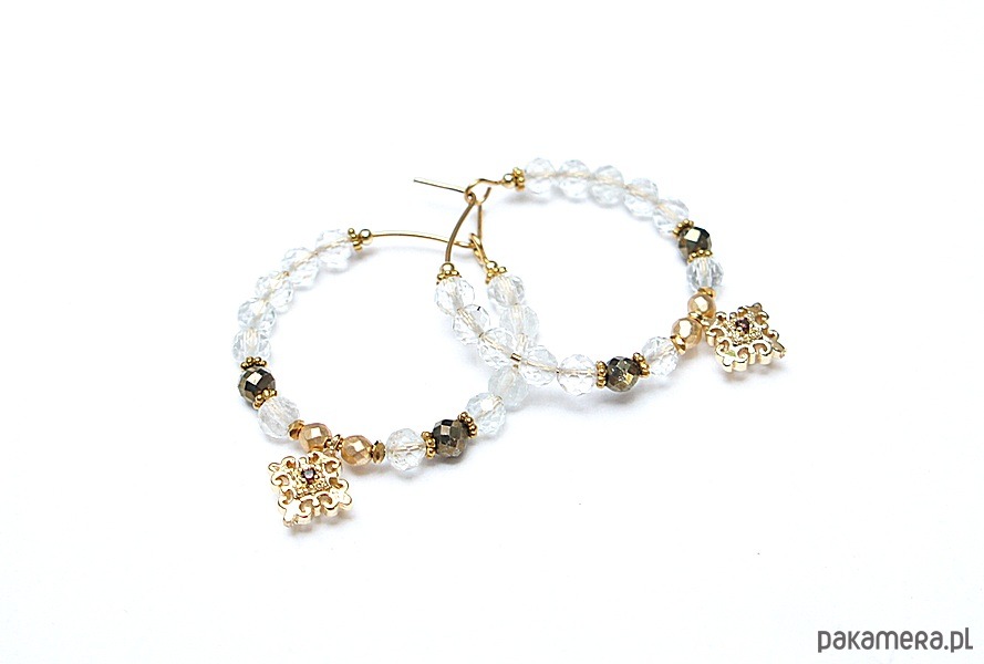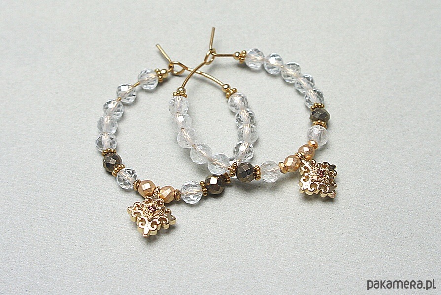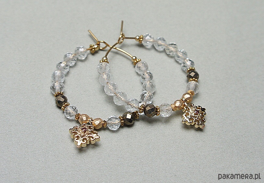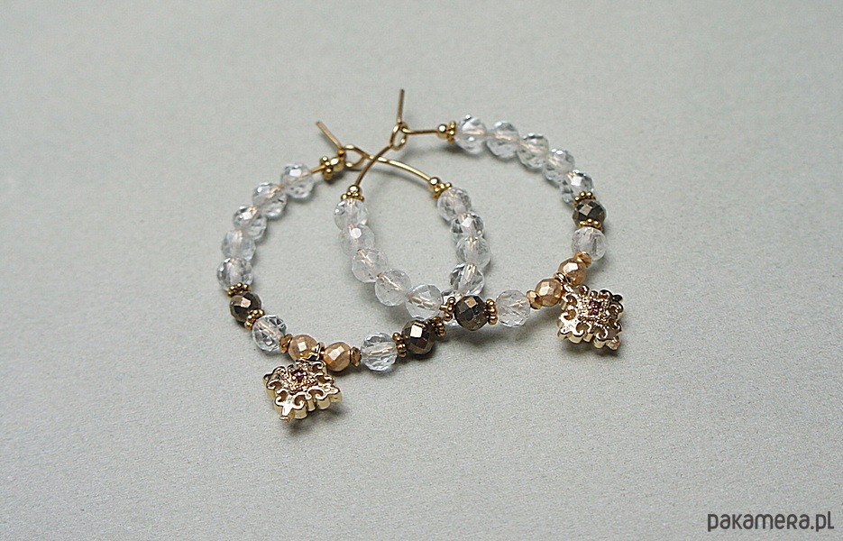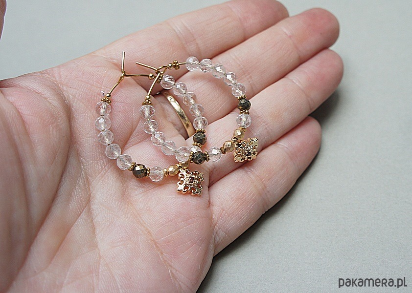 Kolczyki wykonane ze stali szlachetnej pokrytej zlotem, topazu fasetowanego [4mm], pirytu fasetowanego [4mm], hematytu fasetowanego, platerowanego [3mm], przekładek z hematytu [1mm] oraz zawieszek z mosiądzu platerowanego z cyrkoniami. Średnica kół 30mm. Biżuteria ozdobnie zapakowana.
