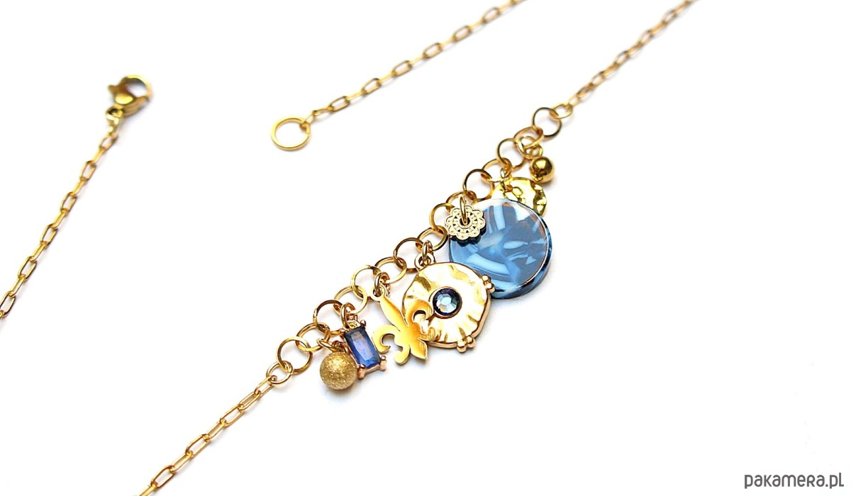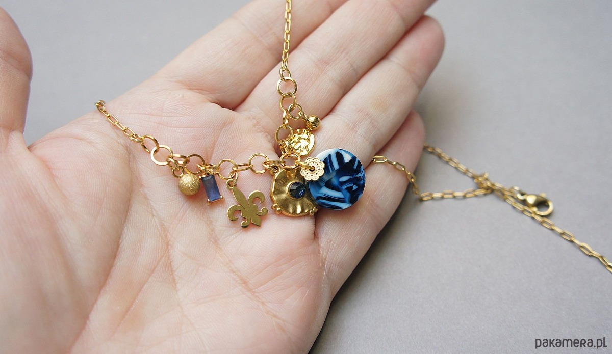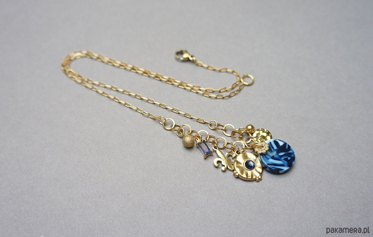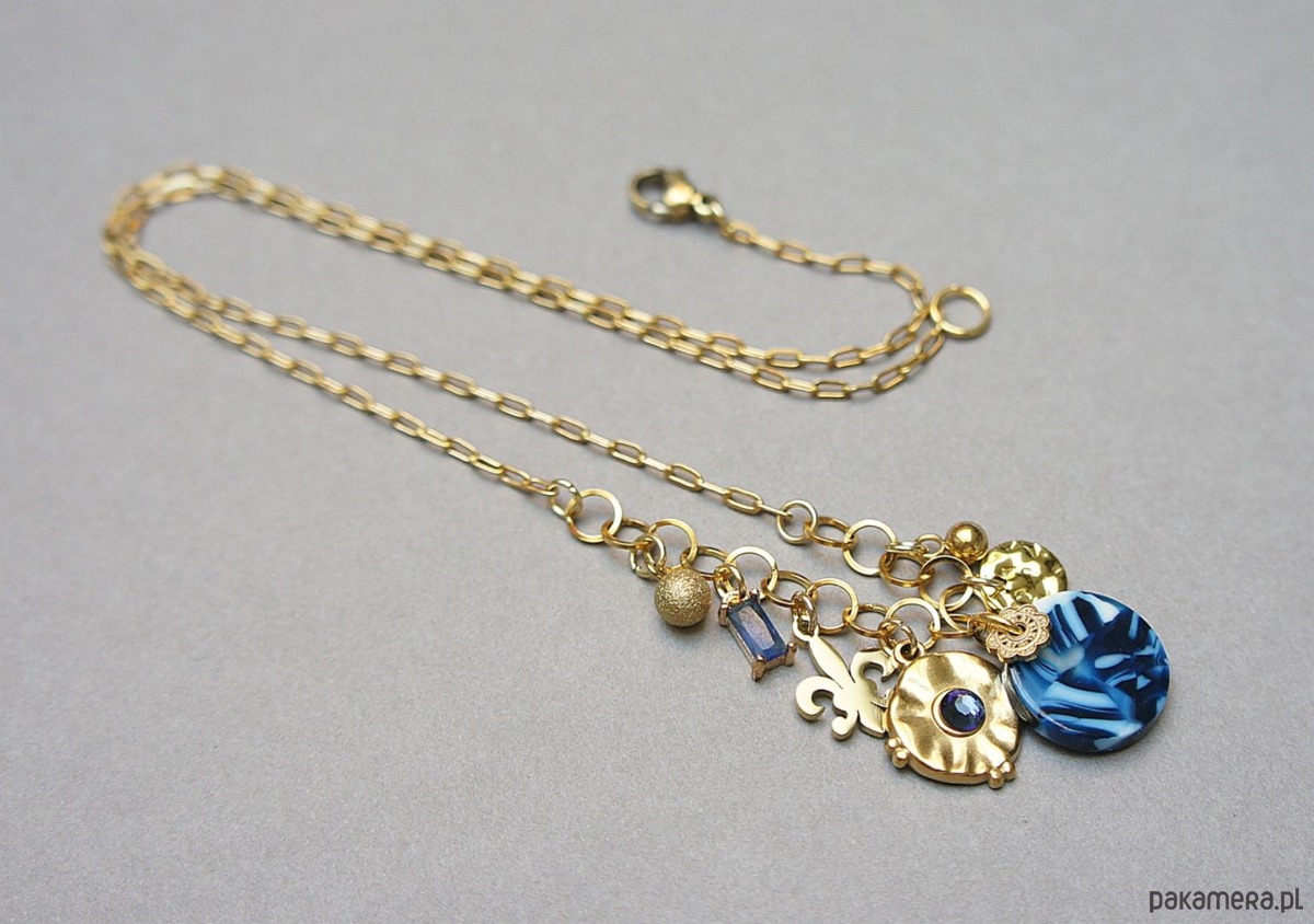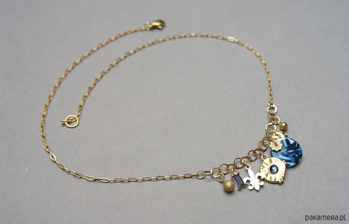Krótki naszyjnik wykonany w całości ze stali szlachetnej pozłacanej w połączeniu z monetką żywicy [15mm],cyrkonią w okuciu , oraz zawieszkami. Całkowita długość naszyjnika ok. 42,5cm. Biżuteria ozdobnie zapakowana.