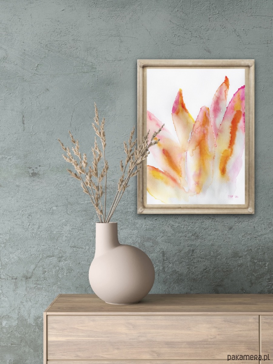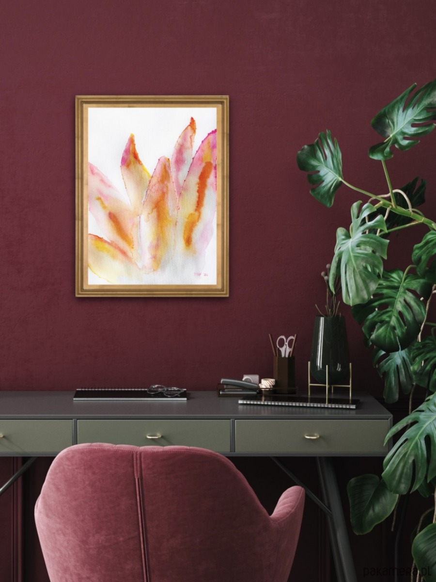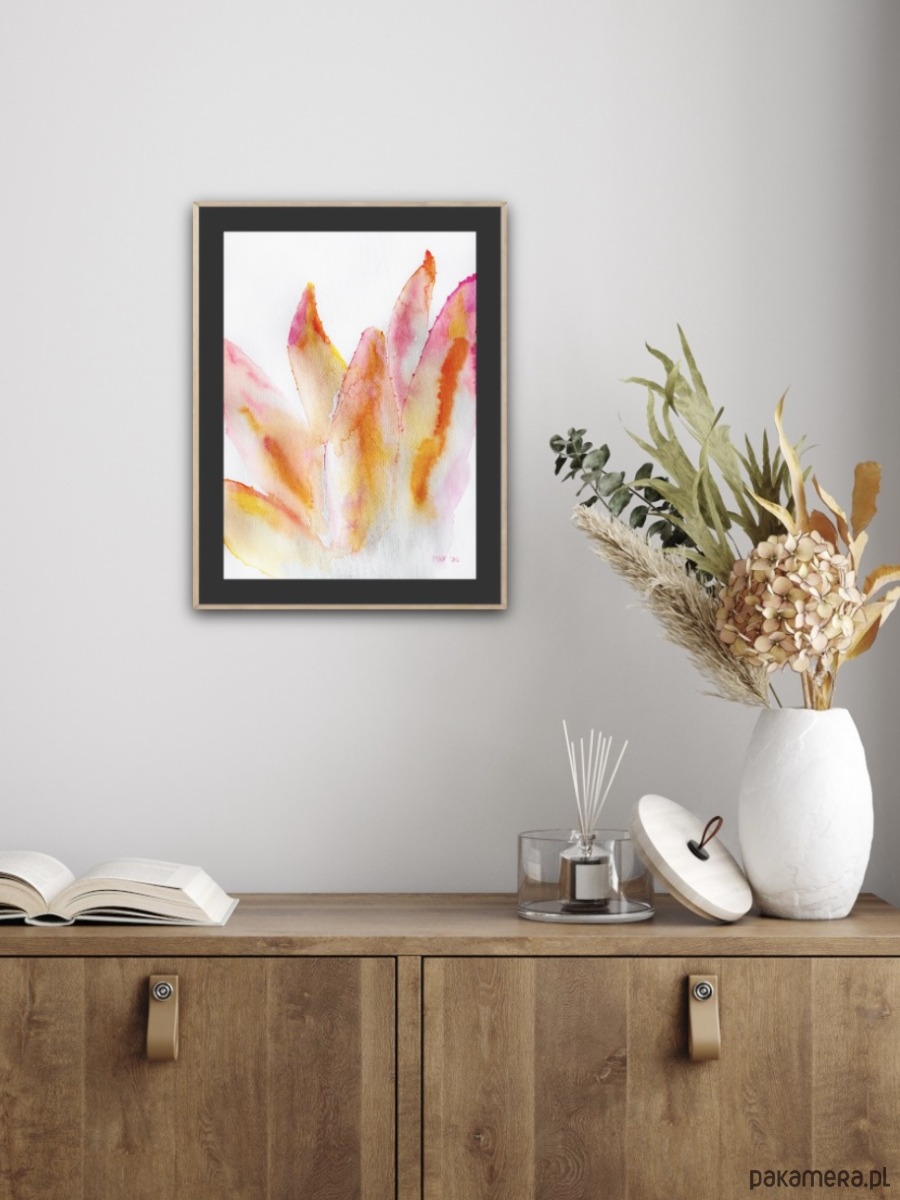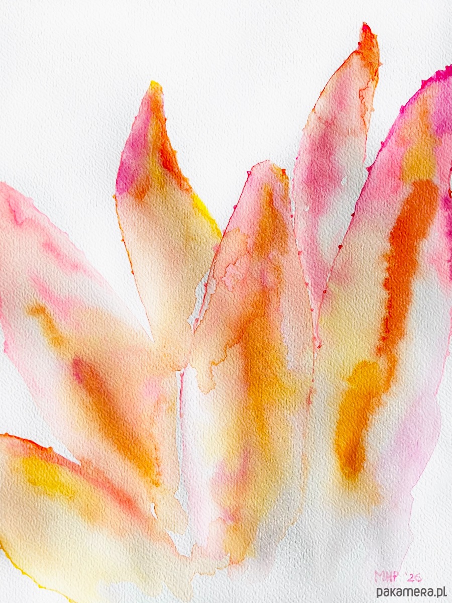 Praca Aloes pomarańcz / róż to oryginalna akwarela namalowana na profesjonalnym papierze akwarelowym. Traktuje o abstrakcyjnym postrzeganiu liści aloesu.