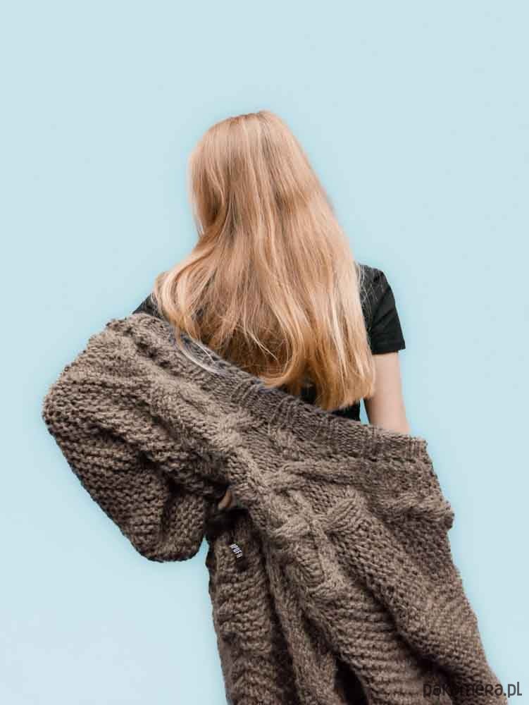 Sweter wykonany został ręcznie na drutach z naturalnej wełny alpaki.