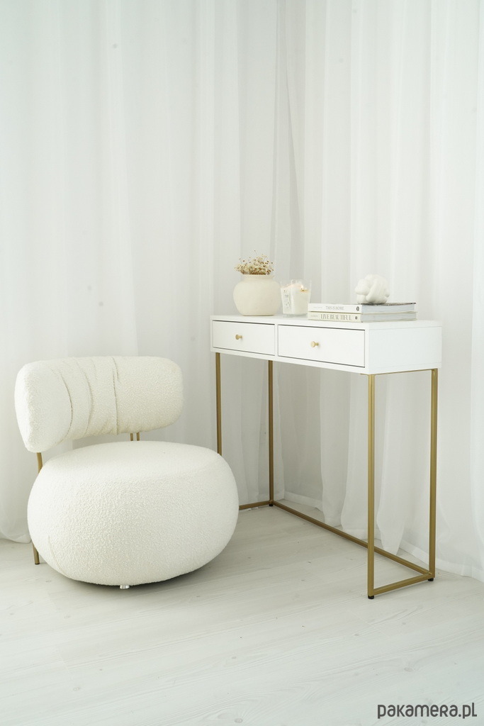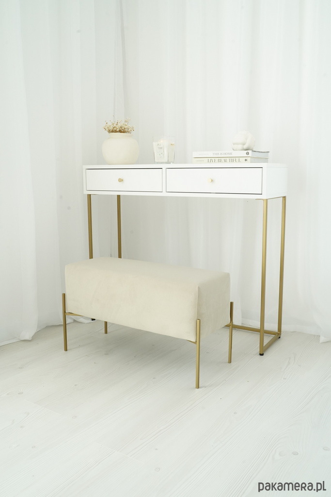 Piękna toaletka z szufladami to propozycja dla osób, które lubią ponadczasowe, a jednocześnie innowacyjne rozwiązania. Konsola składa się ze stelażu i dwóch szuflad. Blat i szuflady wykonane są z płyty mdf malowanej na matowy kolor, stelaż zaś malowany jest proszkowo i stworzone z wytrzymałych tworzyw, które zapewniają stabilność i najwyższą wygodę użytkowania.