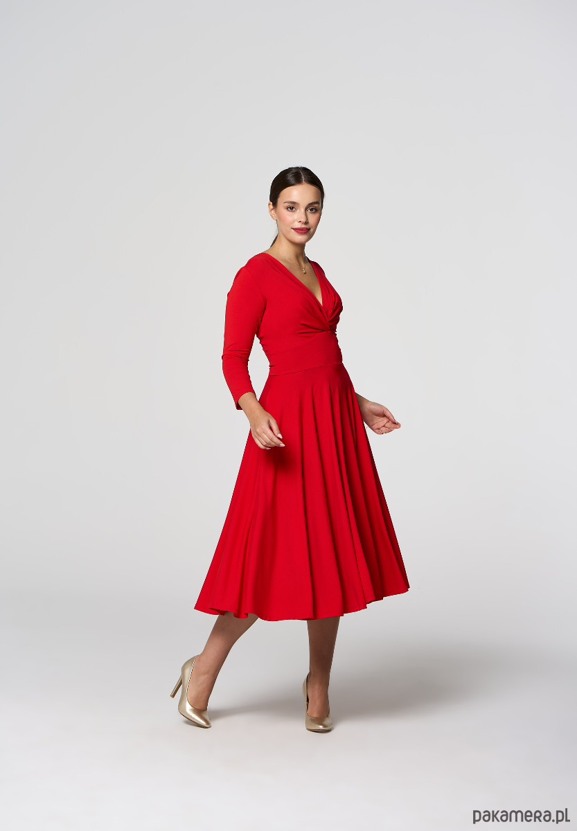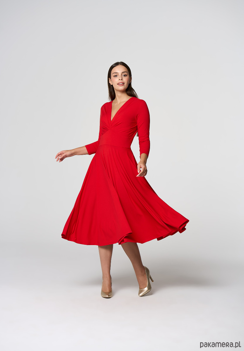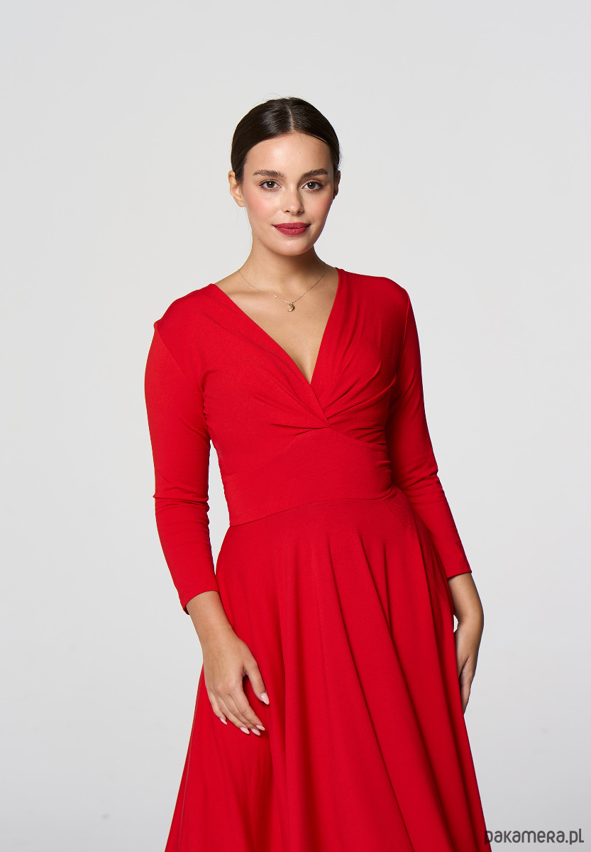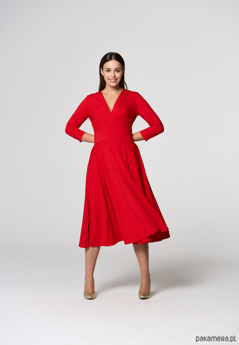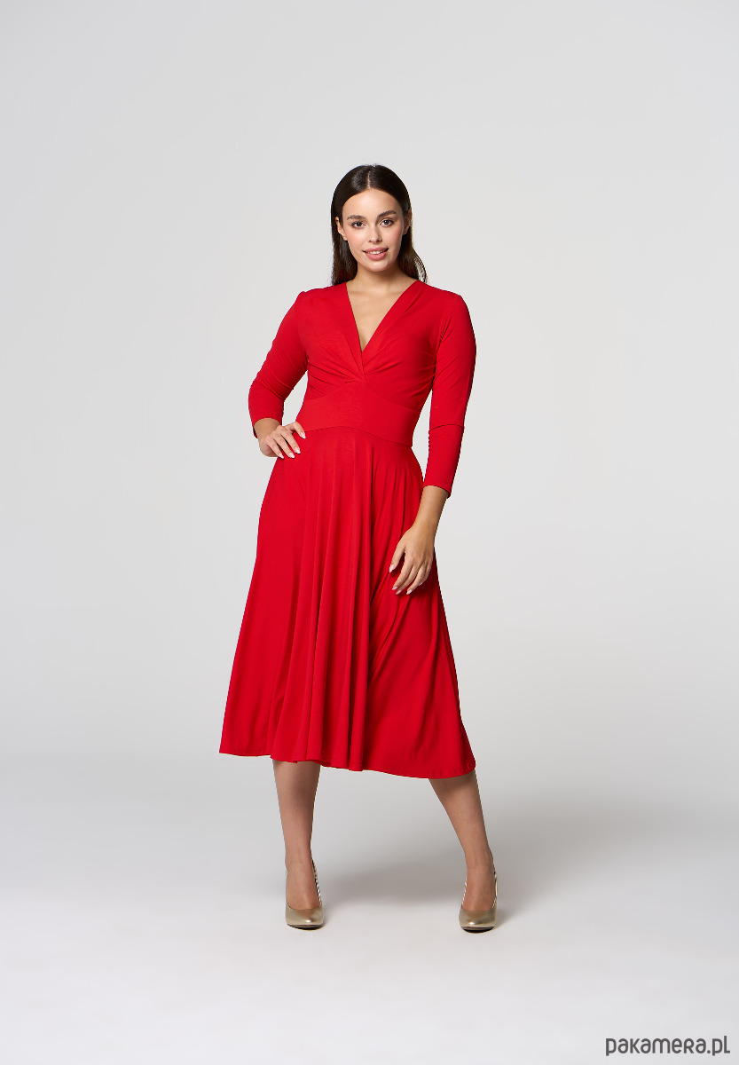 Sukienka midi z szalowym kołnierzem, dopasowana w tali i w biuście.