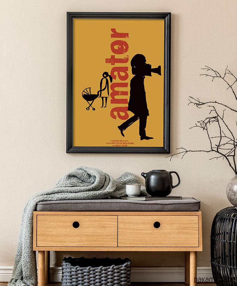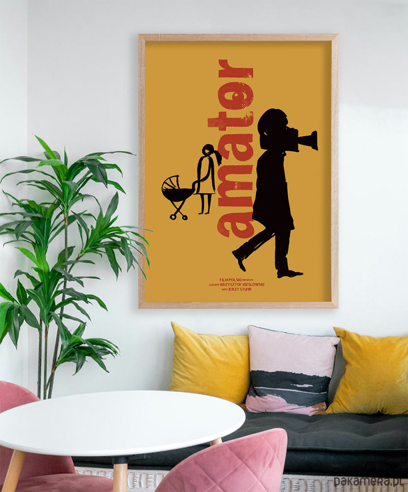 Plakat inspirowany filmem Amator w reżyserii Krzysztofa Kieślowskiego. Kino moralnego niepokoju w najlepszym wydaniu i niezapomniany Jerzy Stuhr w roli Filipa. Dekoracja obowiązkowa dla każdego kinomana.