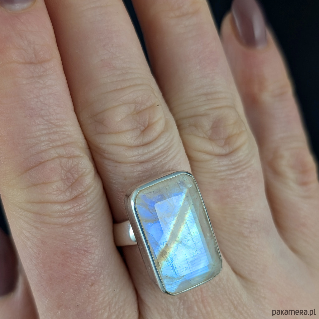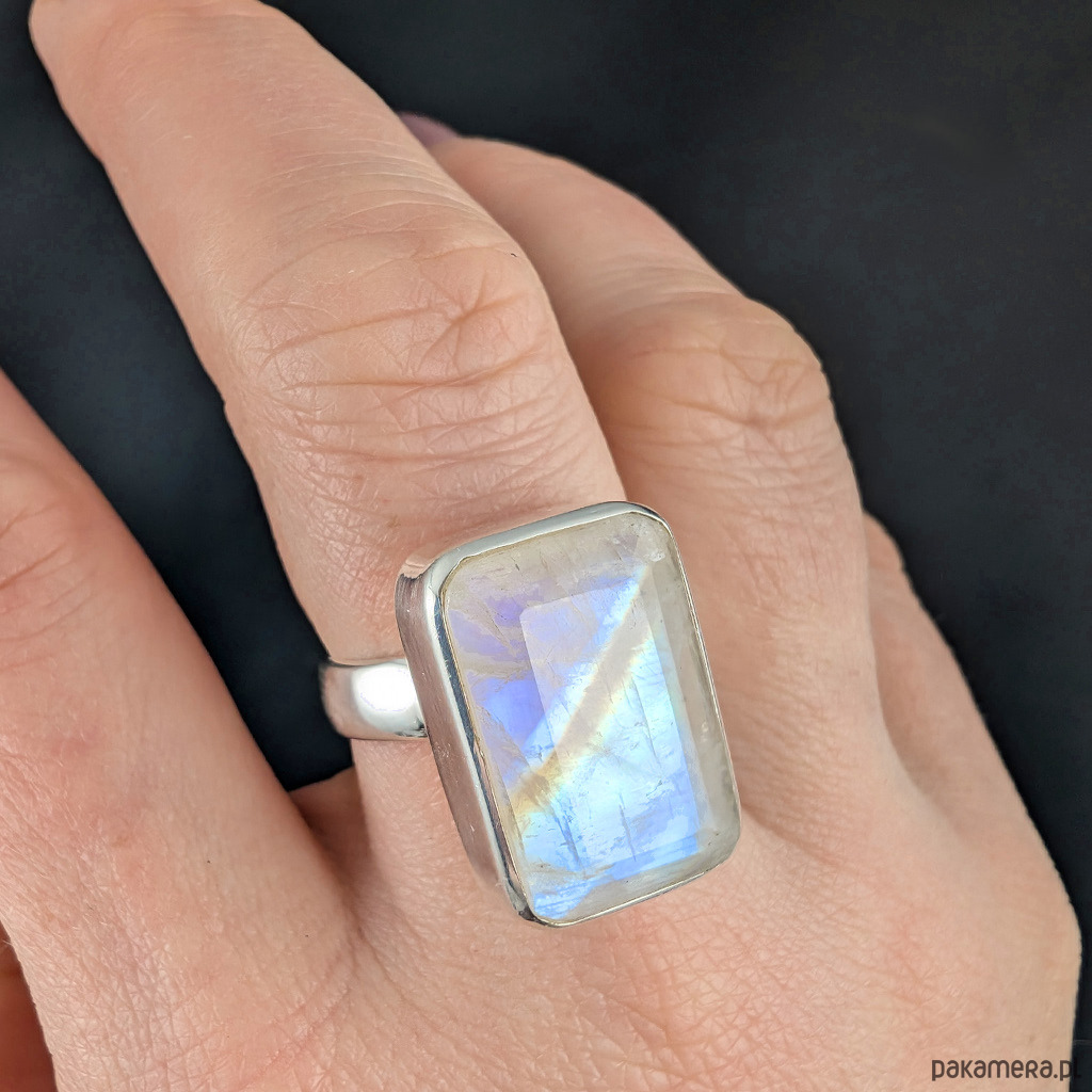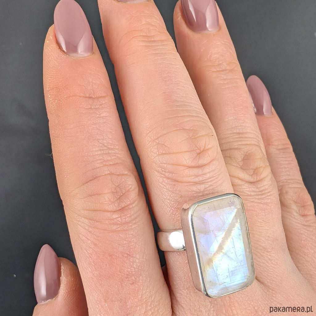 Pierścień z oprawionym w srebro próby 925 pięknym kamieniem księżycowym o błękitnej poświecie . Szerokość obrączki 5 mm. Kamień ma oprawę 23 x 14 mm. Rozmiar jubilerski regulowany w wąskim zakresie 17-20, po zakupie dopasuję do odpowiedniego rozmiaru. Waga 9,77 grama. Wykonany przez dostawcę kamieni, Pierścień zapakowany zostanie w ozdobne pudełeczko.