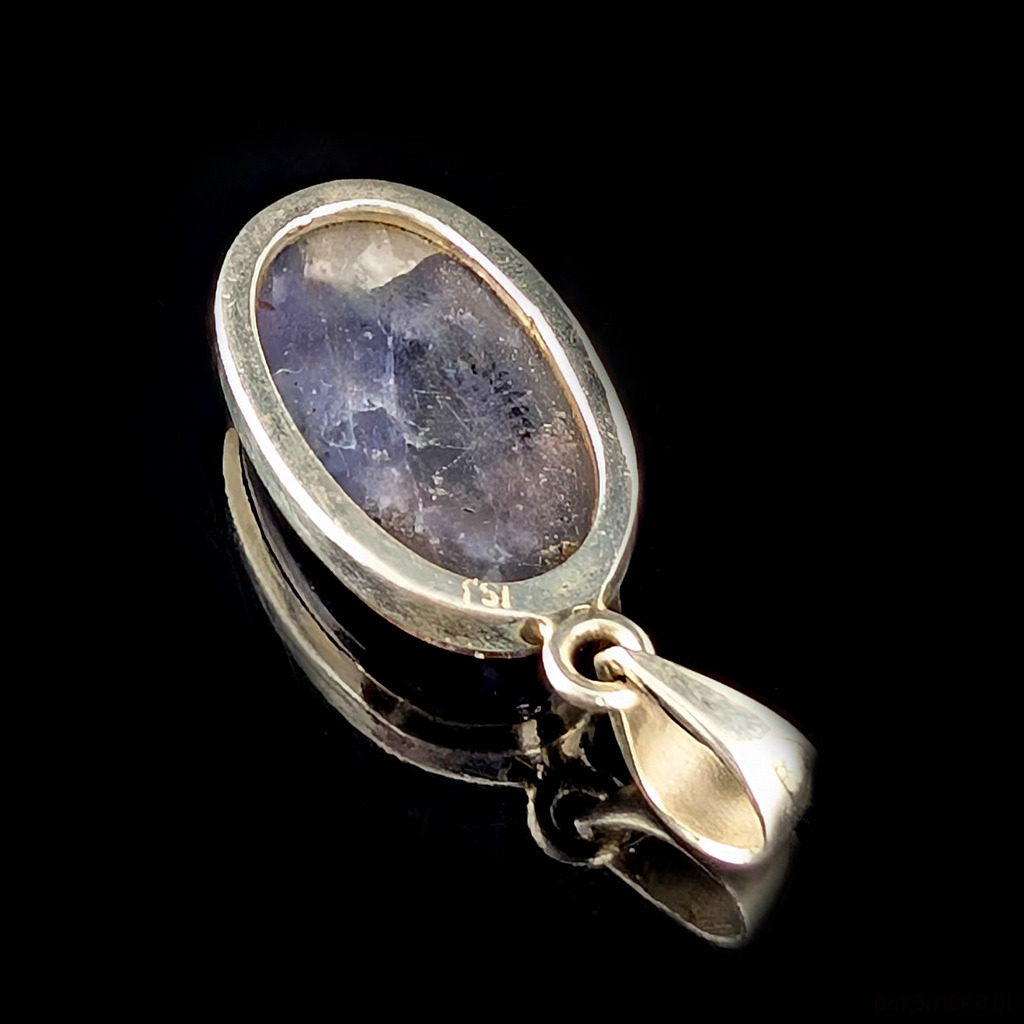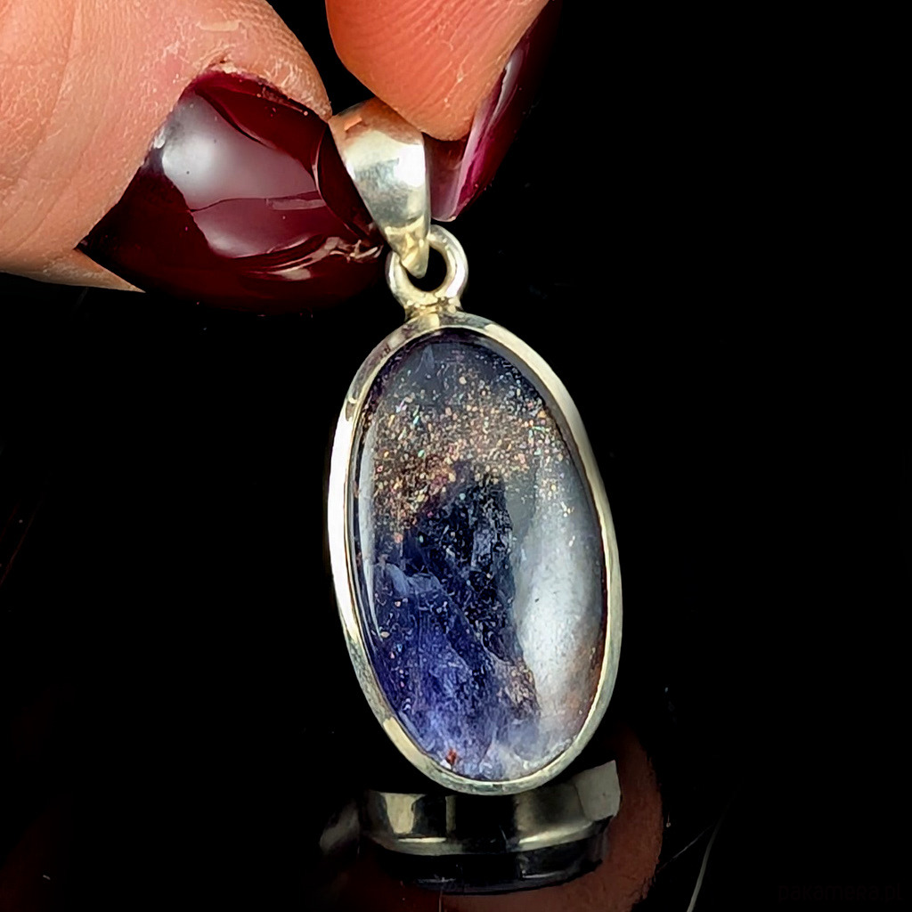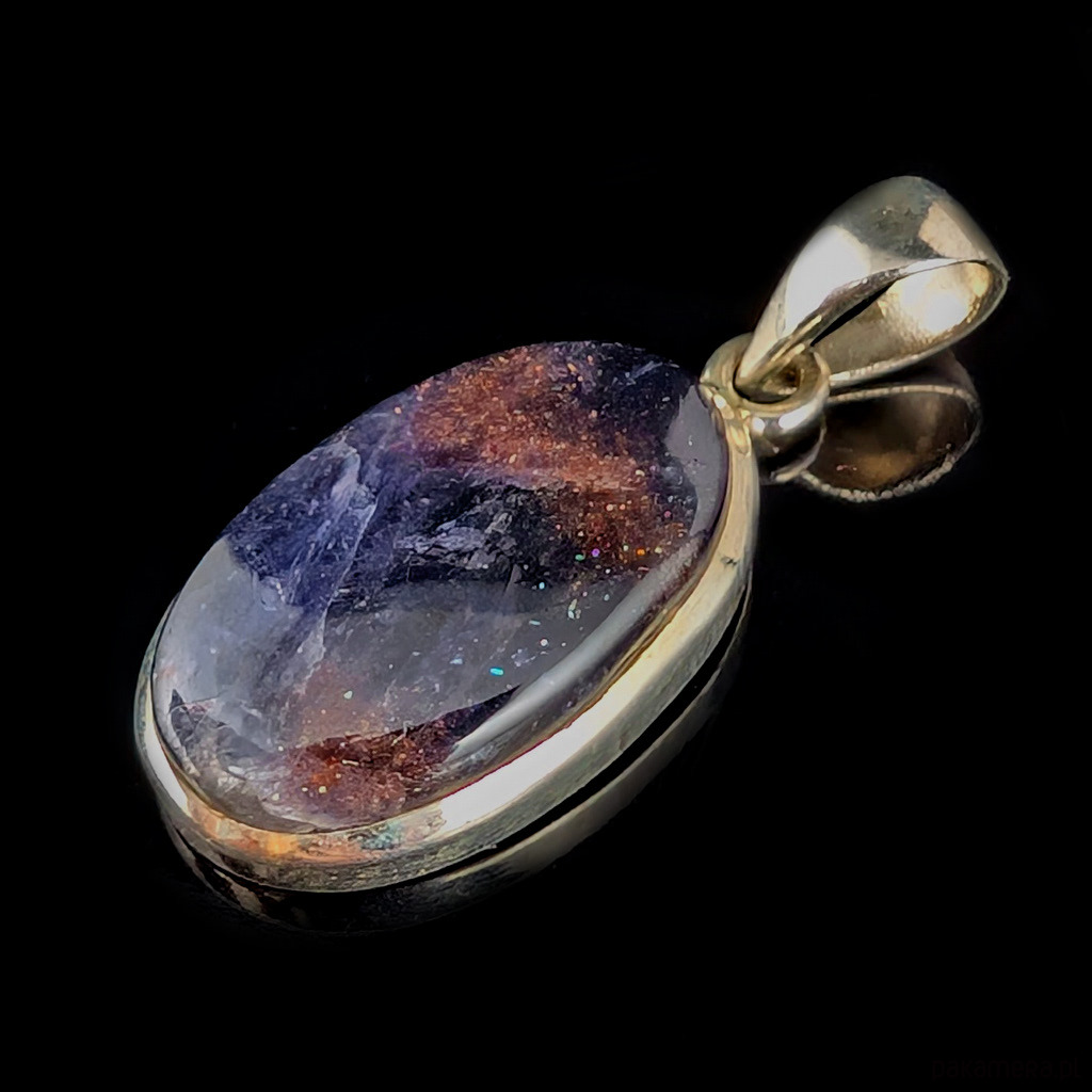 Wisiorek ze srebra próby 925 i zjawiskowego iolitu z kamieniem słonecznym zwanym inaczej skaleniem awenturynowym. Rzadki minerał wykazujący tzw.efekt awenturyzacji w postaci maleńkich mieniących się wrostów- łusek innych minerałów,np.hematytu. Kamień ma oprawę 25 x 15 mm. Długosć max 36 mm. Waga 6 g. Wisiorek wykonany przez dostawcę kamieni. Polecam!