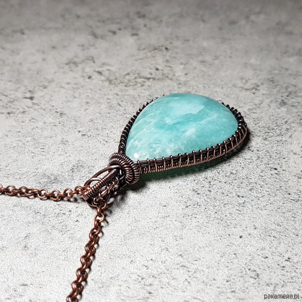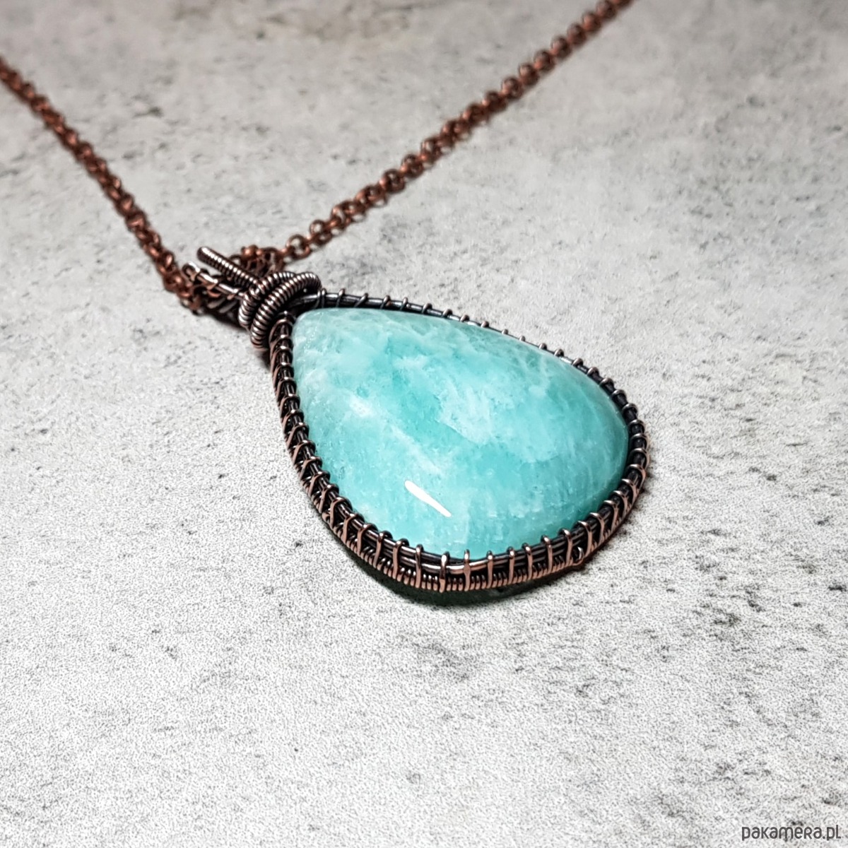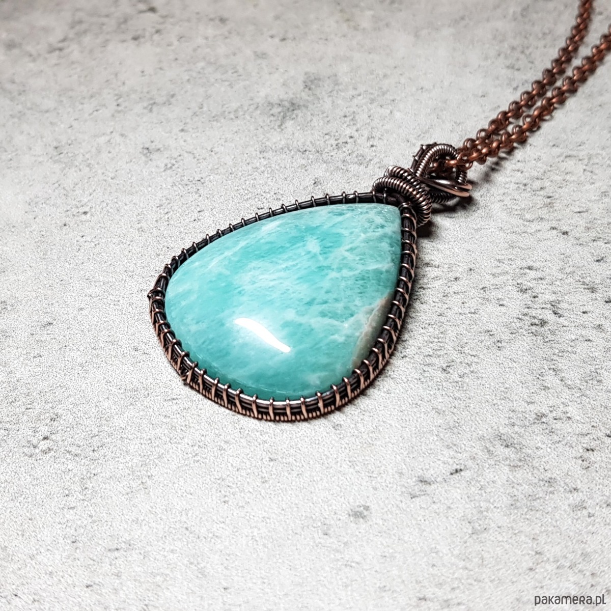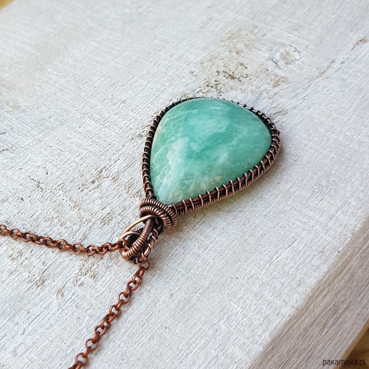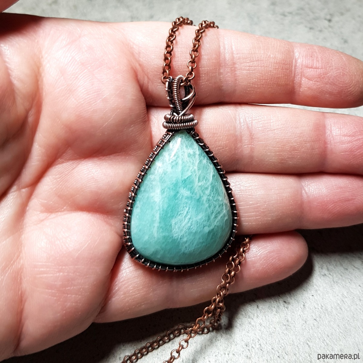 Zawieszka wykonana ręcznie metodą wire-wrappingu której głównym elementem jest naturalny amazonit. Do wykonania wisiorka użyłam drutu z miedzi, następnie zaoksydowałam i wypolerowałam w celu uzyskania szlachetnego efektu postarzenia. Wymiary zawieszki 49x29mm z łańcuszkiem długości około 48-50 cm.