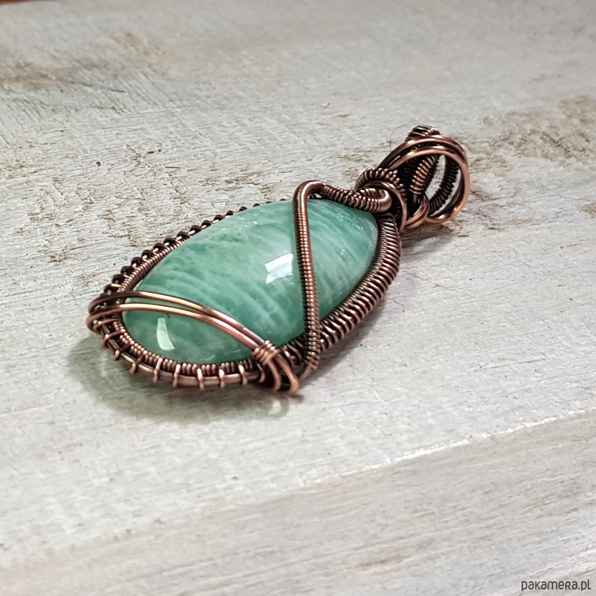 Zawieszka wykonana ręcznie metodą wire-wrappingu której głównym elementem jest naturalny amazonit. Do wykonania wisiorka użyłam drutu z miedzi, następnie zaoksydowałam i wypolerowałam w celu uzyskania szlachetnego efektu postarzenia. Wymiary zawieszki 54x24mm z łańcuszkiem długości około 48-50 cm.