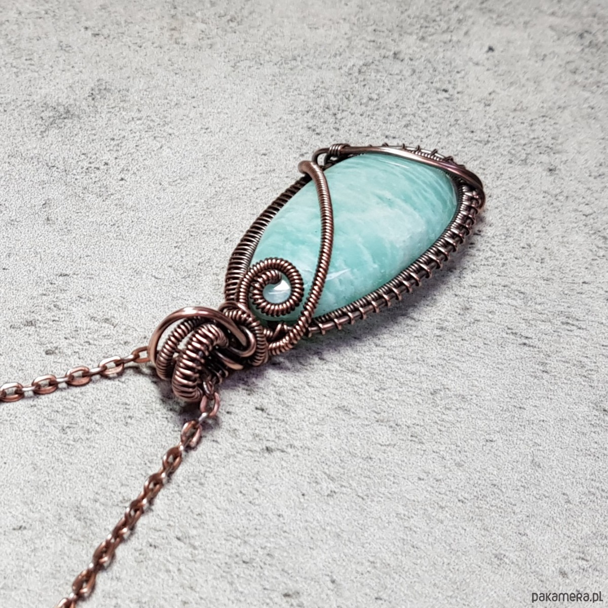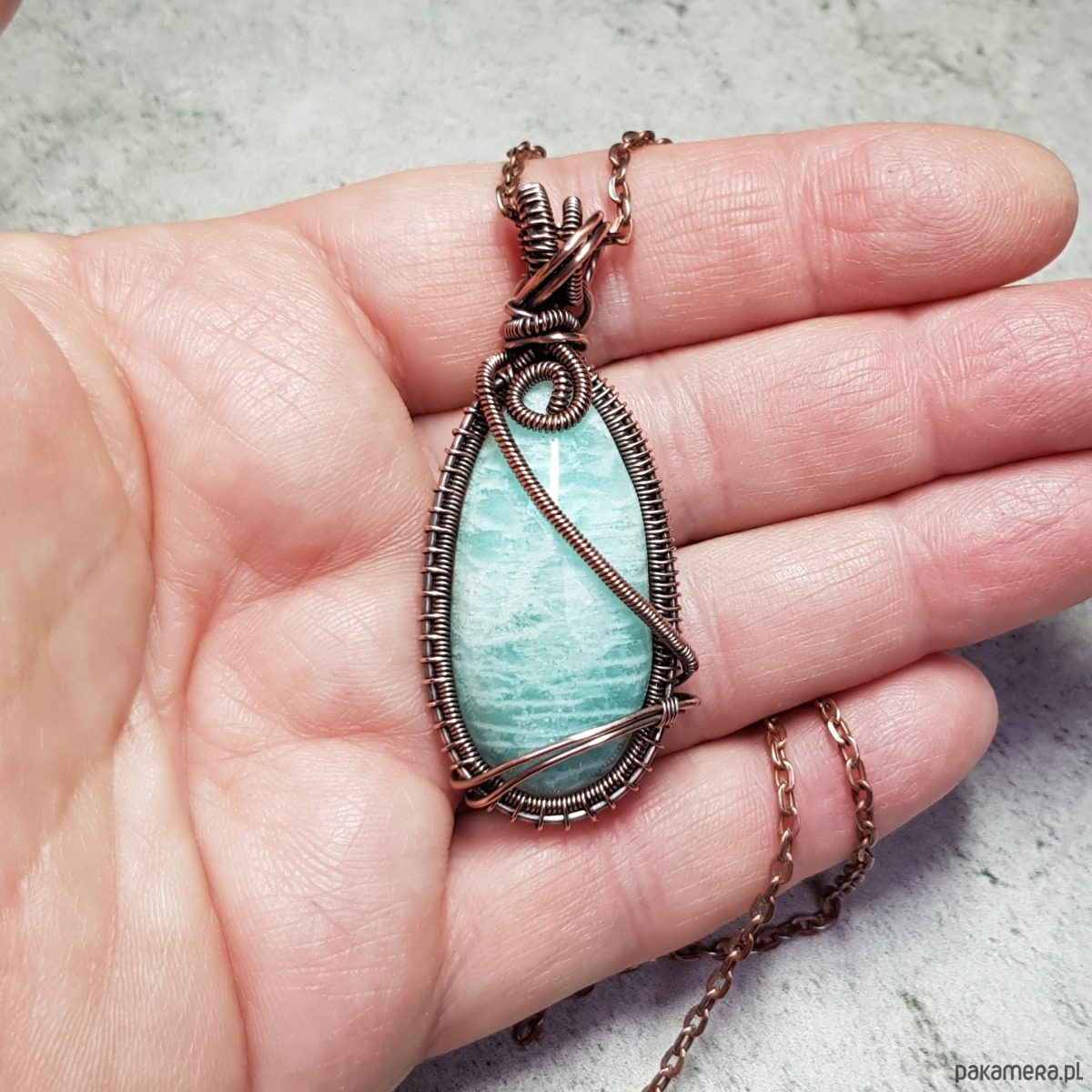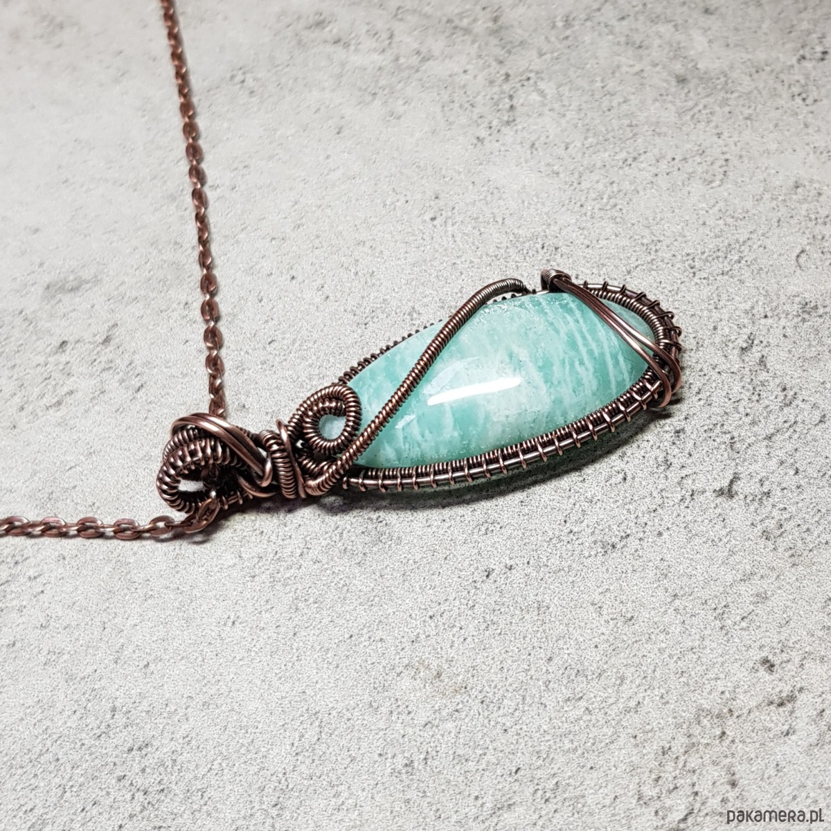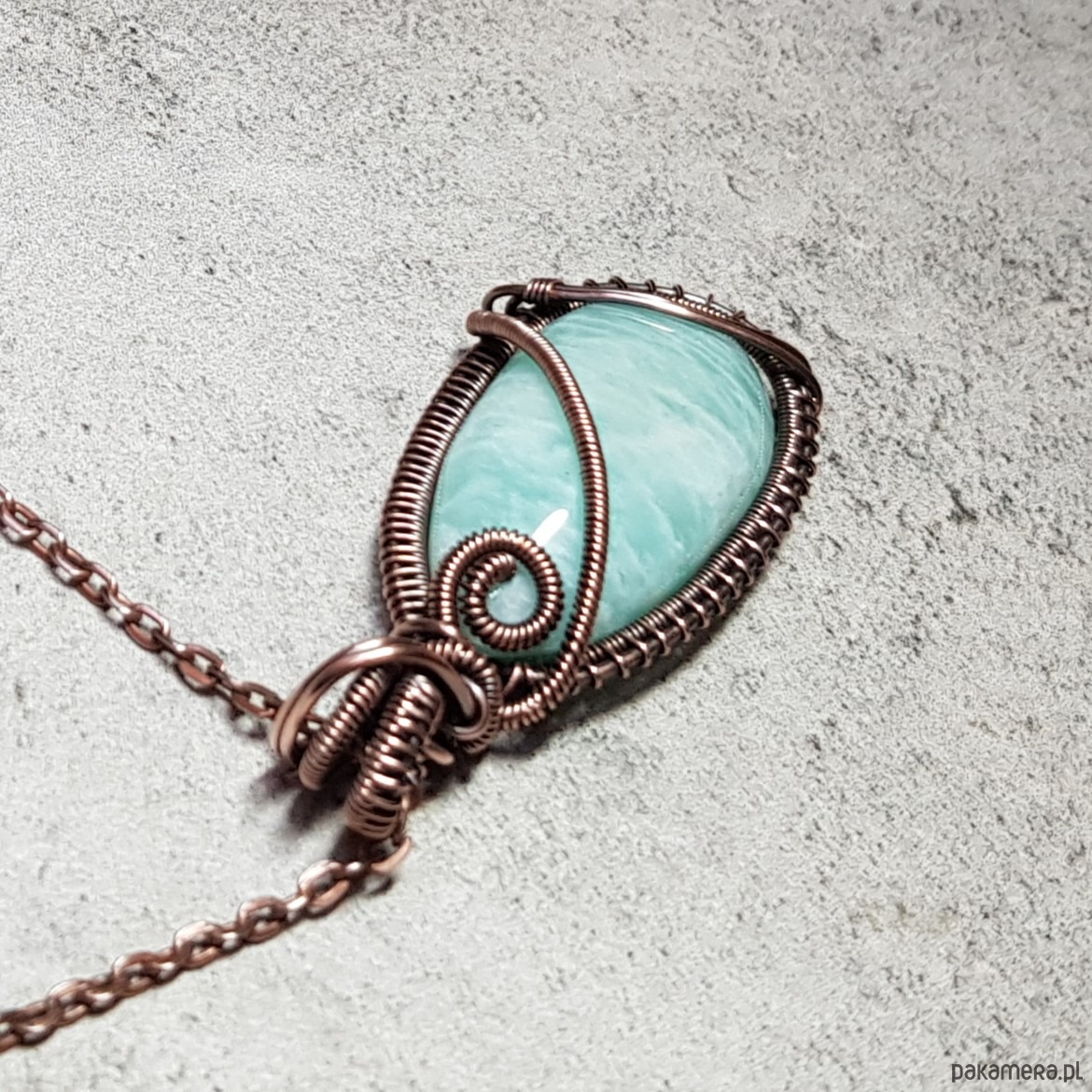 Zawieszka wykonana ręcznie metodą wire-wrappingu której głównym elementem jest naturalny amazonit. Do wykonania wisiorka użyłam drutu z miedzi, następnie zaoksydowałam i wypolerowałam w celu uzyskania szlachetnego efektu postarzenia. Wymiary zawieszki 54x24mm z łańcuszkiem długości około 48-50 cm.