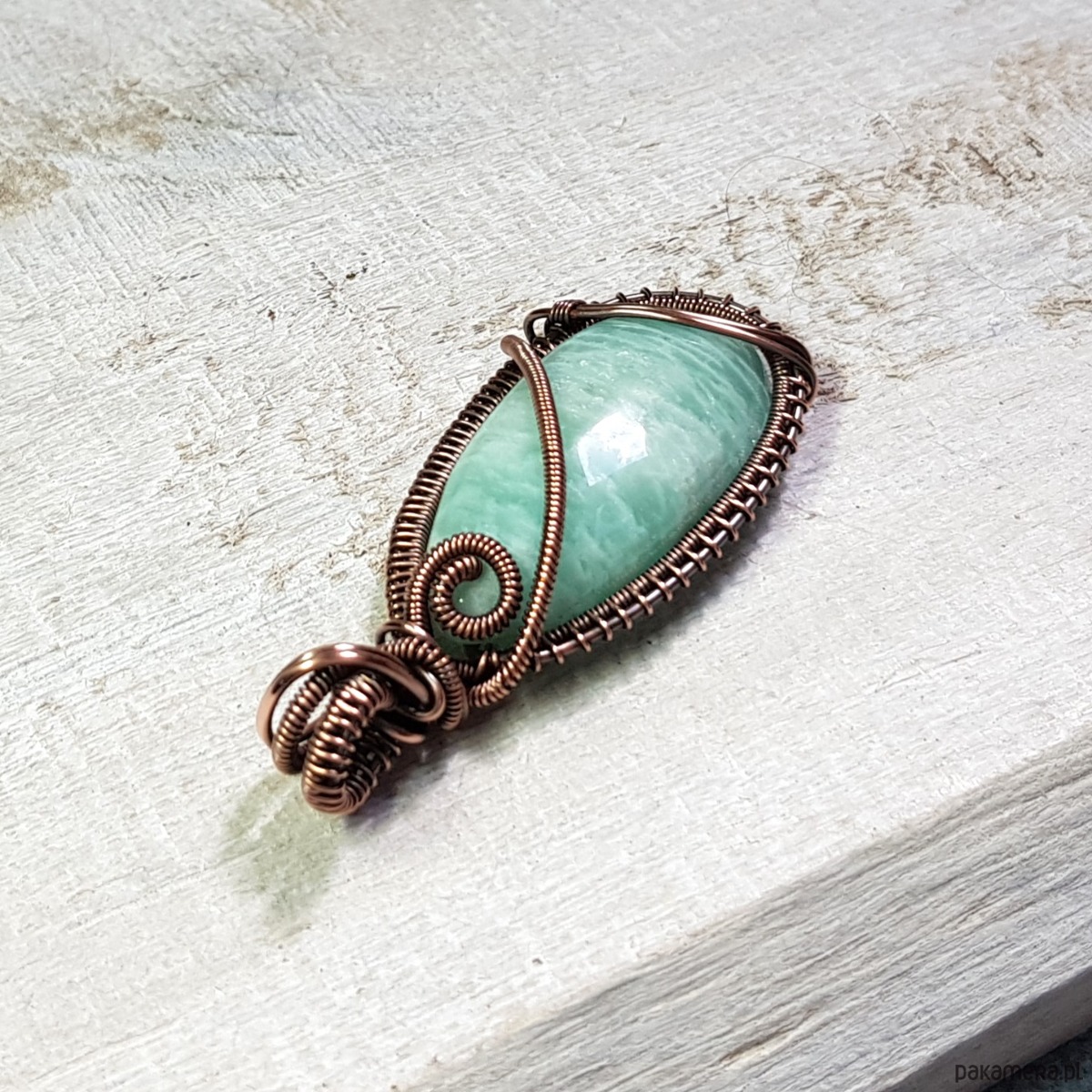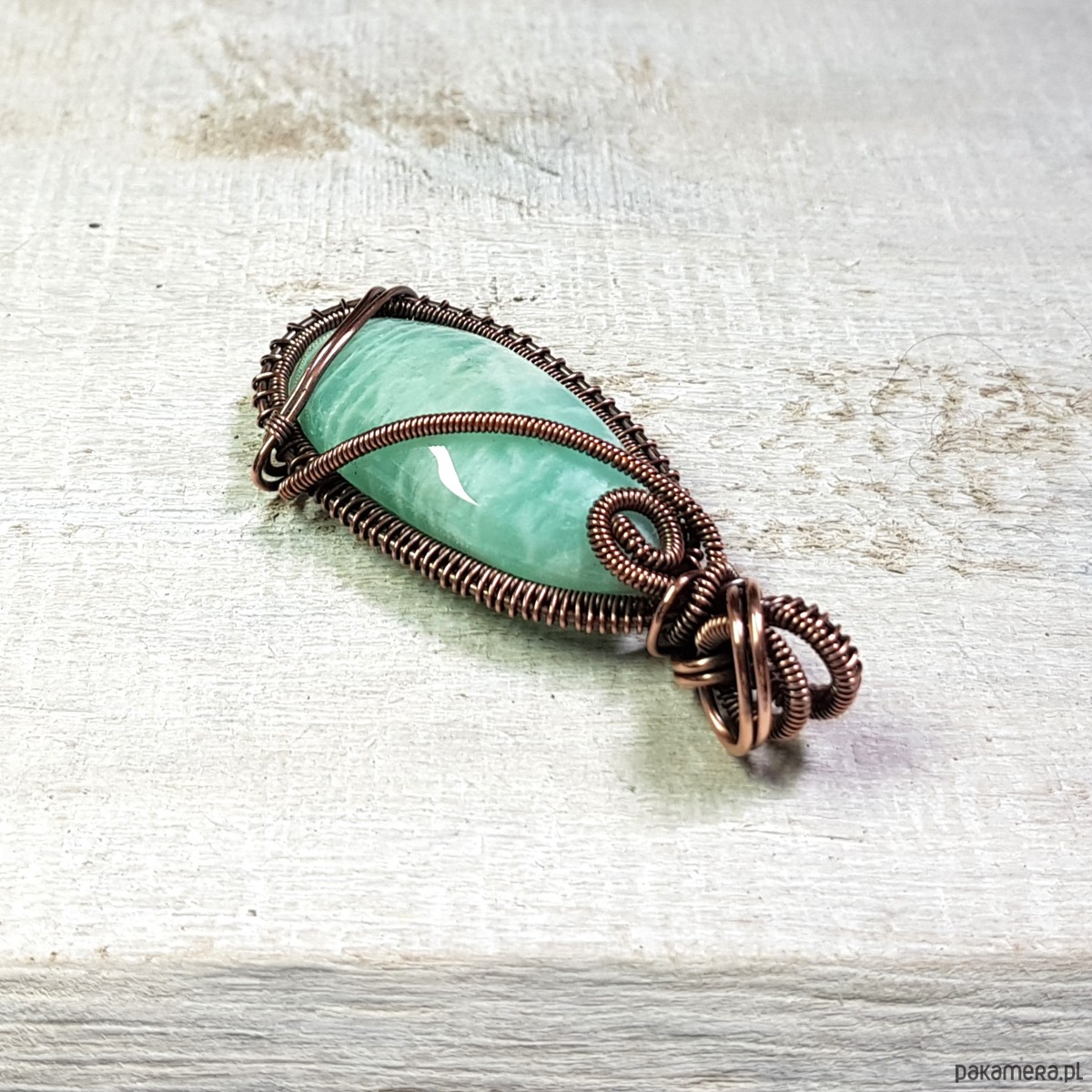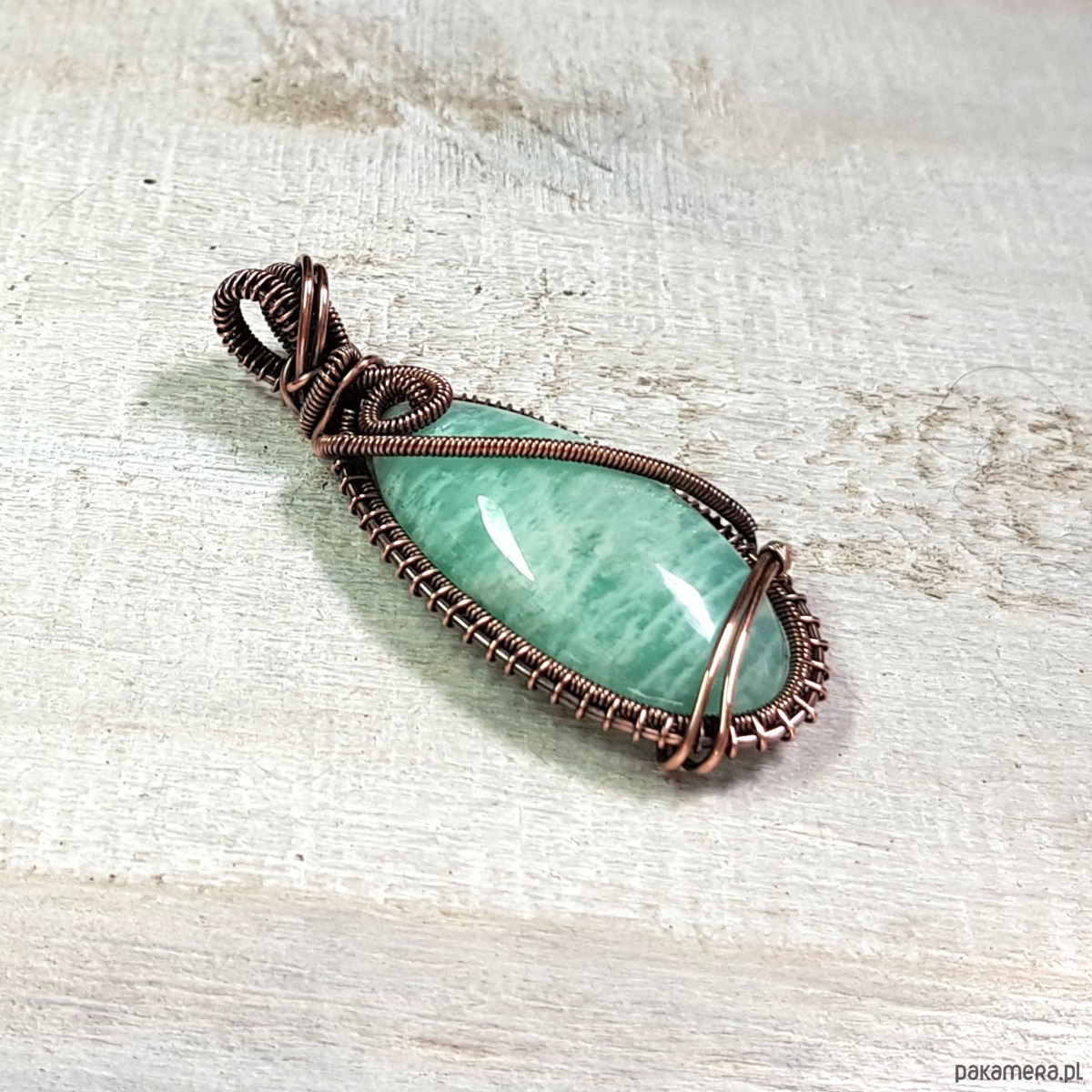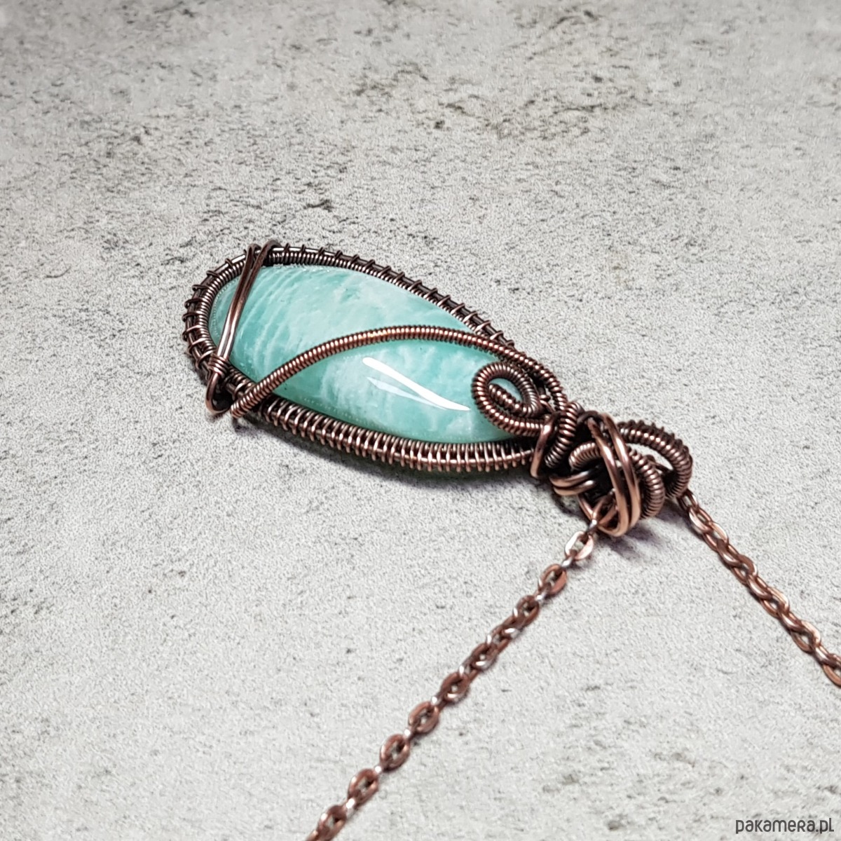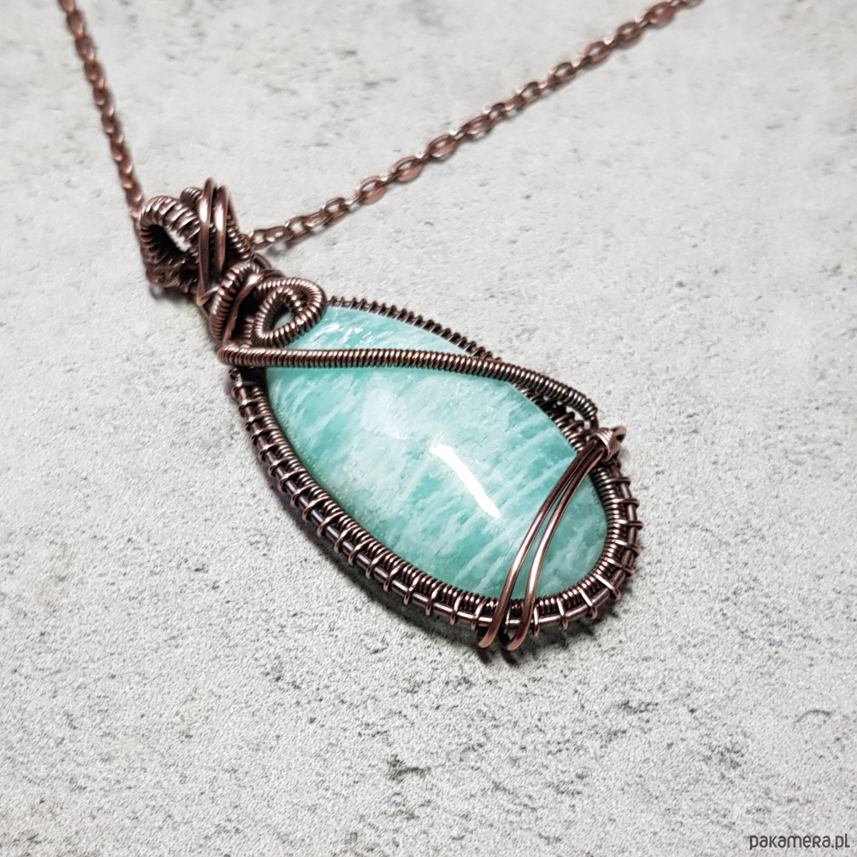 Zawieszka wykonana ręcznie metodą wire-wrappingu której głównym elementem jest naturalny amazonit. Do wykonania wisiorka użyłam drutu z miedzi, następnie zaoksydowałam i wypolerowałam w celu uzyskania szlachetnego efektu postarzenia. Wymiary zawieszki 54x24mm z łańcuszkiem długości około 48-50 cm.