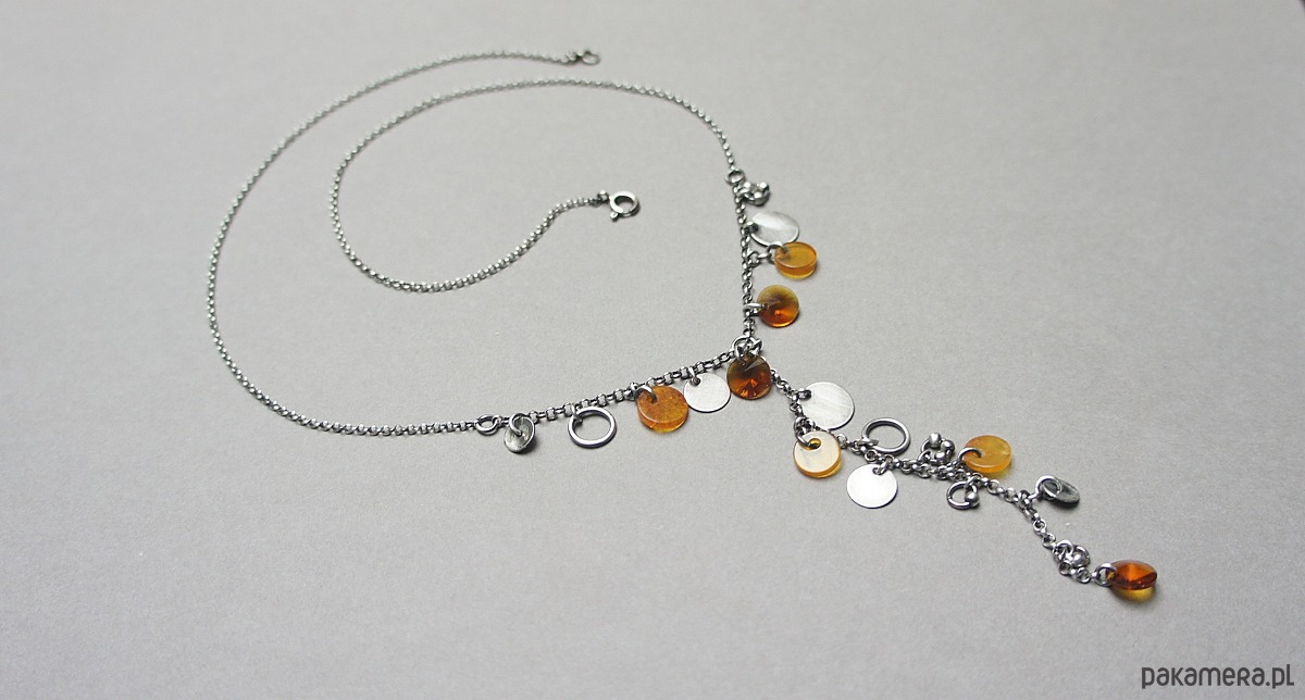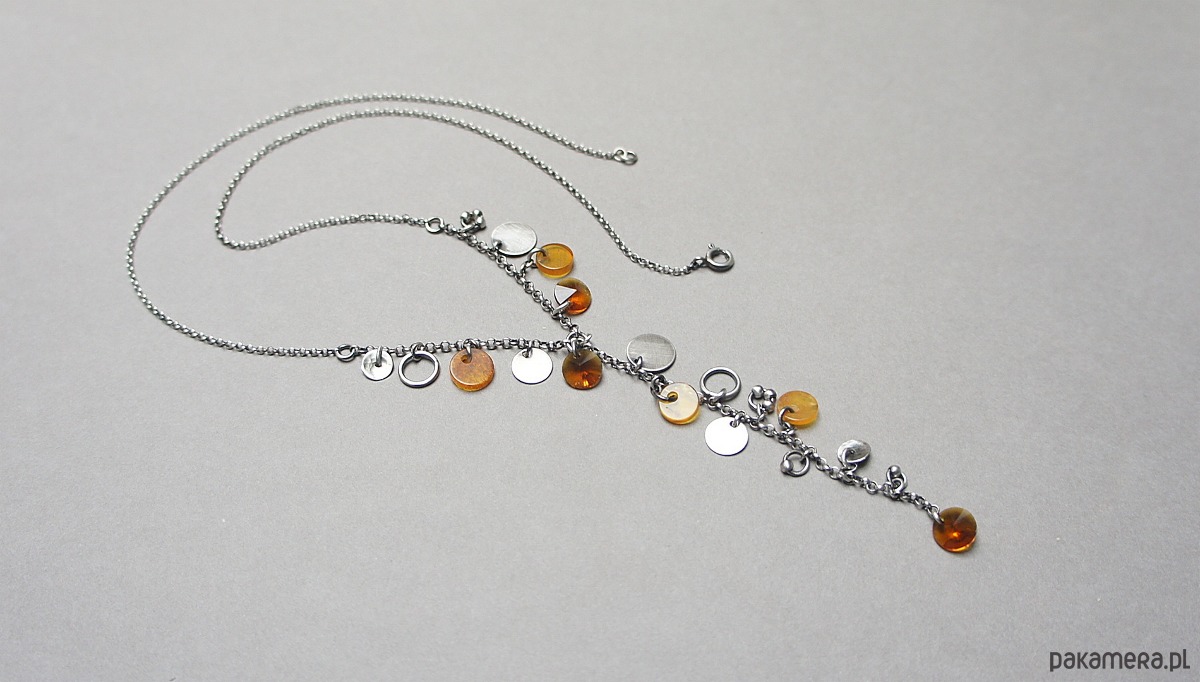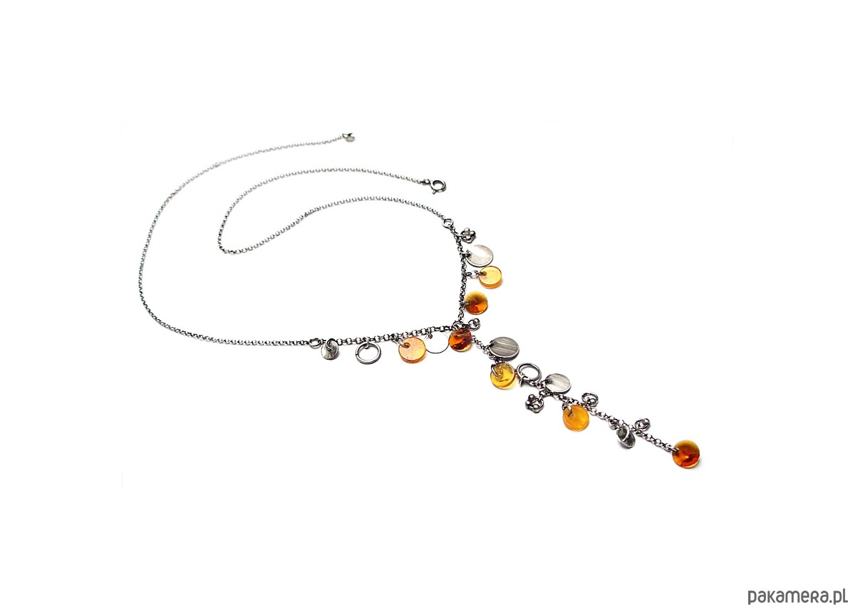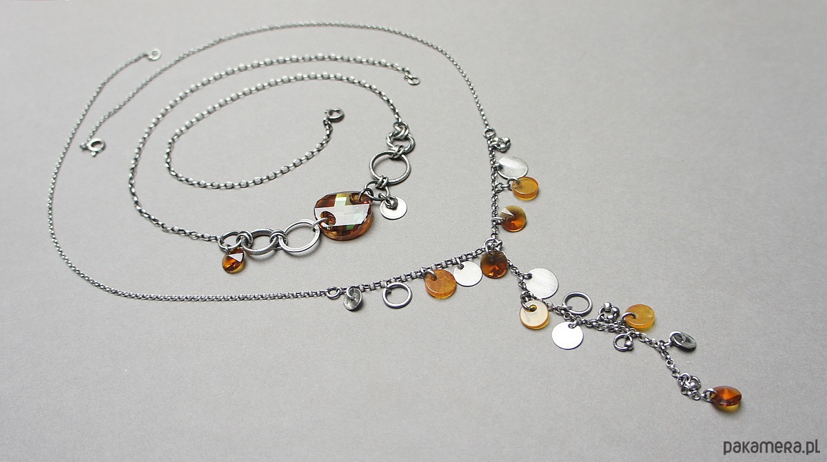 Naszyjnik wykonany ze srebra [pr. 925] w połączeniu z pastylkami bursztynów [7-9mm], kryształkami [8mm] oraz srebrnymi blaszkami, ogniwami i imitacjami monet. Srebro oksydowane i przetarte. Całkowita długość naszyjnika 42,5cm. Długość części wiszącej 9cm. Biżuteria ozdobnie zapakowana