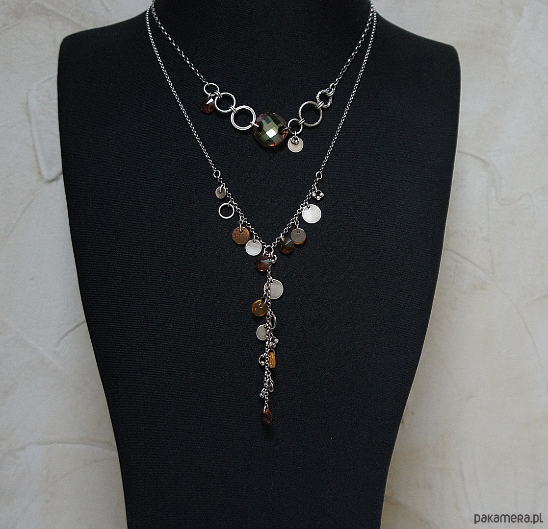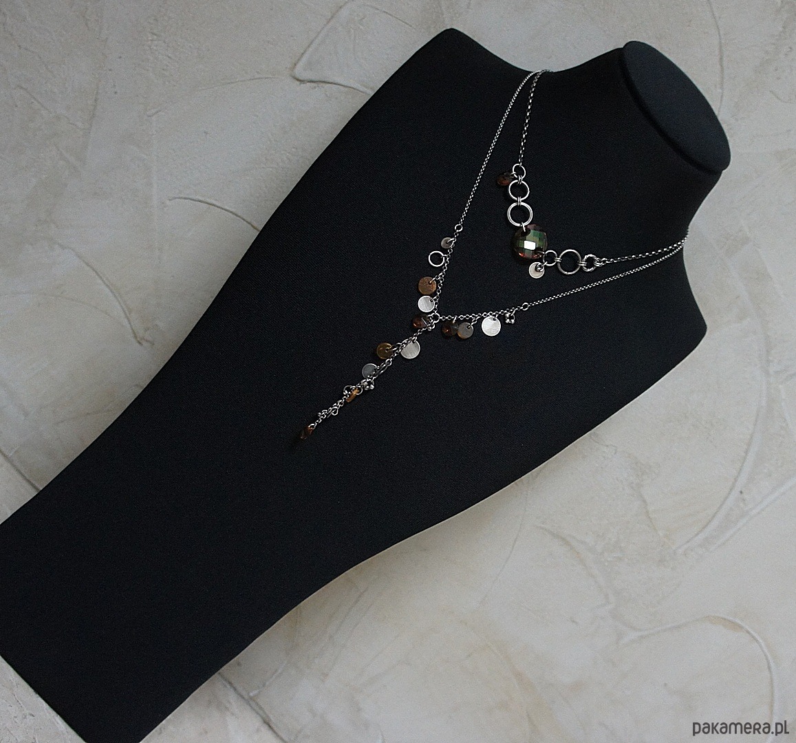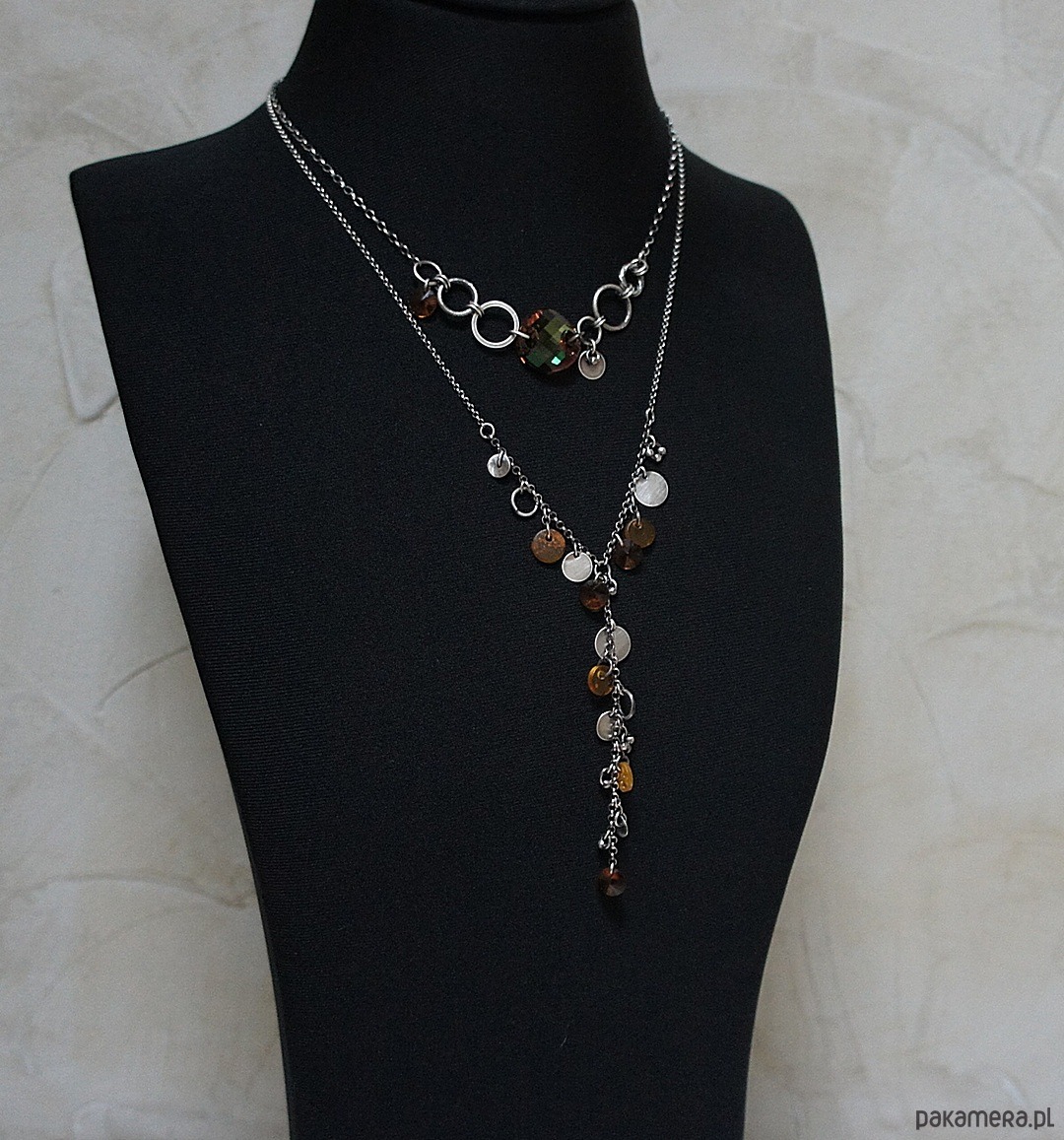 Naszyjnik wykonany ze srebra [pr. 925] w połączeniu z pastylkami bursztynów [7-9mm], kryształkami [8mm] oraz srebrnymi blaszkami, ogniwami i imitacjami monet. Srebro oksydowane i przetarte. Całkowita długość naszyjnika 42,5cm. Długość części wiszącej 9cm. Biżuteria ozdobnie zapakowana