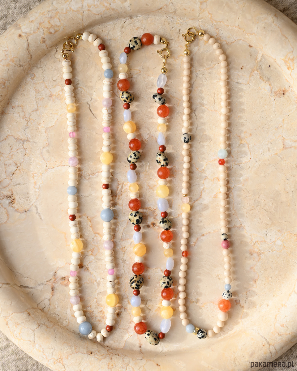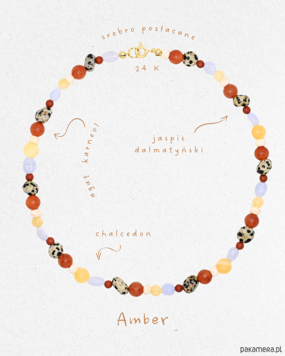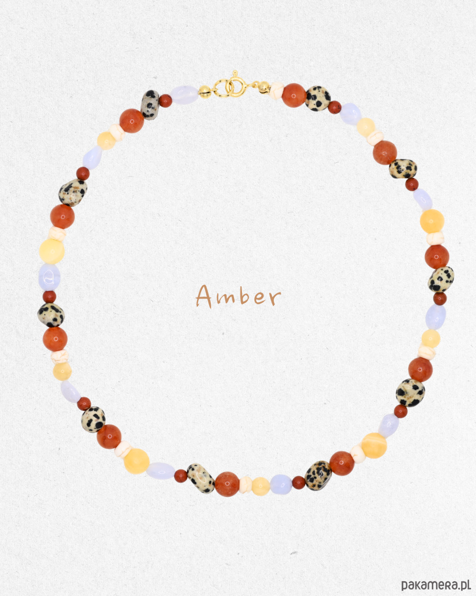 Amber to naszyjnik inspirowany wiosennym światłem i naturalną harmonią kolorów. Subtelna, ale wyrazista kompozycja kamieni przywodzi na myśl pierwsze ciepłe dni i budzącą się do życia naturę.