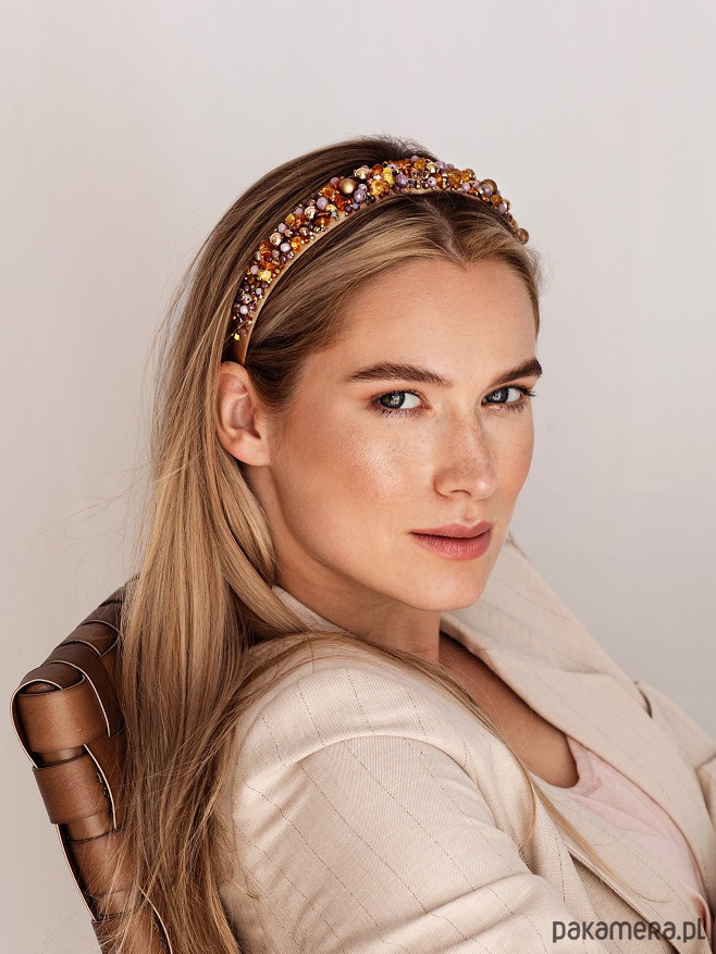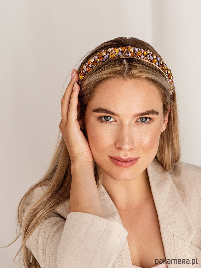 Model "Amber Swan". Opaska w odcieniach fioletu, bursztynu, cynamonu i złota.