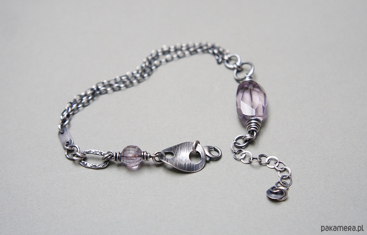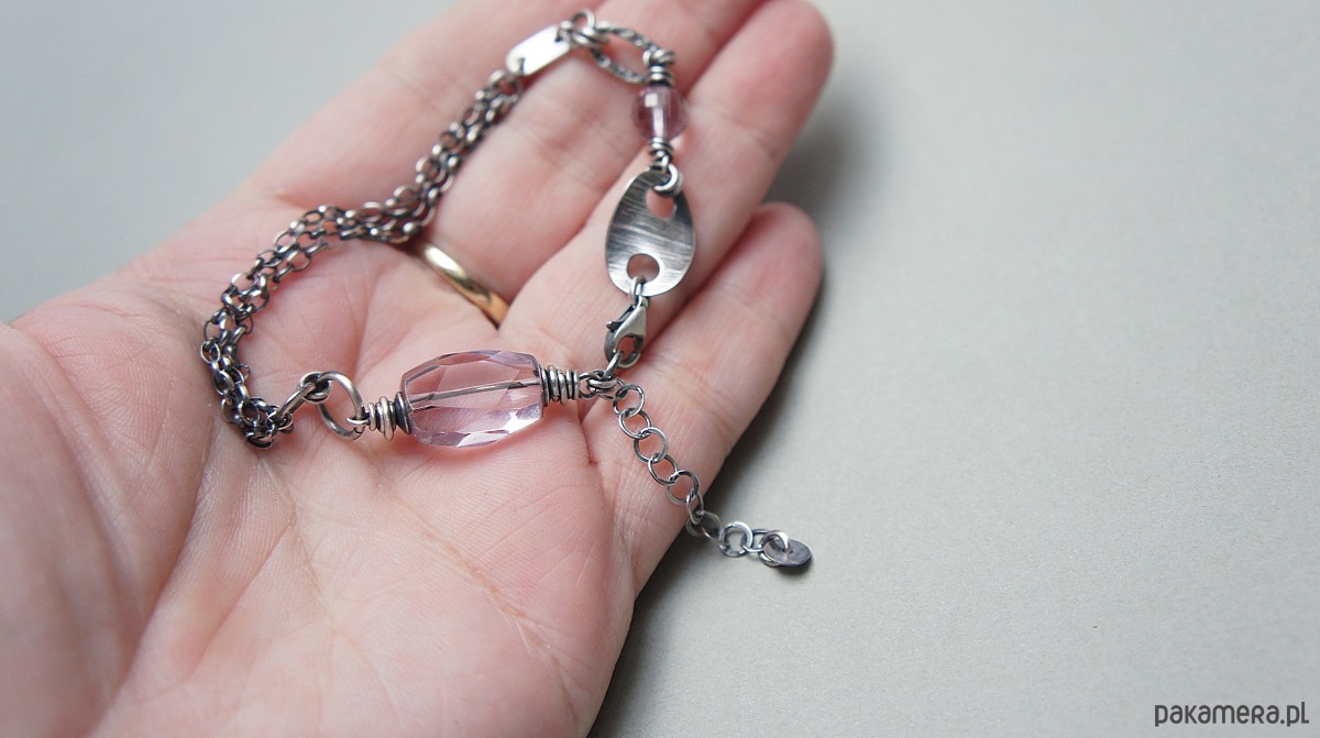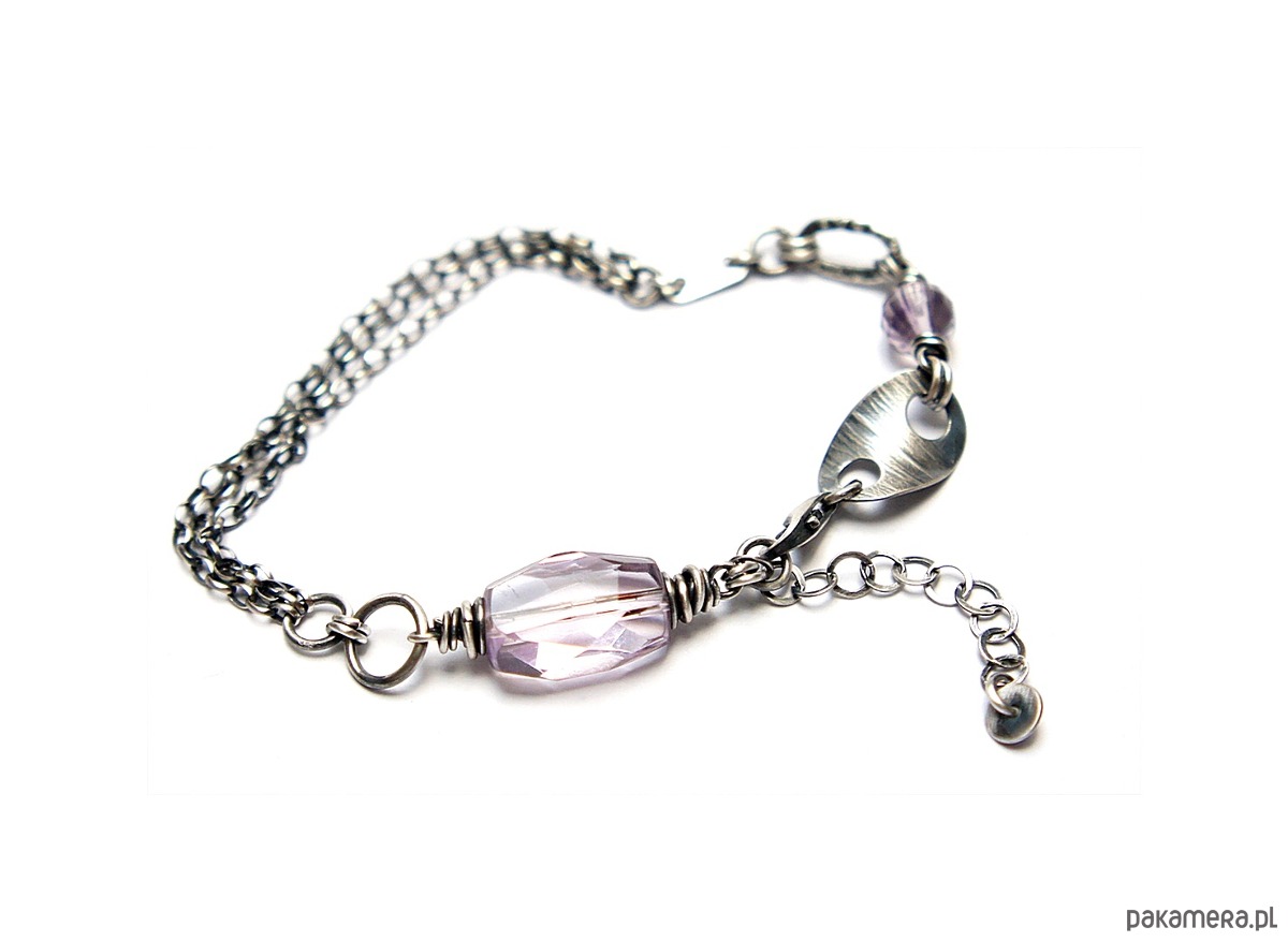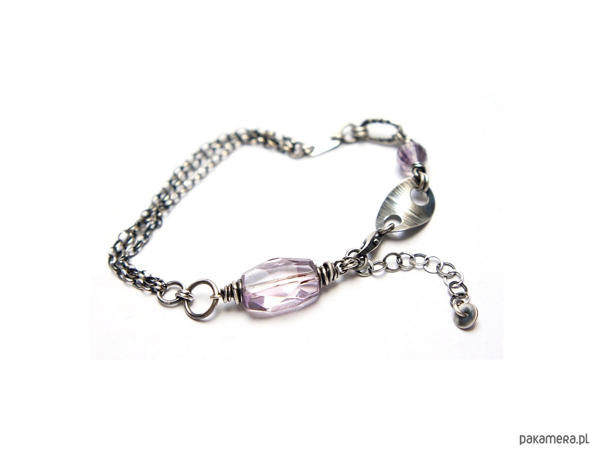 Bransoletka wykonana ze srebra [pr. 925] w połączeniu z wysokiej jakości ciosaną bryłką ametrynu [16mm x 10mm], fasetowana kuleczka ametrynu [8mm]. Całość oksydowana i przetarta. Całkowita długość bransoletki 20cm plus ozdobna przedłużka. Biżuteria ozdobnie zapakowana. Do kompletu można dokupić naszyjnik i kolczyki.