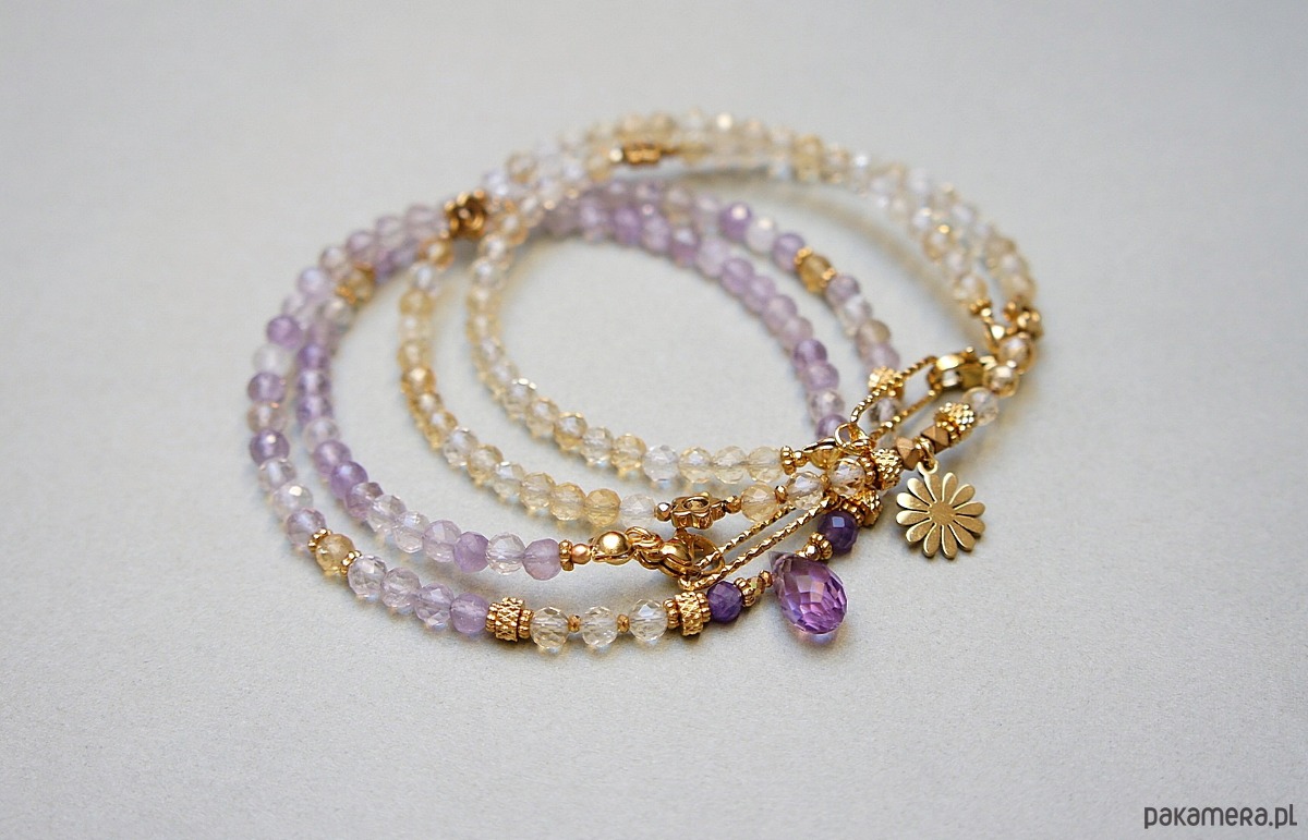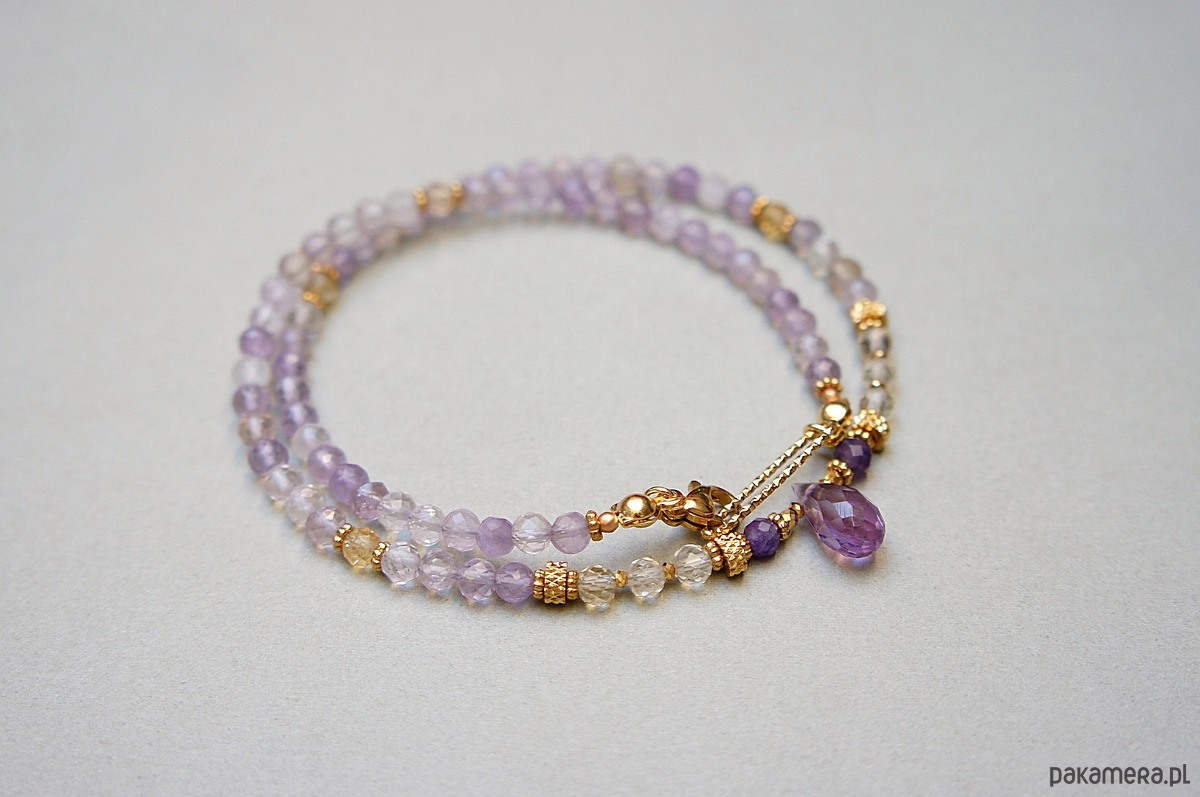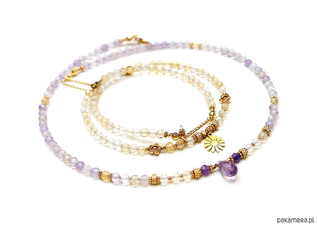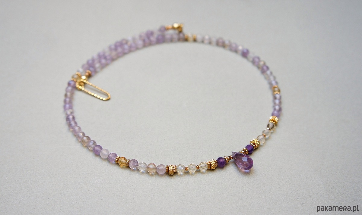 Krótki, delikatny naszyjnik wykonany w całości z pozłacanej stali szlachetnej oraz naturalnych, szlachetnych kamieni - ametryn fasetowany [4mm], cytryn fasetowany [4mm], ametyst fasetowany [3,5mm], hematyt fasetowany [2mm], przekładek z hematytu [1mm] oraz zawieszki z ametystu w kształcie fasetowanej brioletki. Naszyjnik o długości ok. 42cm.