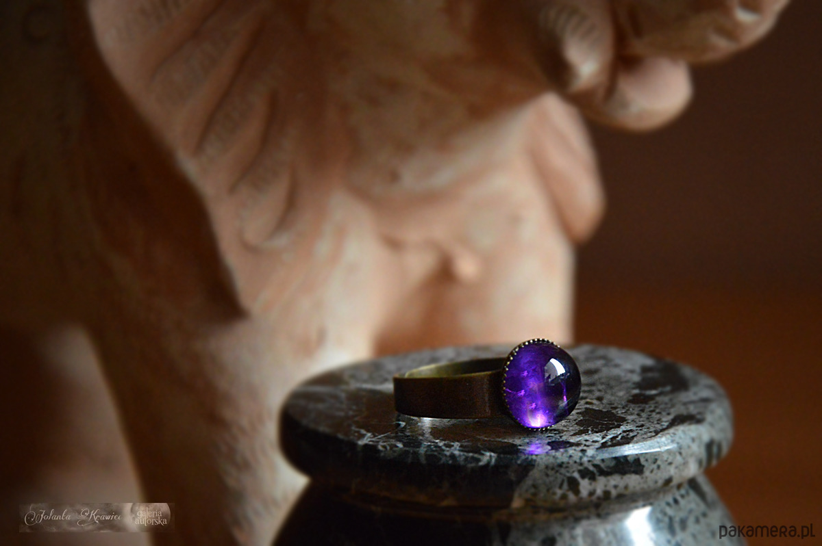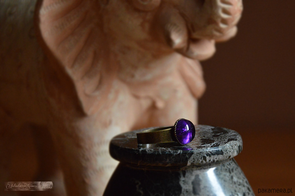 Pierścionek autorski z kolekcji w stylu vintage, wykonany z antycznego złota. Specjalny jubilerski stop miedzi i mosiądzu, nie zawiera kadmu, niklu ani ołowiu. W żaden sposób nie uczula. Kamień pierścionka, to Ametyst afrykański z Zairu klasy A. Kamień o wymiarach 10 mm.