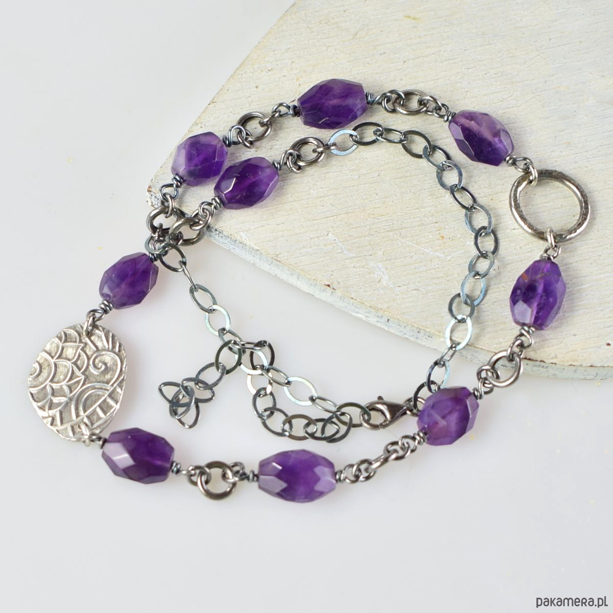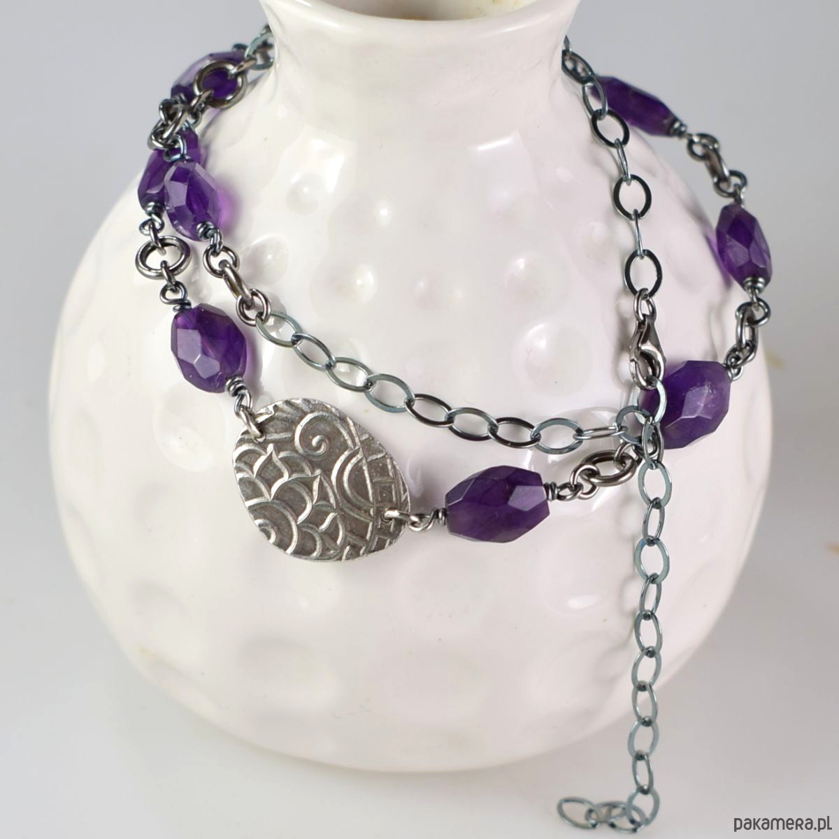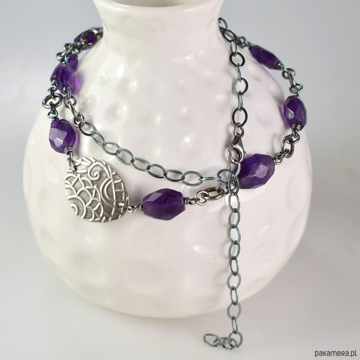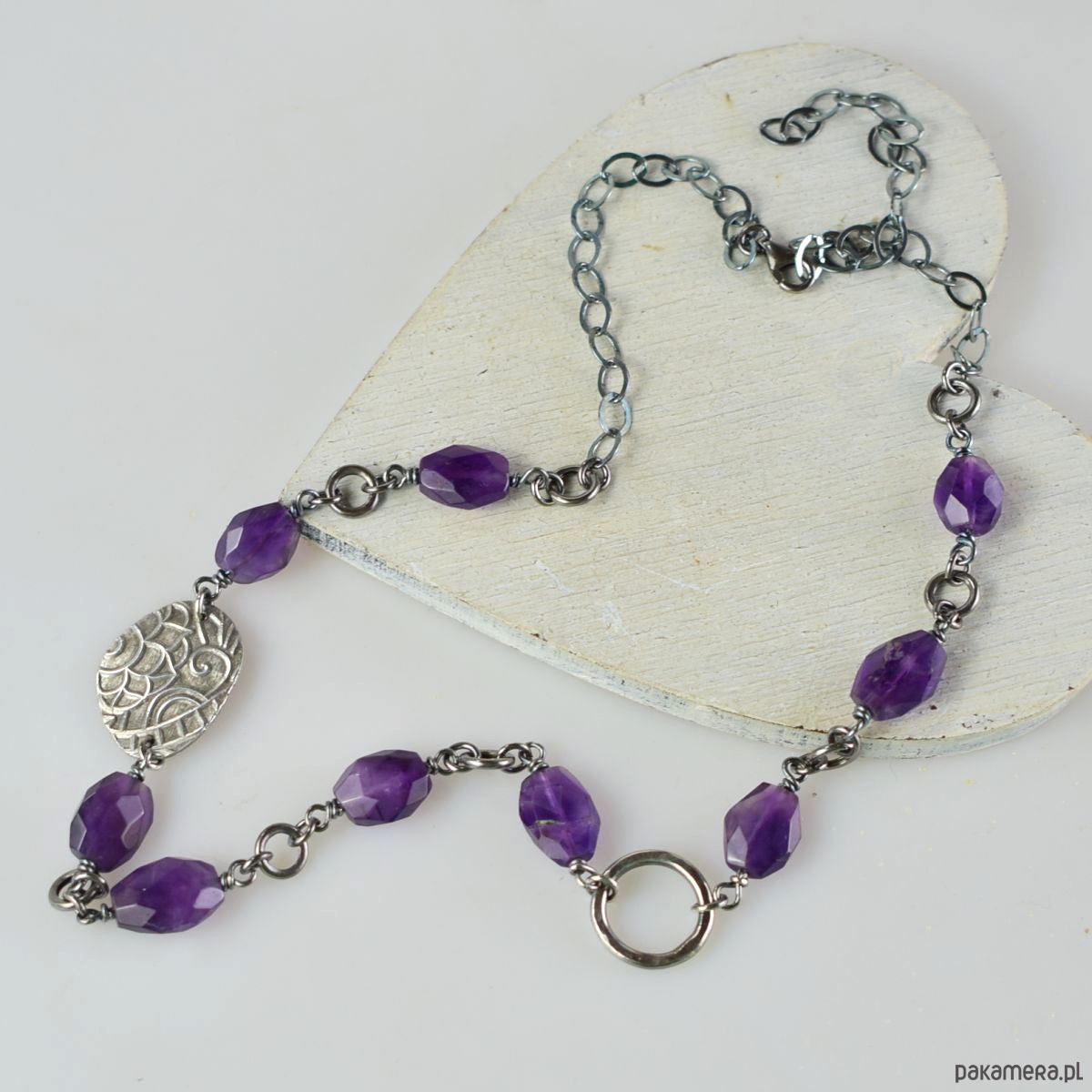 Naszyjnik wykonany w całości ze srebra (próba 925) oraz ametystu. Biżuteria została zoksydowana (przyciemniona) i wypolerowana. Długość całkowita 50 cm, wielkość srebrnego elementu ozdobnego 17 x 22 mm. Biżuteria zostanie ozdobnie zapakowana.