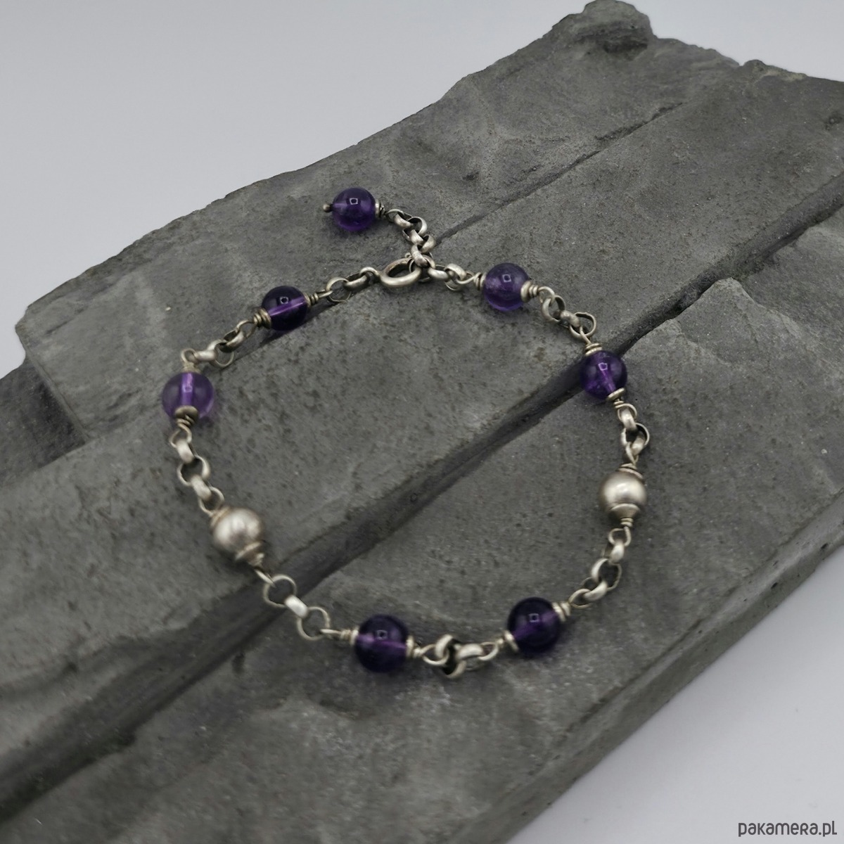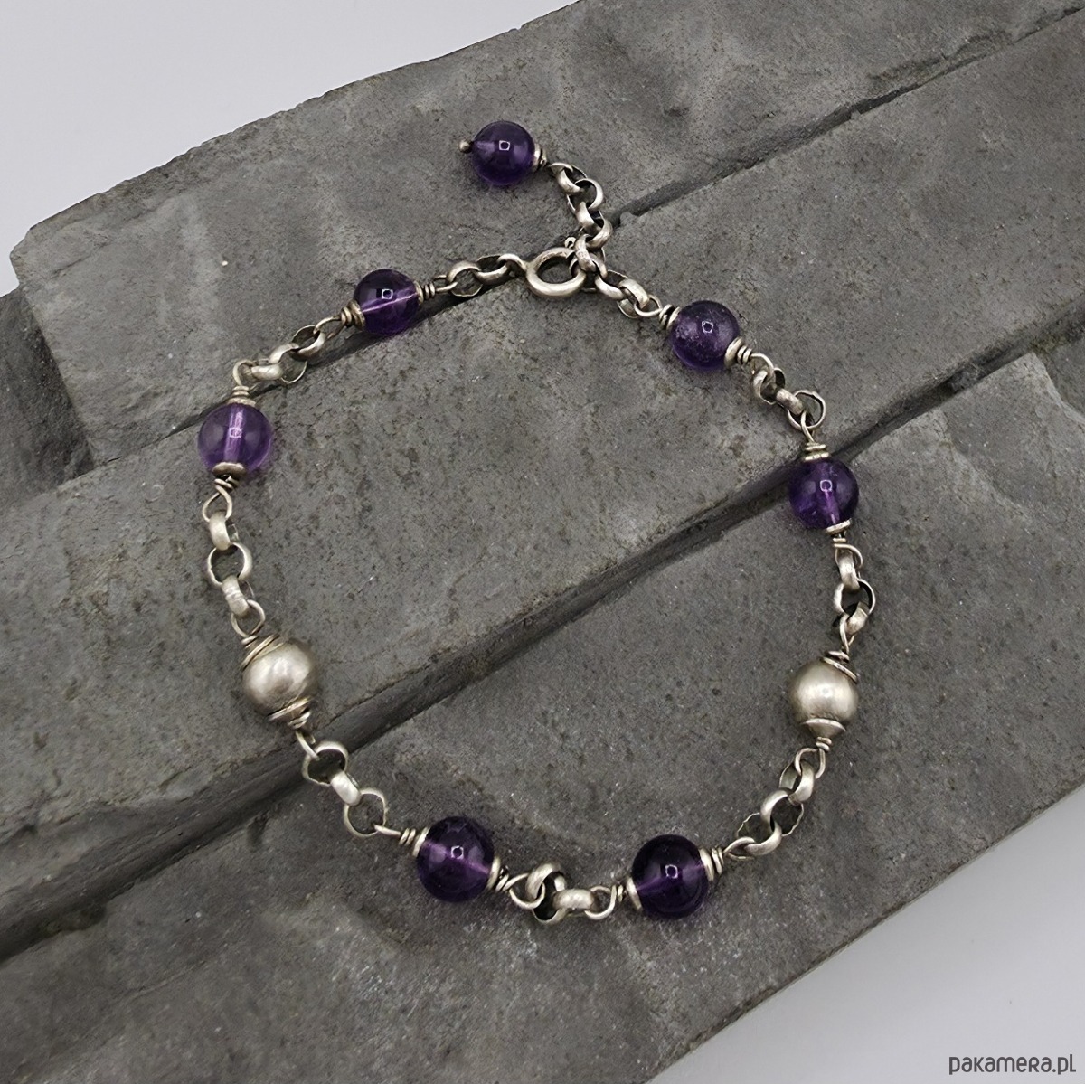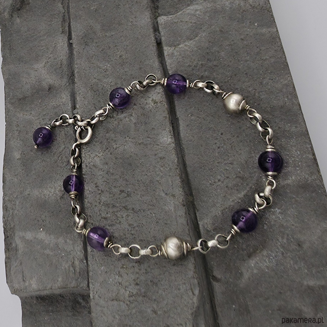 Kobieca i minimalistyczna bransoletka na co dzień i nie tylko. Wykonana w całości z oksydowanego srebra próby 925 oraz gładkich kulek ametystu wielkości ok. 6 mm. Całkowita długość bransoletki regulowana od 18,5 cm do 20,5 cm. W mojej galerii jest dostępny naszyjnik do kompletu. Ozdobnie zapakowana.
