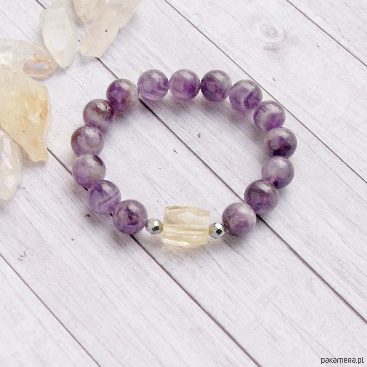 masywna, okazałą bransoletka na solidnej lince elastycznej, wykonana z kul ametystu (12mm) oraz bryłki cytrynu umieszczonej pomiędzy kuleczkami hematytu.