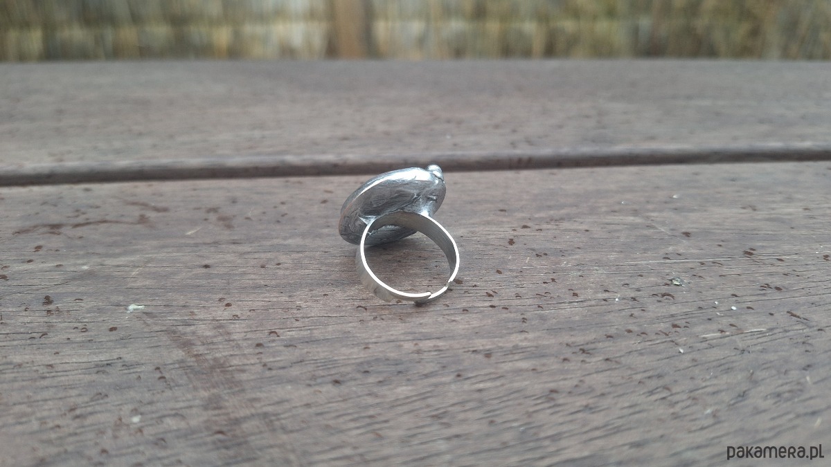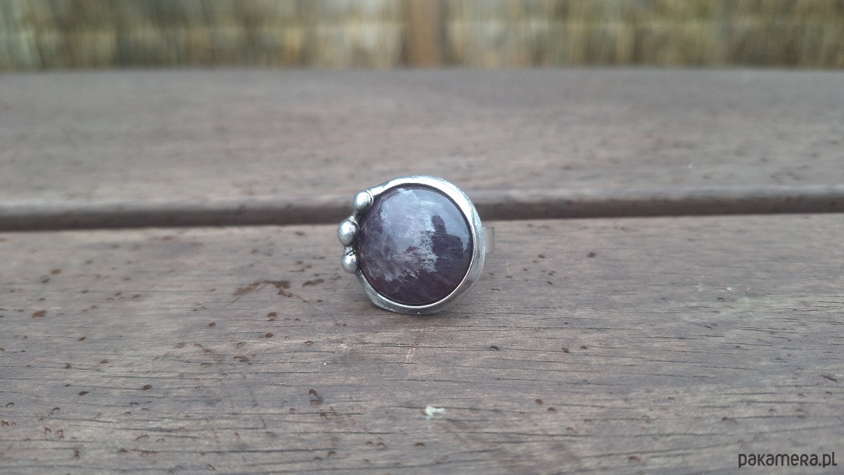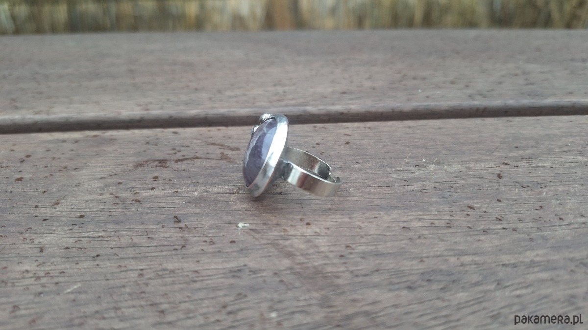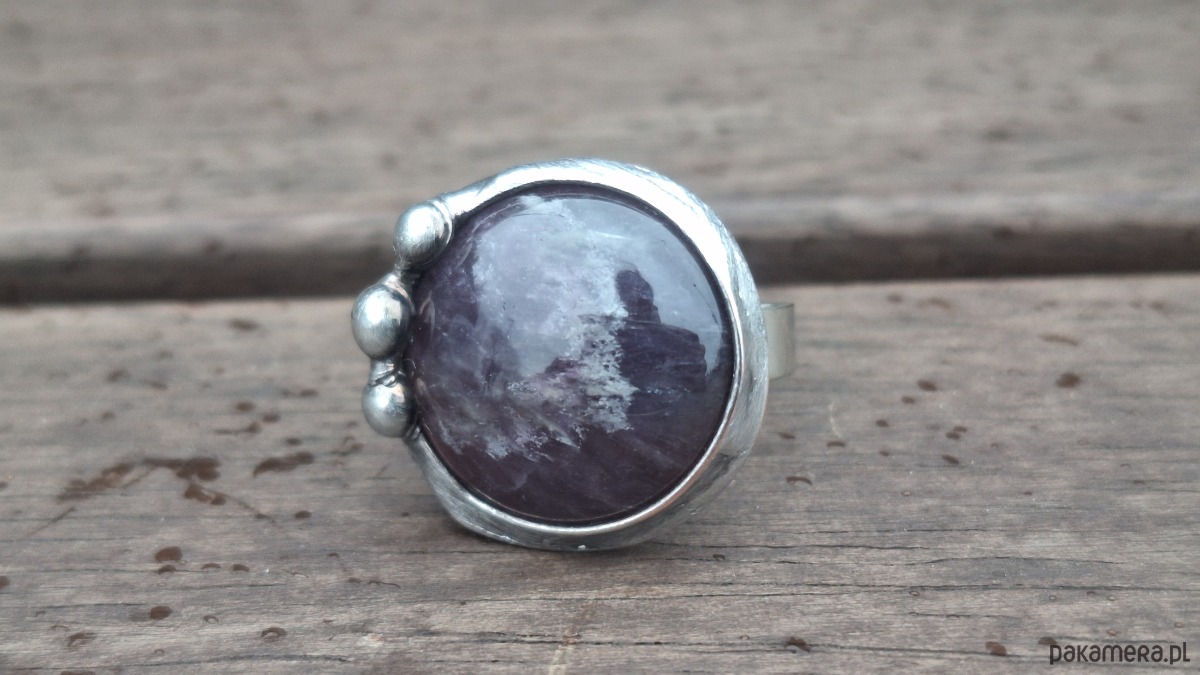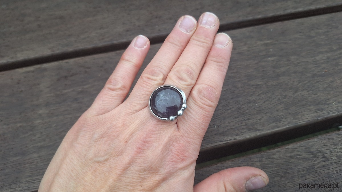 Pierścionek wykonany z miedzi, cyny i ametystu. Wymiary ok. 2 na 2 cm. Regulowany. Nie jest ciężki.