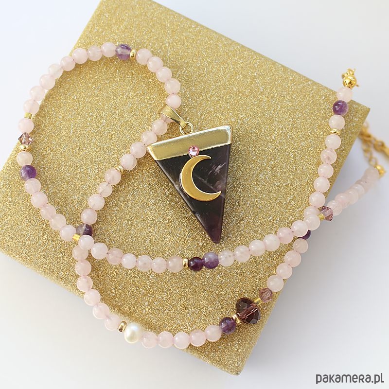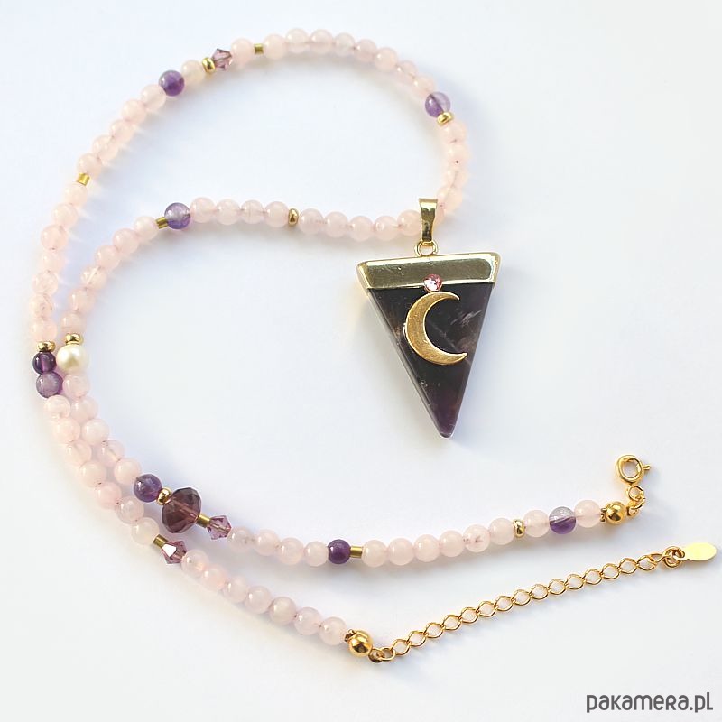 Elegancki, energetyczny choker z kwarcu różowego, ametystu, perły i kryształków wykonany ręcznie. Ozdobiony trójkątnym wisiorkiem z ametystem z efektownym księżycem ze srebra 925 pozłacanym 24k złotem i cyrkonią.