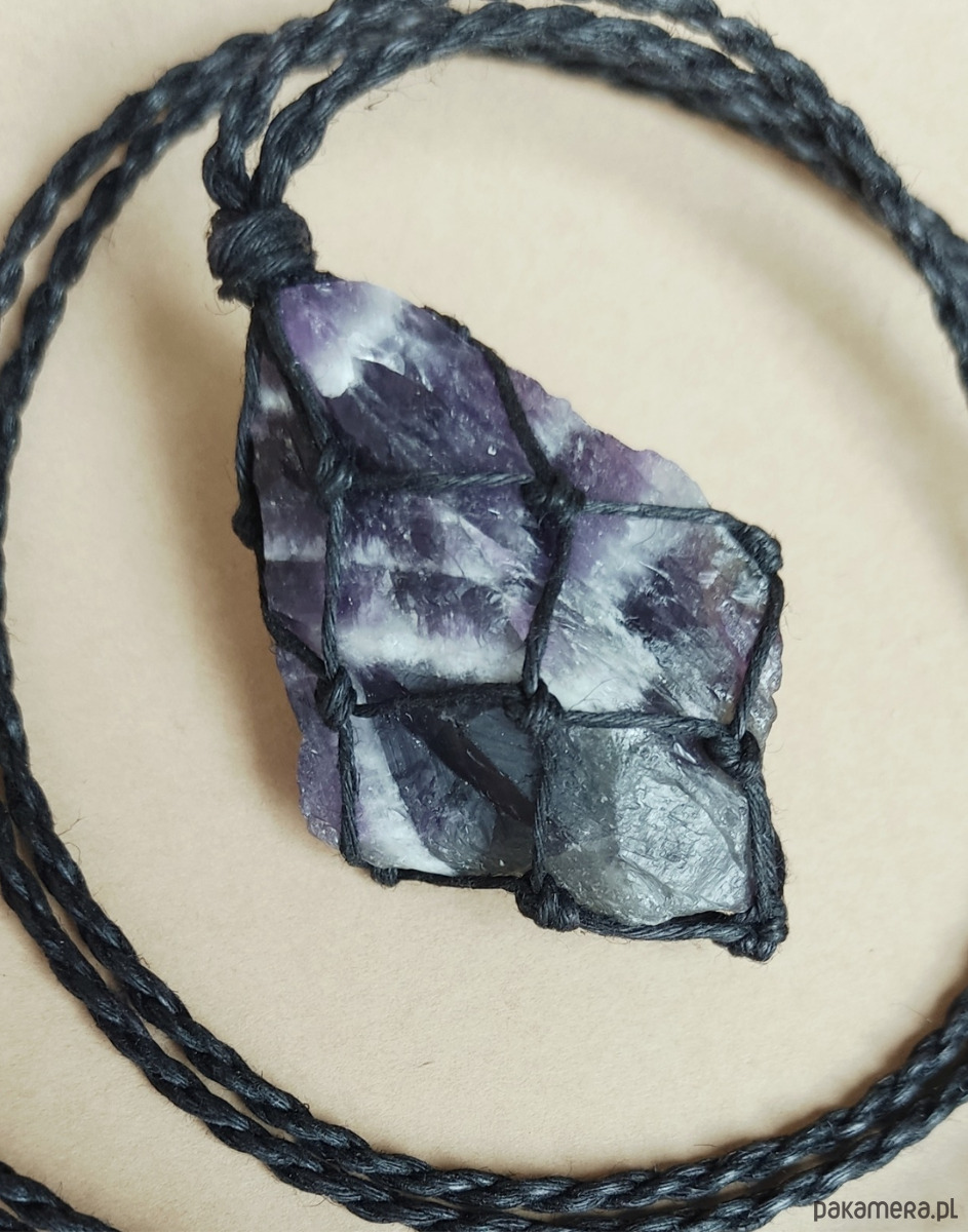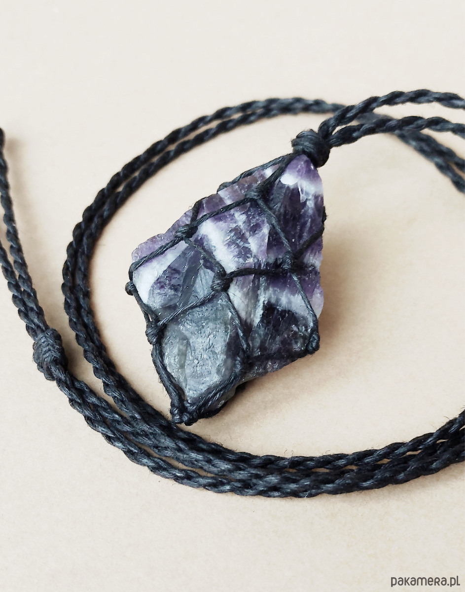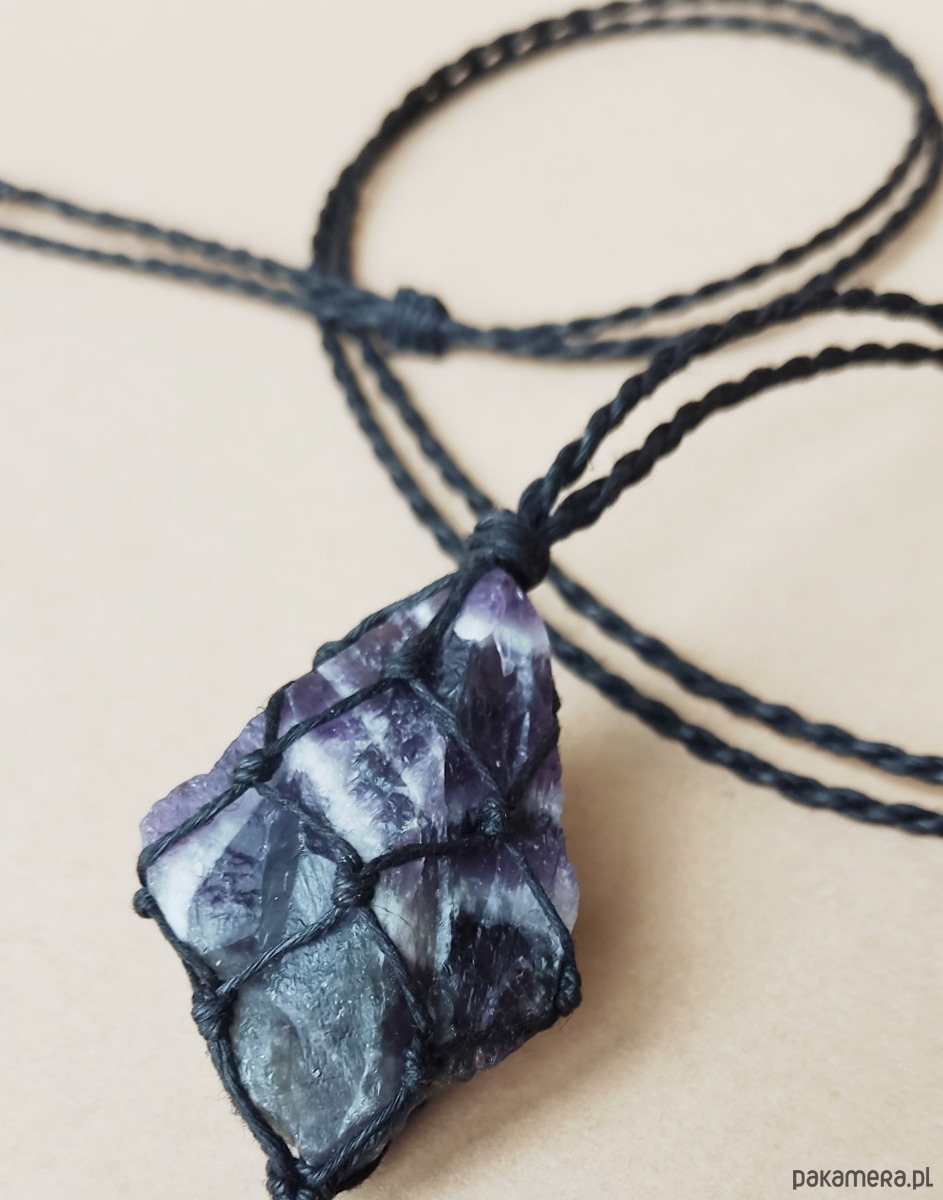 Naszyjnik z miękkiego sznurka lnianego z Ametystem. Kamień jest spory (5 cm) ale nie jest ciężki. Naszyjnik ma 51 cm długości i jest regulowany na całej długości.