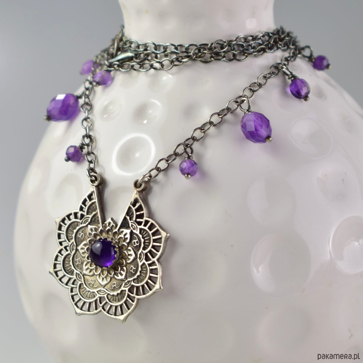 Naszyjnik wykonany w całości ze srebra (próba 925) oraz ametystu. Biżuteria została zoksydowana (przyciemniona) i wypolerowana. Długość całkowita 60 cm, szerokość wisiora 27 mm. Biżuteria zostanie ozdobnie zapakowana.