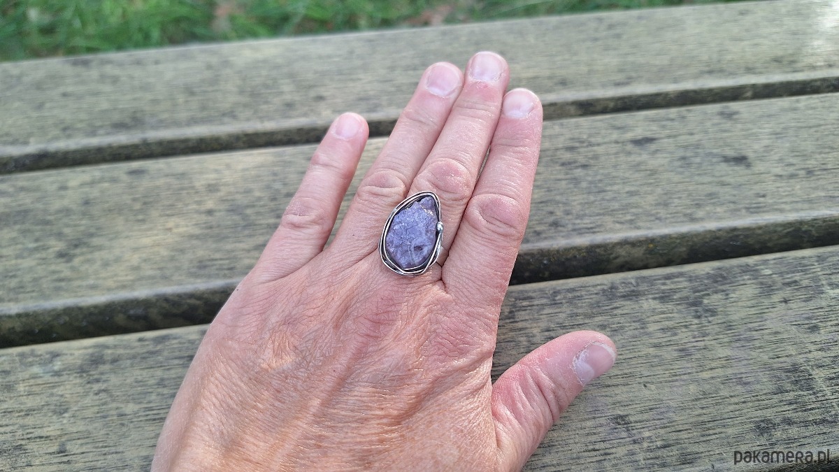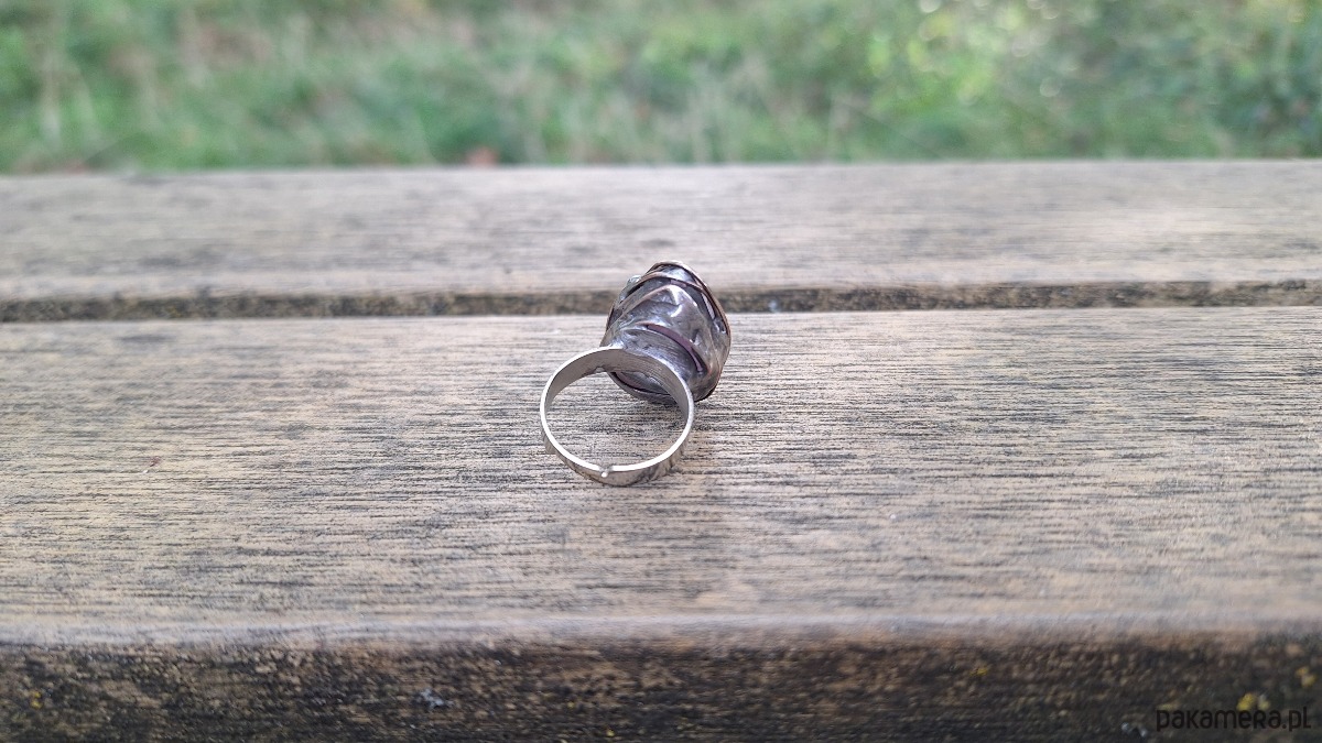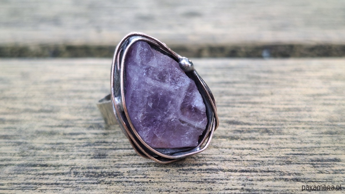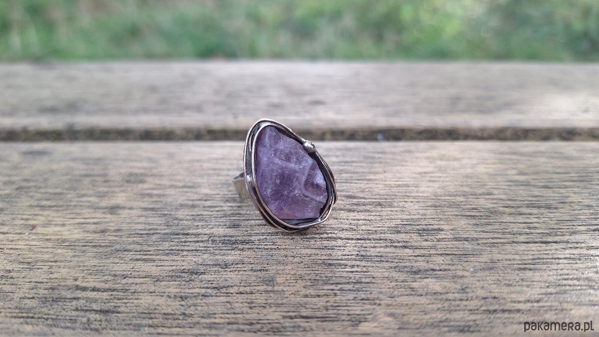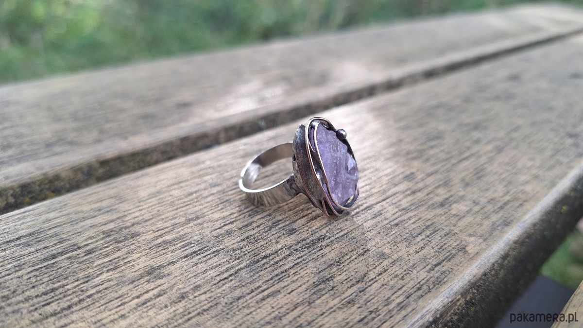 Pierścionek wykonany z miedzi, cyny i ametystu. Wymiary ok. 2.3 na 1.5 cm. Regulowany. Nie jest ciężki.