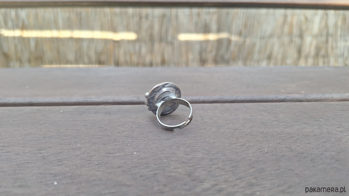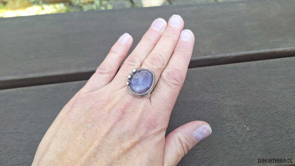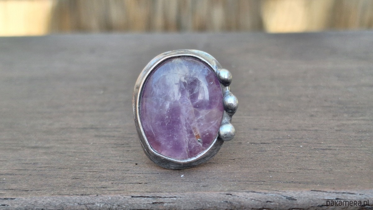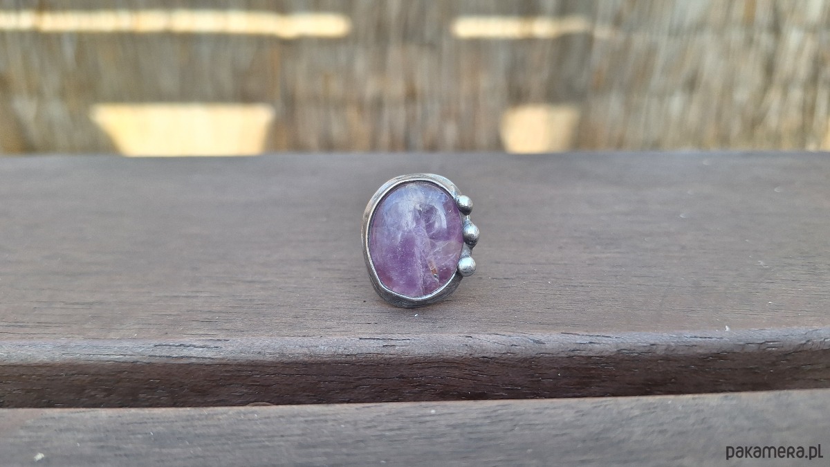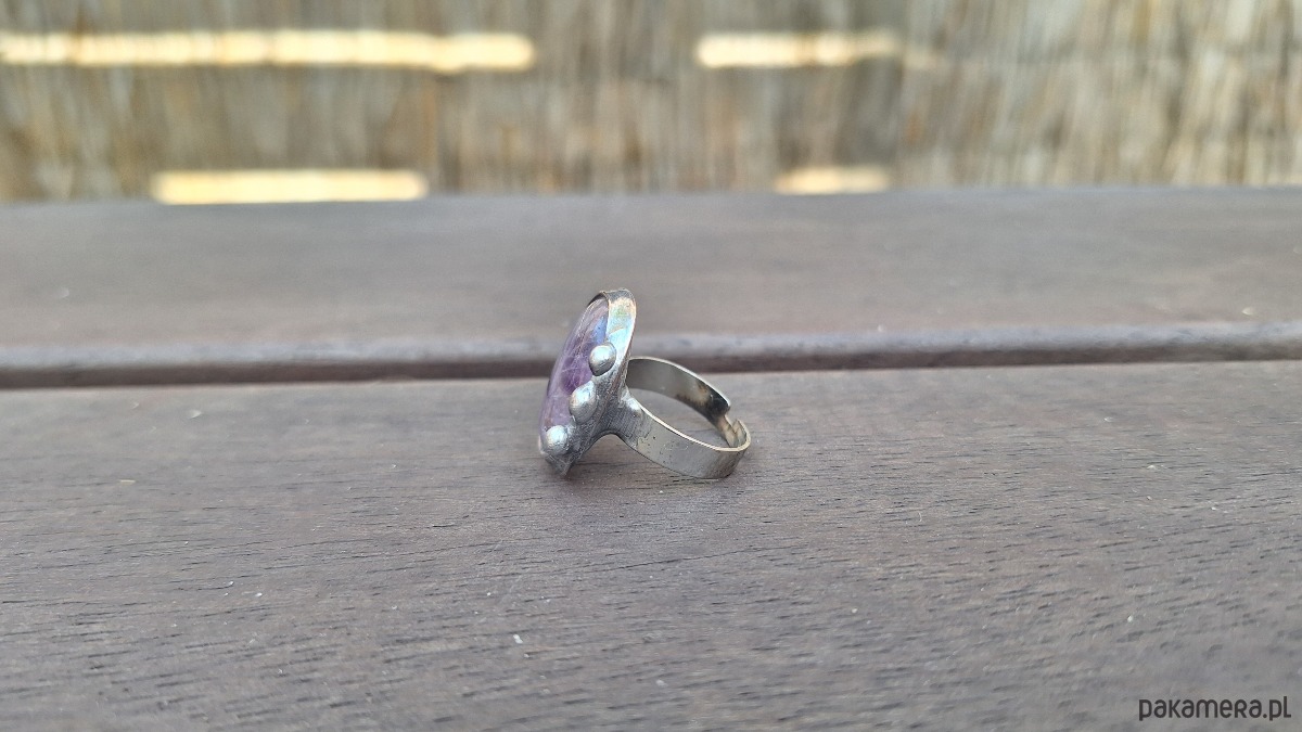 Pierścionek wykonany z miedzi, cyny i ametystu. Wymiary ok. 2.2 na 1.8 cm. Regulowany. Nie jest ciężki.