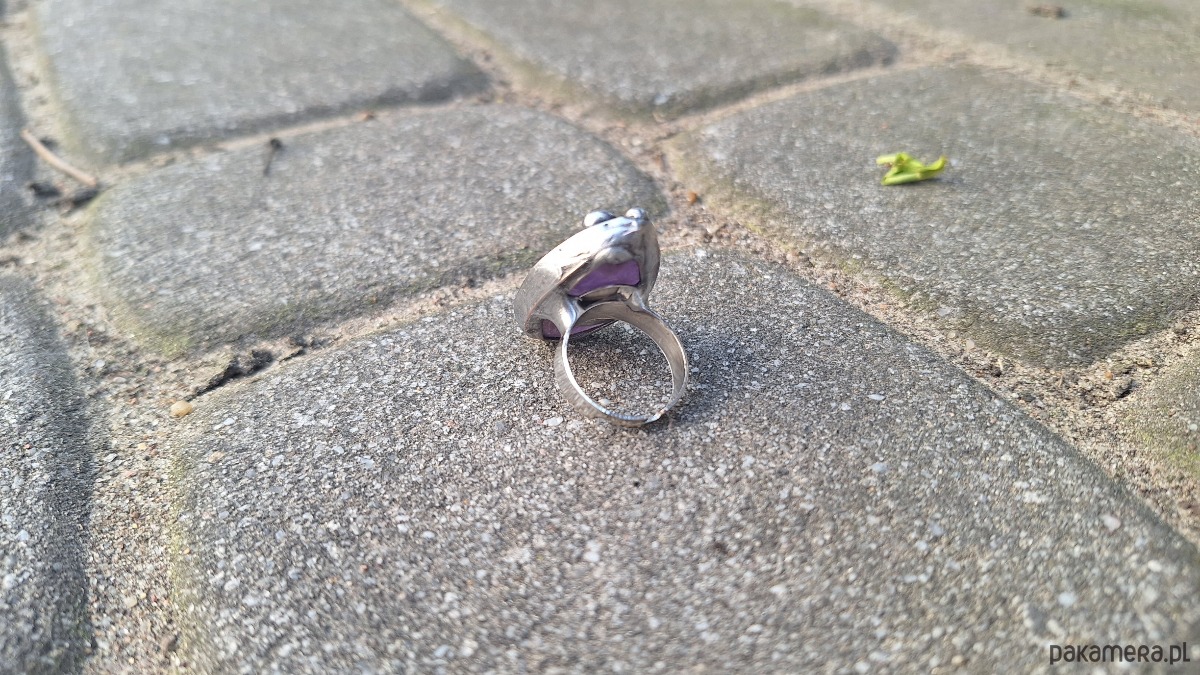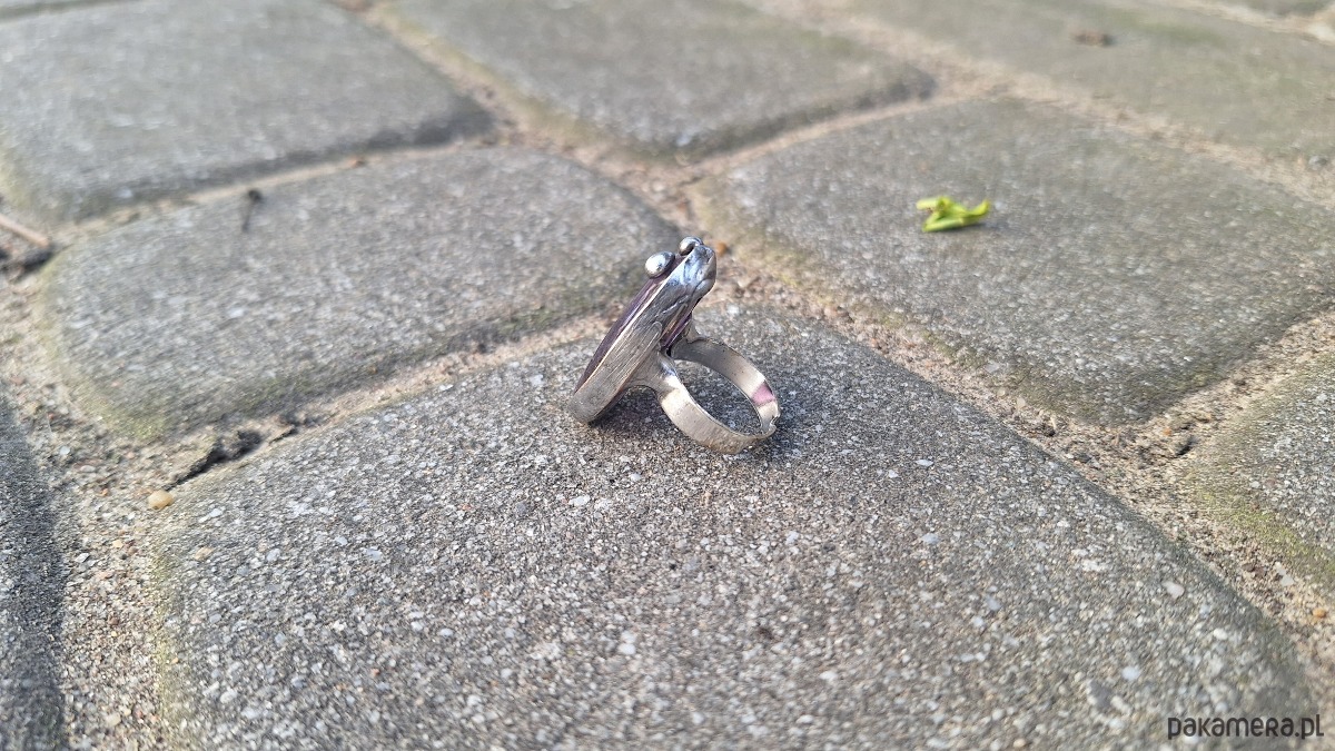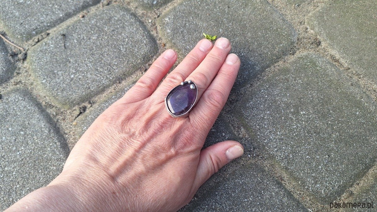 Pierścionek wykonany z miedzi, cyny i ametystu. Wymiary ok. 3 na 2 cm. Regulowany. Nie jest ciężki.