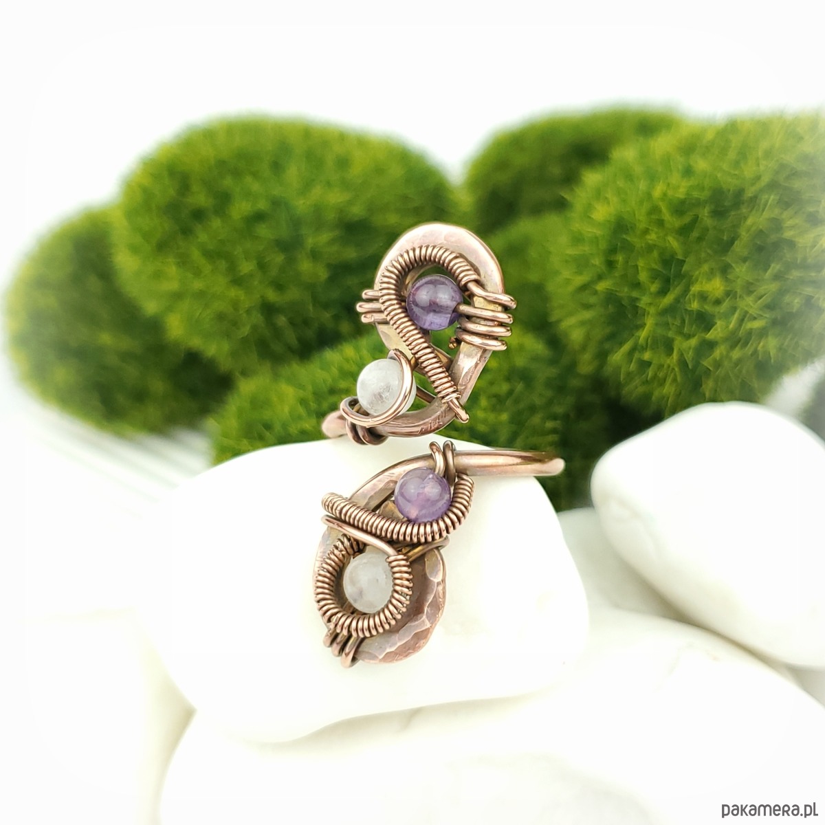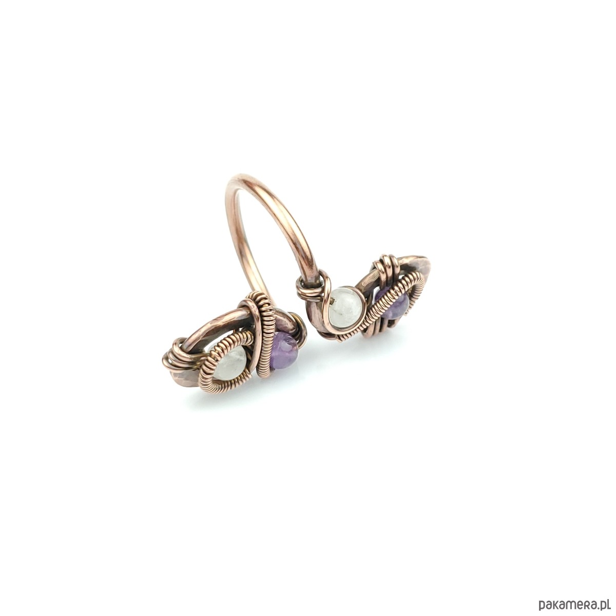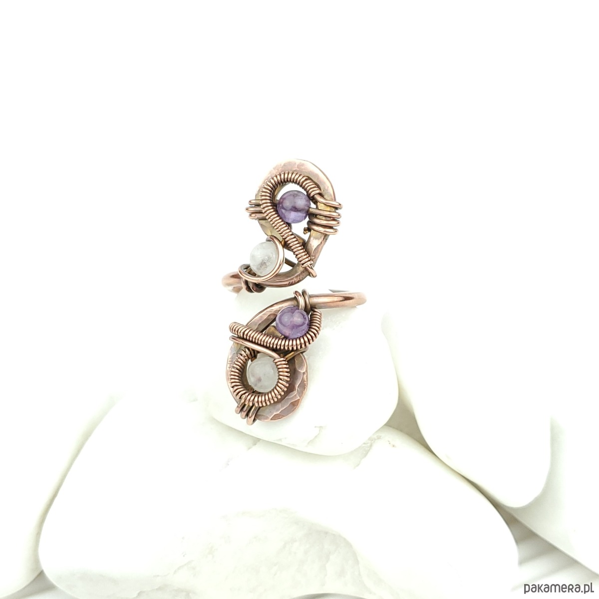 Pierścionek wykonany w pracochłonnej technice wire wrappingu. Obrączka gładka, góra wykonana z fakturowanej miedzi. W oplocie połyskują kamienie: ametyst i różowy kwarc. Pierścionek z małą regulacją - rozmiar optymalny 13 - 15 (obwód 53 mm -55 mm).