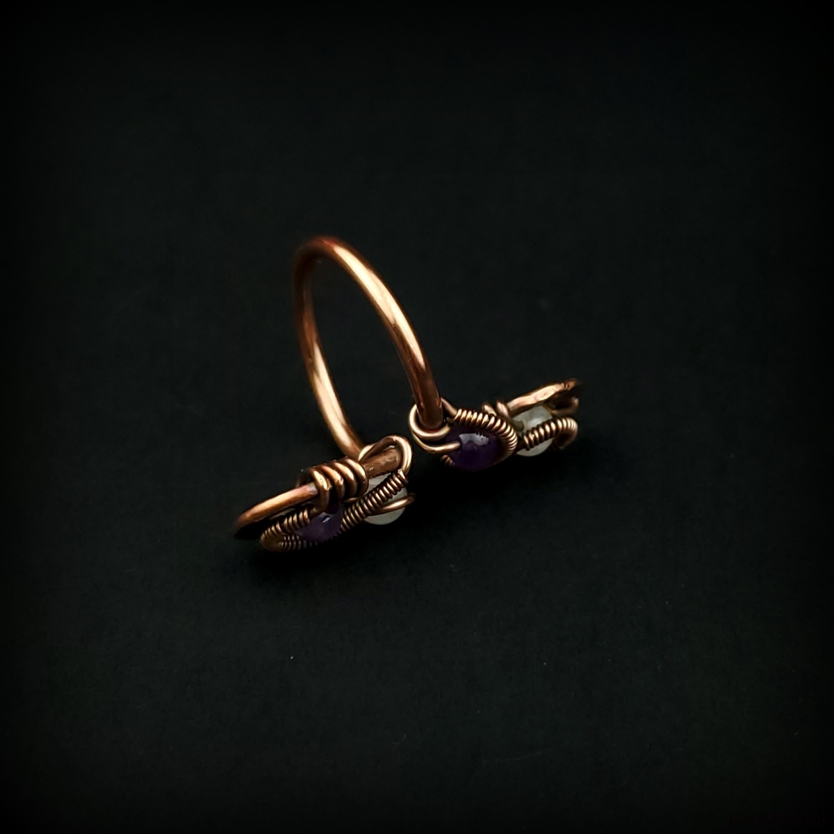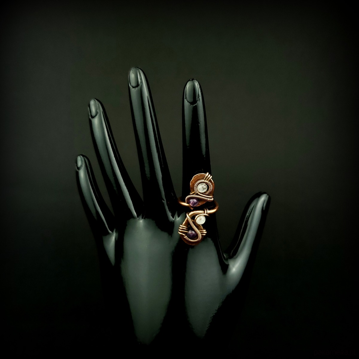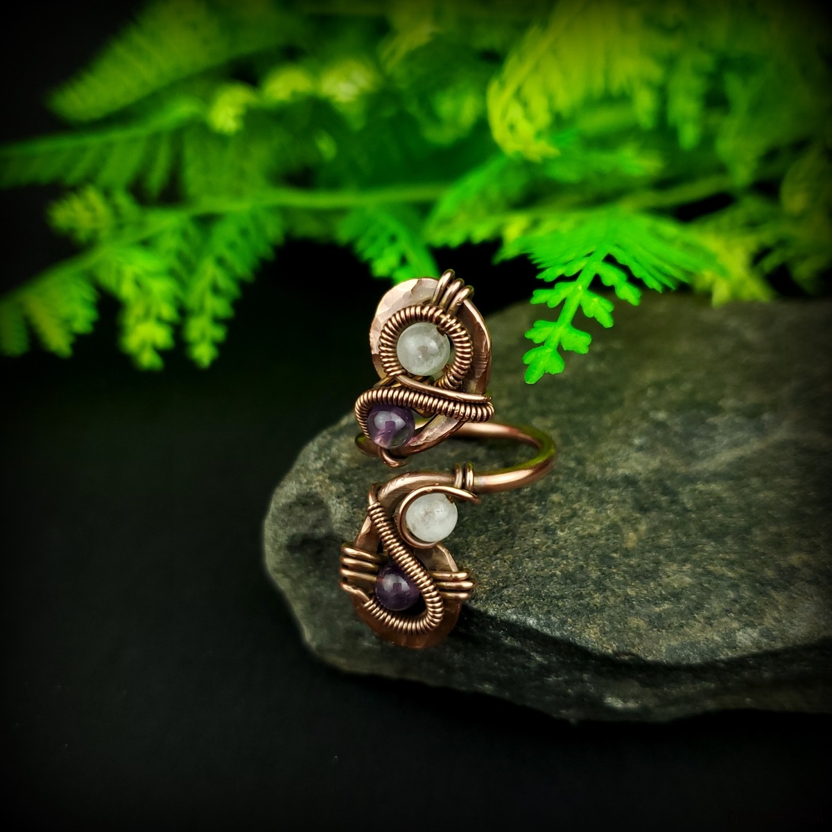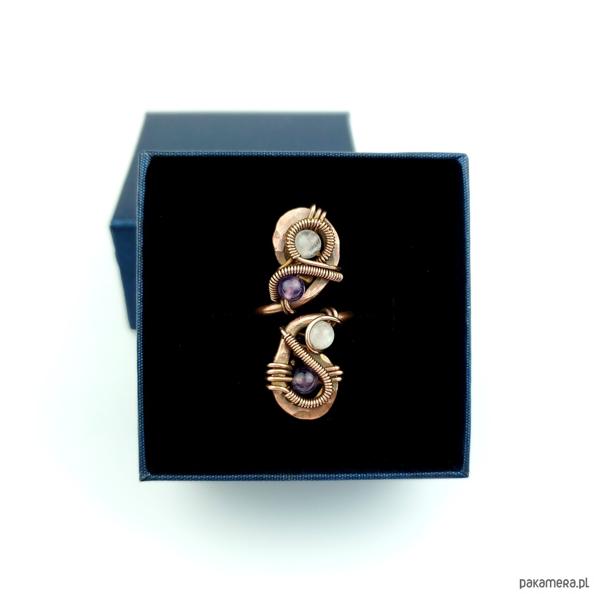 Pierścionek wykonany w pracochłonnej technice wire wrappingu. Obrączka gładka, góra wykonana z fakturowanej miedzi. W oplocie połyskują kamienie: ametyst i różowy kwarc. Pierścionek z małą regulacją - rozmiar optymalny 13 - 15 (obwód 53 mm -55 mm).