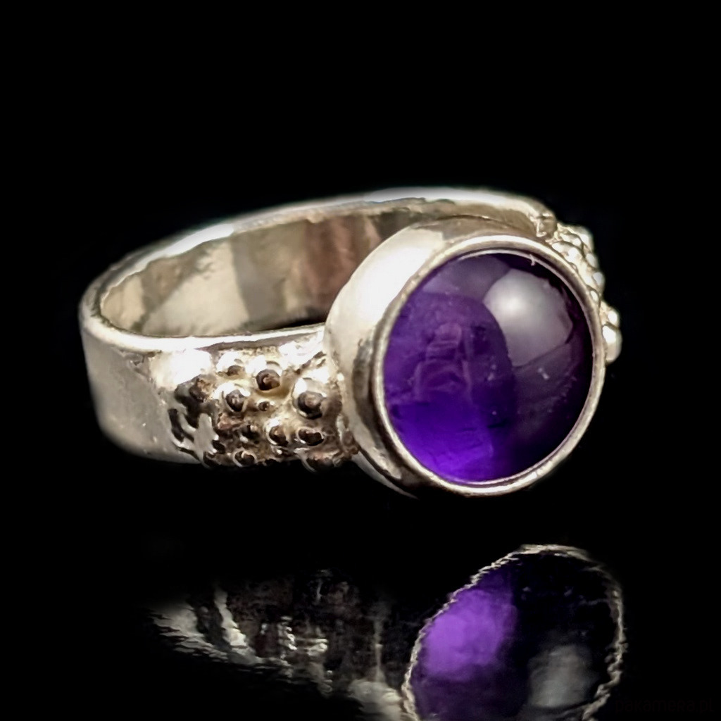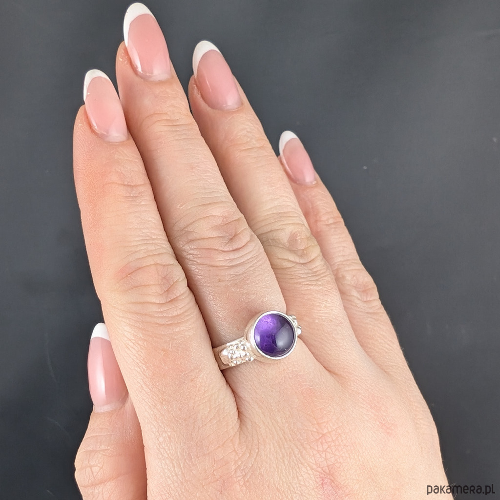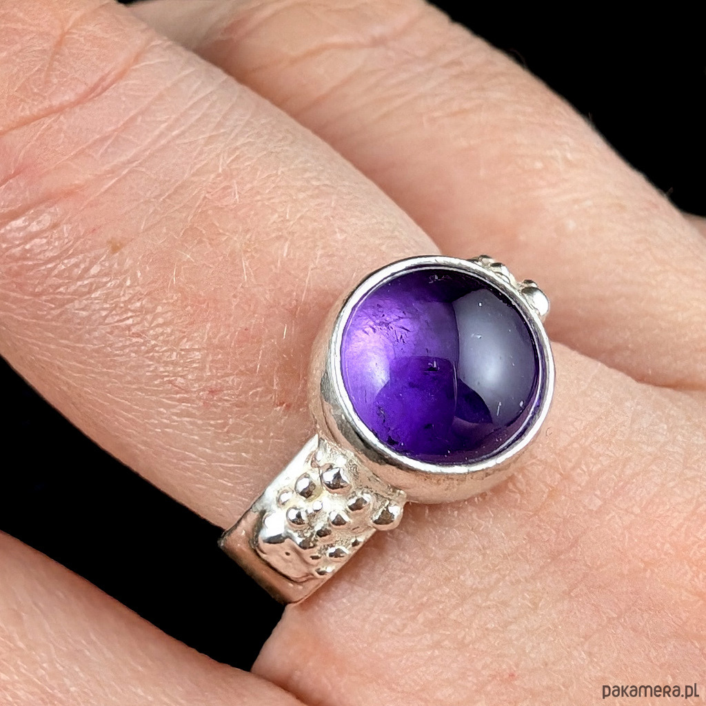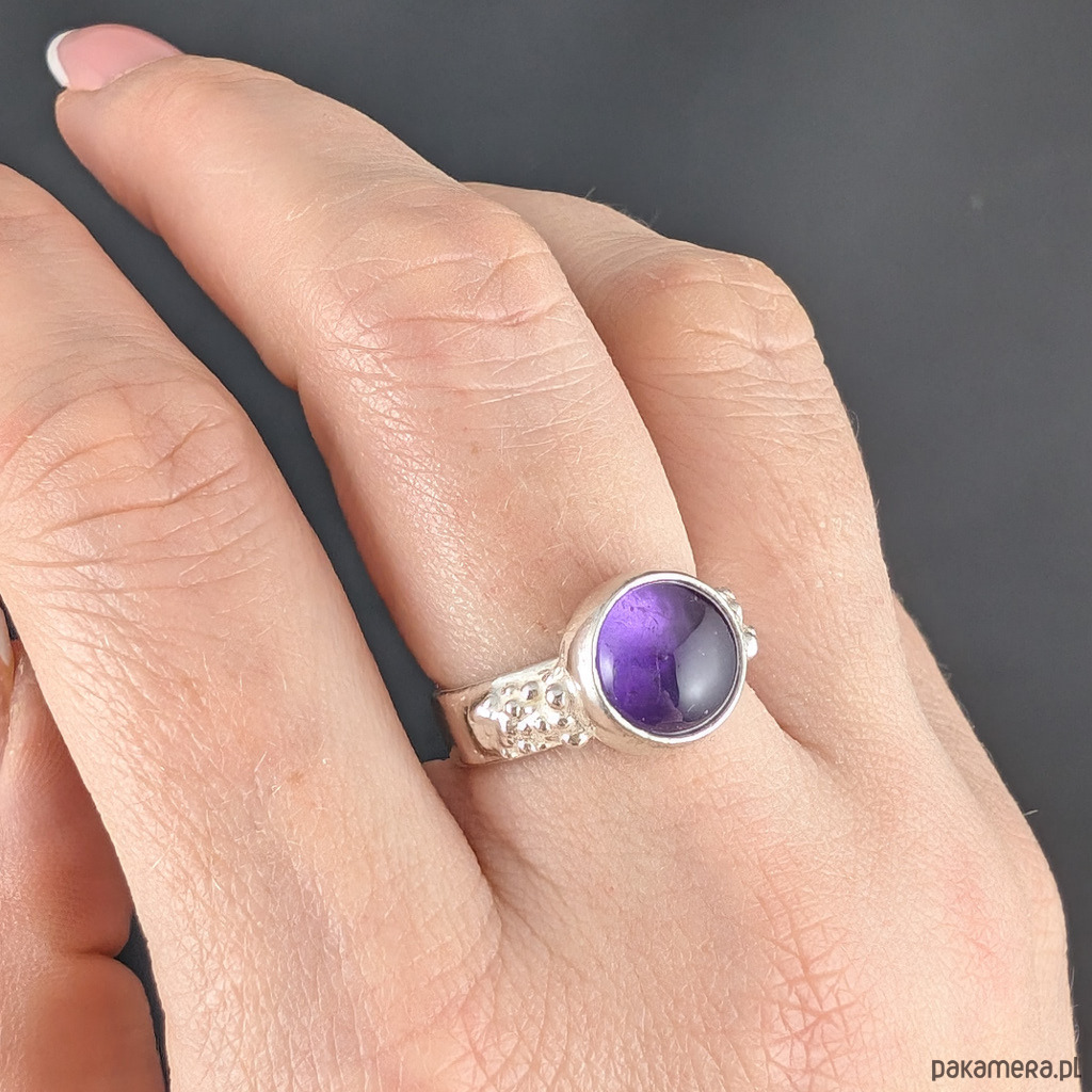 Subtelny pierścionek wykonany ze srebra próby 925. Ozdobą pierścionka jest ametyst. Średnica oprawy kamienia 10 mm,szerokość obrączki 5 mm, waga pierścienia 6,2 grama. Rozmiar jubilerski 16. Możliwe powiększenie do max. 17 lub wykonanie podobnego pierścionka w innym rozmiaru lub z innym kamieniem. Pierścień zostanie zapakowany w ozdobne pudełeczko.