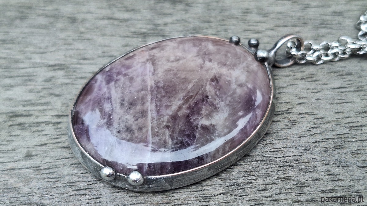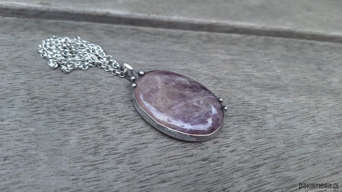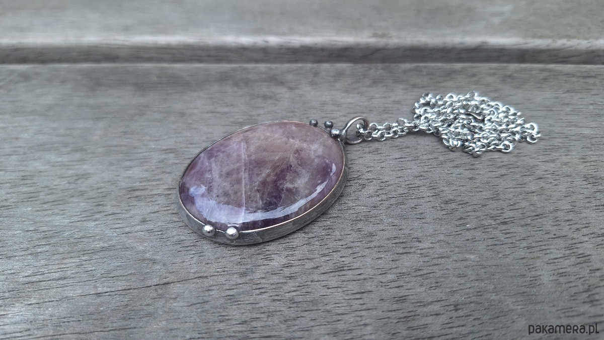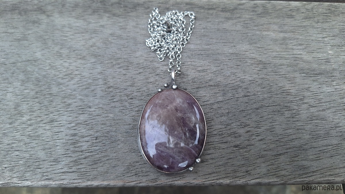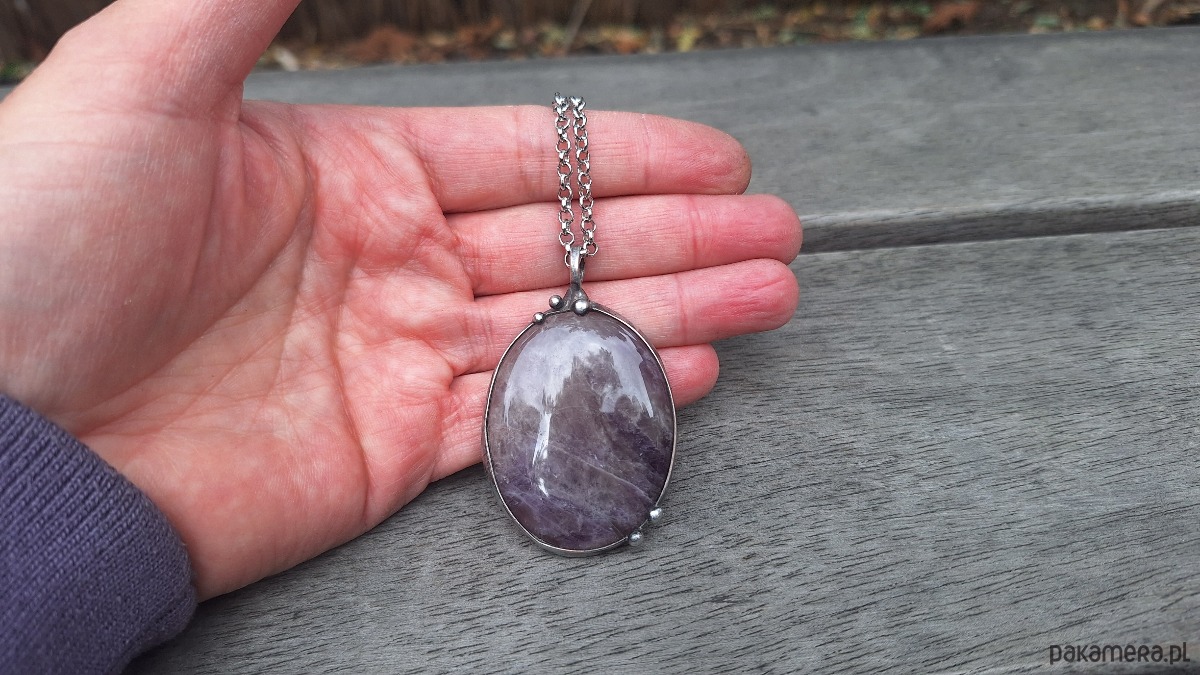 Wisiorek wykonany z miedzi, cyny i ametystu. Wymiary ok. 5 na 3.5 cm. Zawieszony na łańcuszku o długości ok. 50 cm.