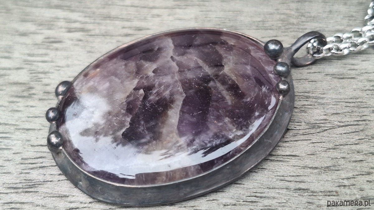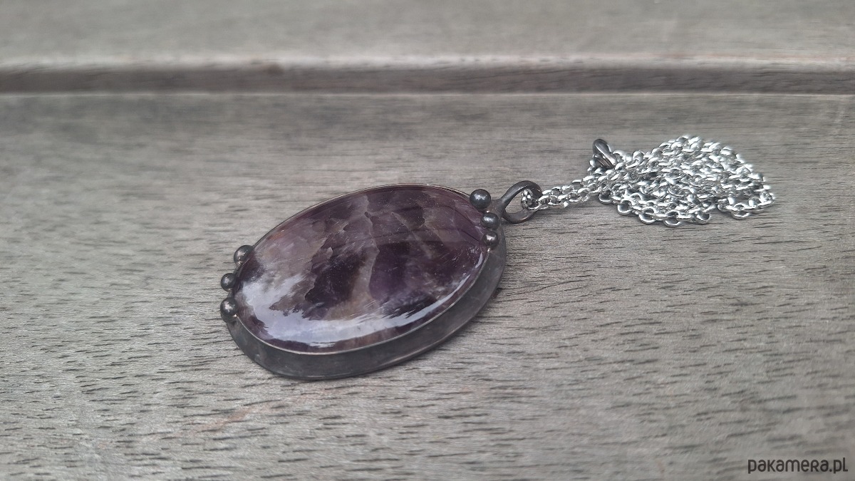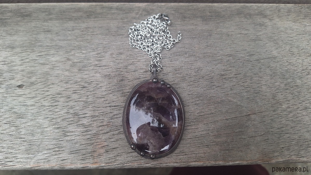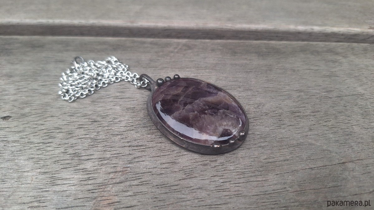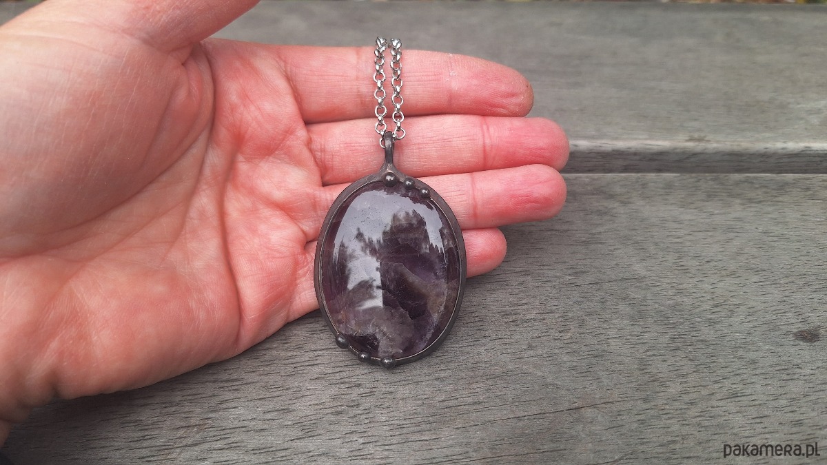 Wisiorek wykonany z miedzi, cyny i ametystu. Wymiary ok. 5 na 3.5 cm. Zawieszony na łańcuszku o długości ok. 50 cm.