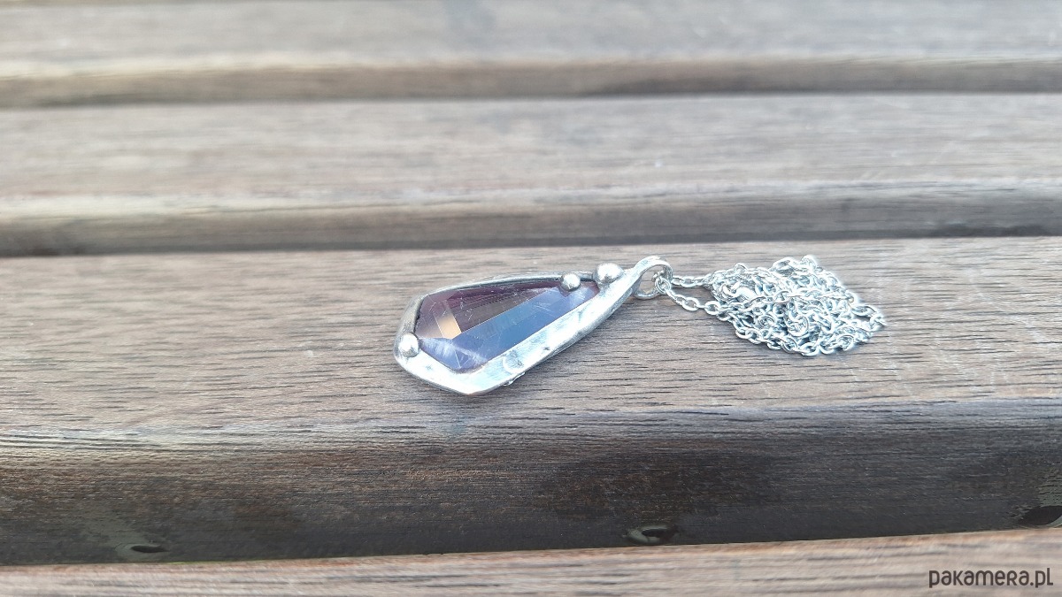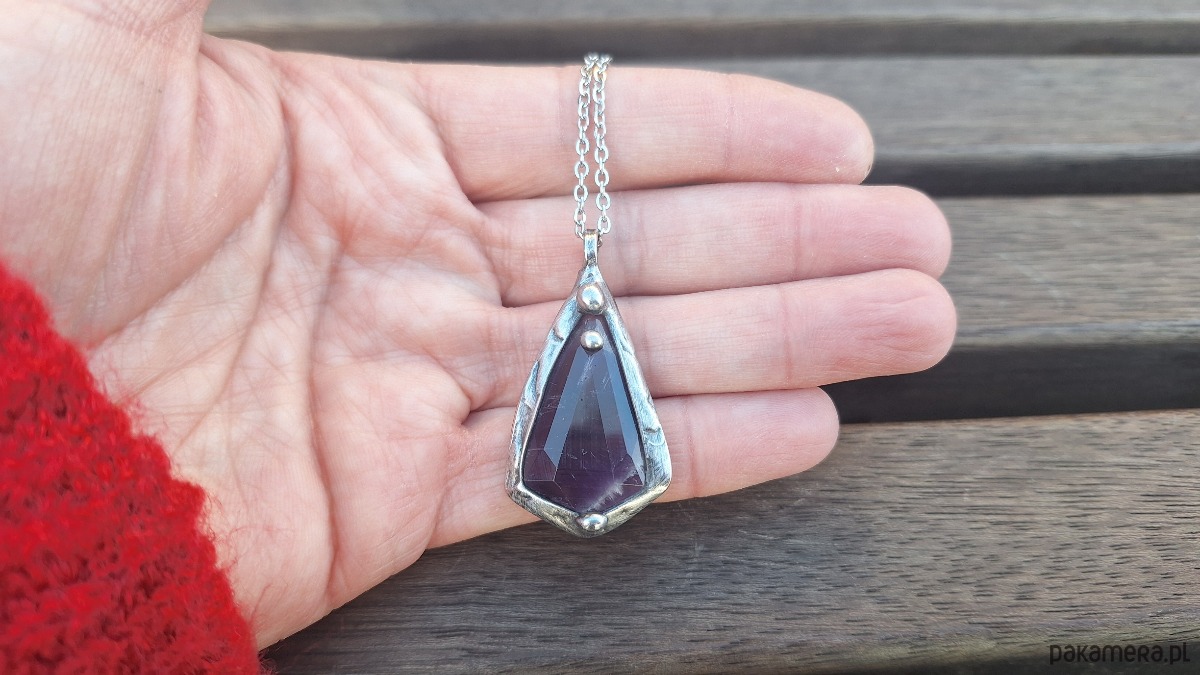 Wisiorek wykonany z miedzi, cyny i ametystu. Wymiary ok. 3.5 na 2 cm. Zawieszony na łańcuszku o długości ok. 50 cm.