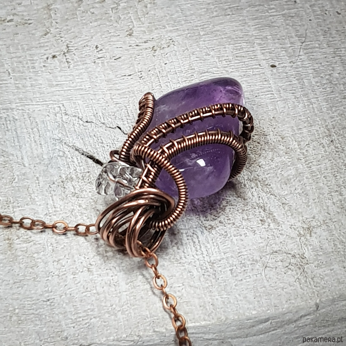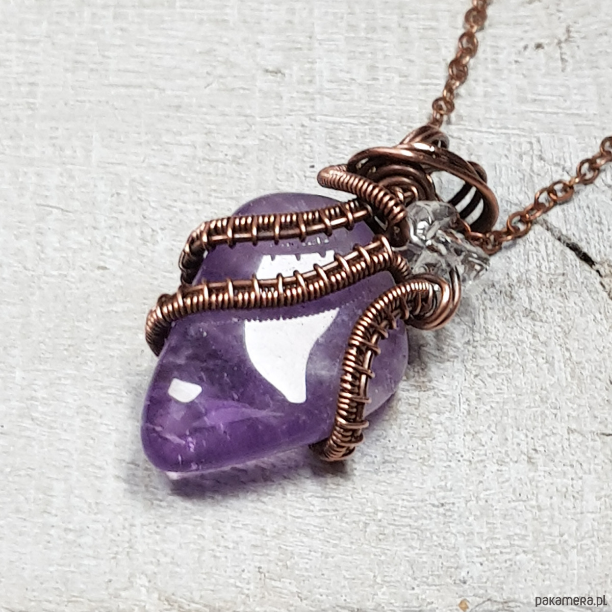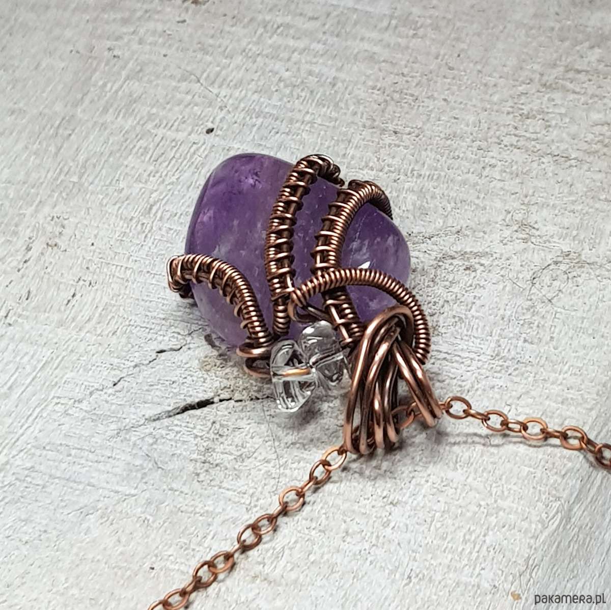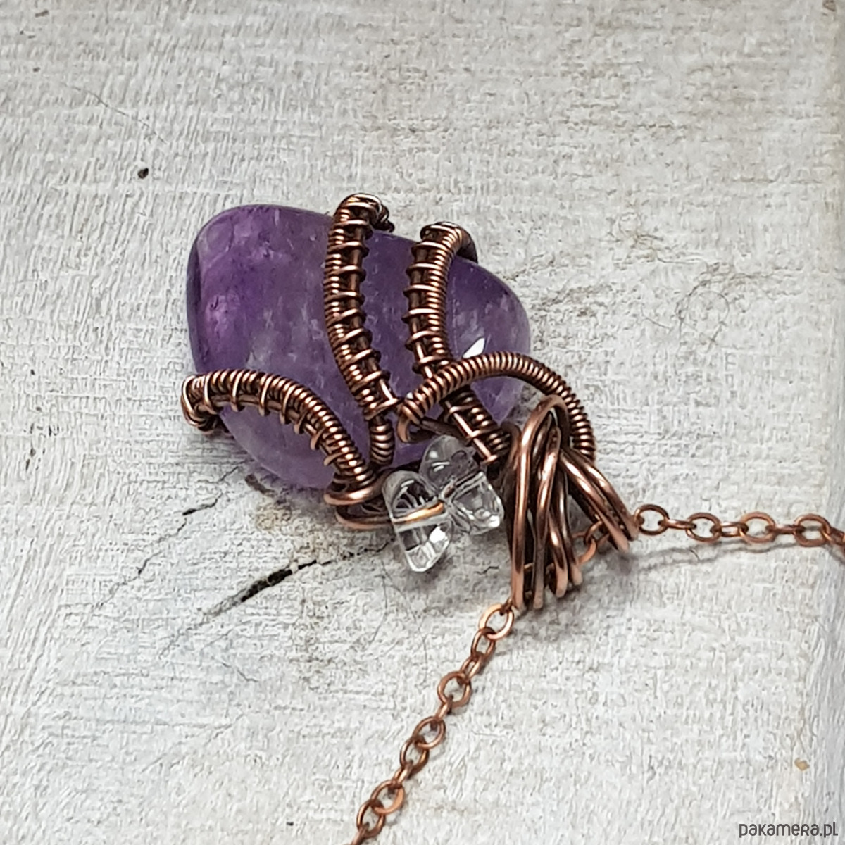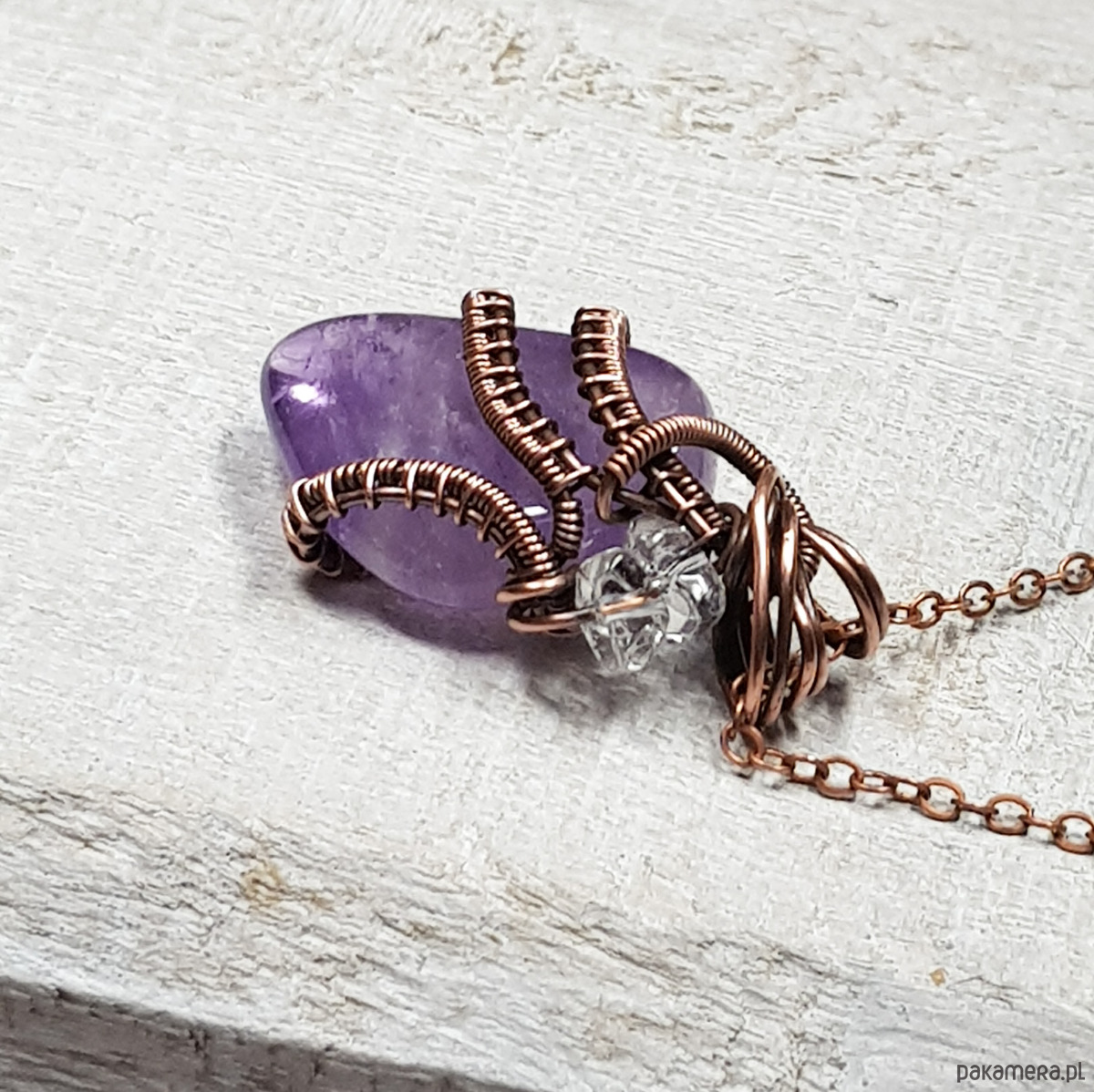 Zawieszka na łańcuszku z naturalnego ametystu i kryształków kryształu górskiego. Naszyjnik zrobiony ręcznie z miedzi pracochłonną metodą wire-wrappingu, następnie oksydowany i wypolerowany w celu uzyskania efektu szlachetnego postarzenia. Wymiary wisiorka 38x22, zawieszony na łańcuszku standardowej długości około 45-50cm.