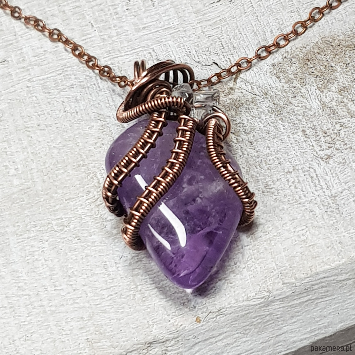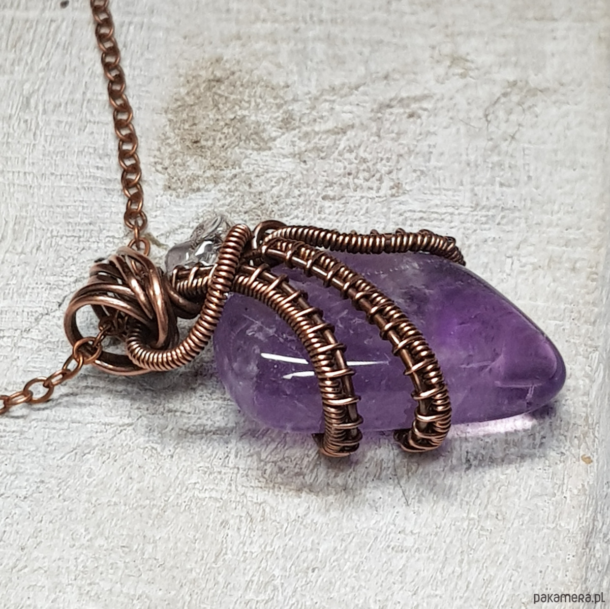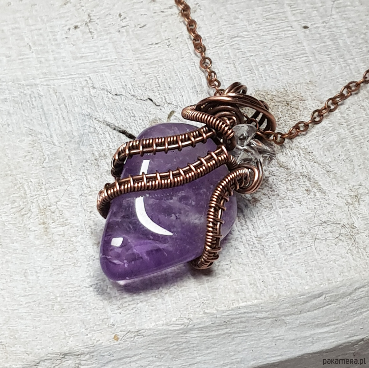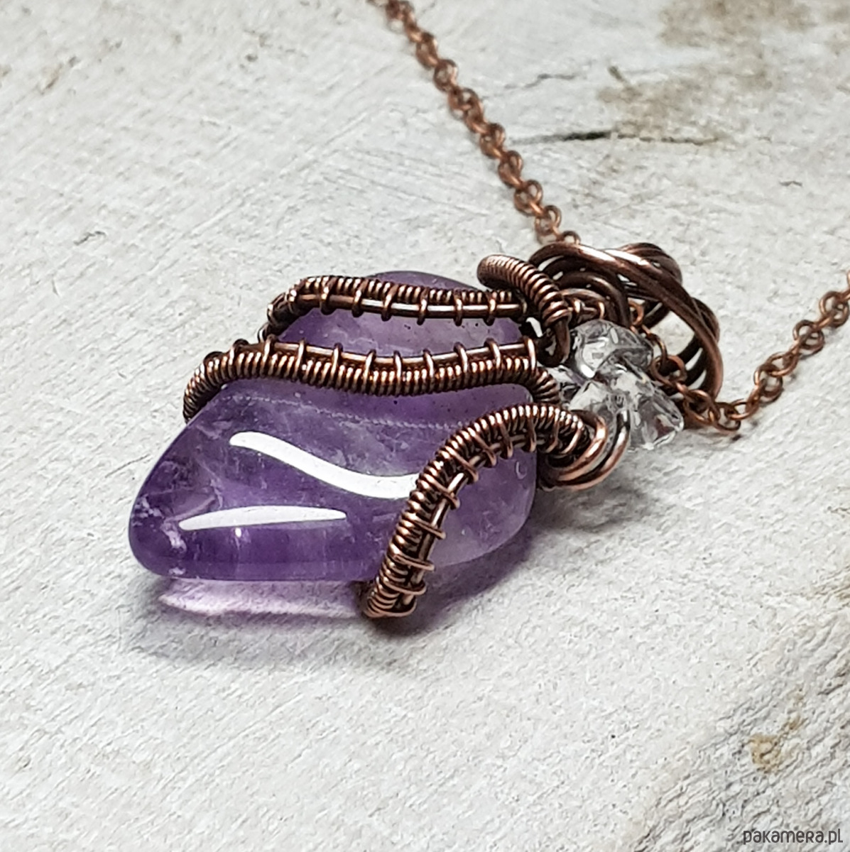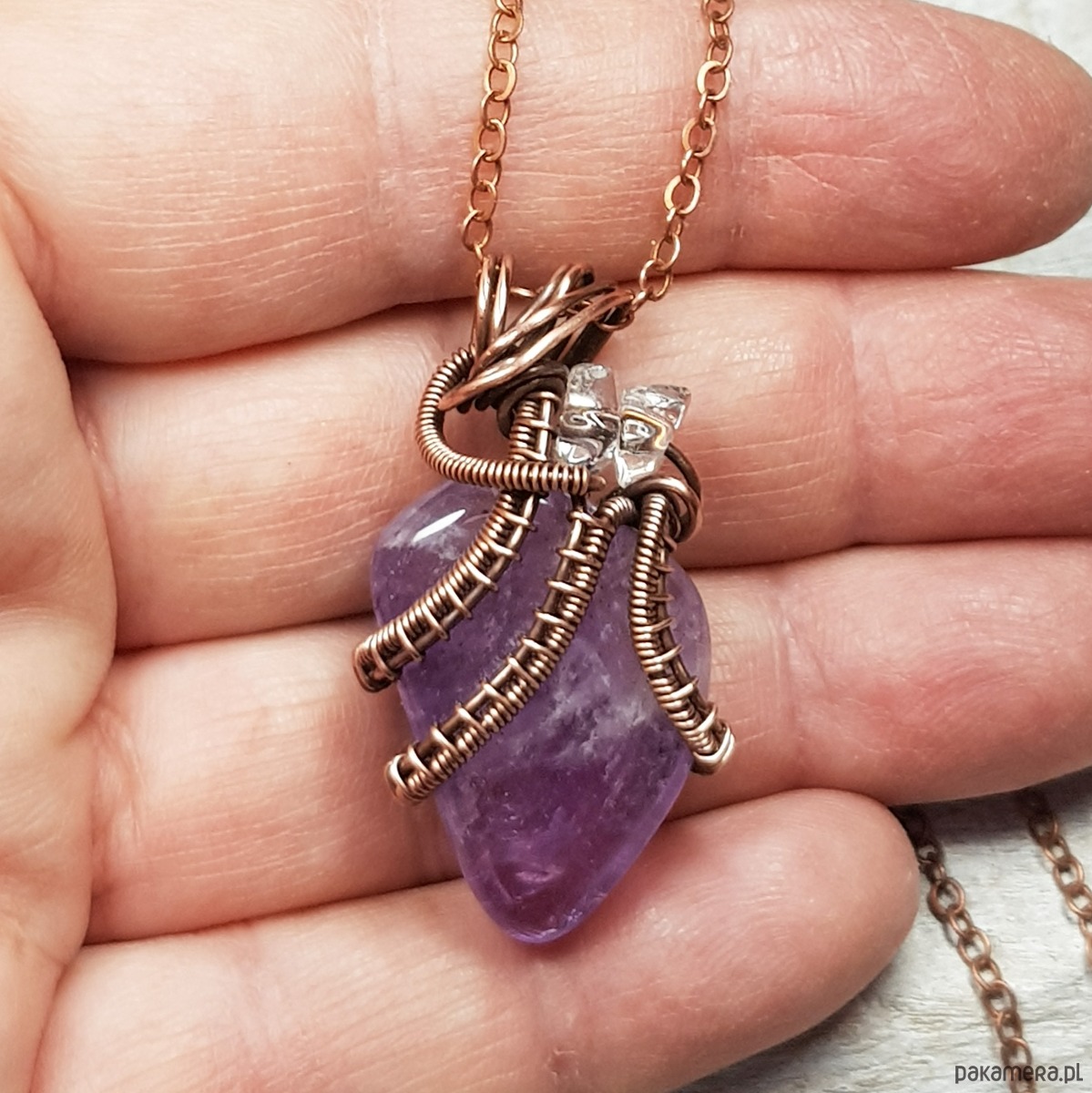 Zawieszka na łańcuszku z naturalnego ametystu i kryształków kryształu górskiego. Naszyjnik zrobiony ręcznie z miedzi pracochłonną metodą wire-wrappingu, następnie oksydowany i wypolerowany w celu uzyskania efektu szlachetnego postarzenia. Wymiary wisiorka 38x22, zawieszony na łańcuszku standardowej długości około 45-50cm.