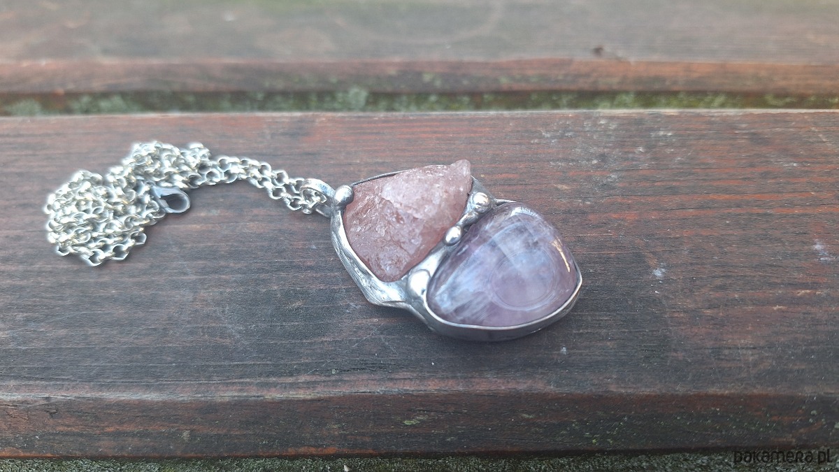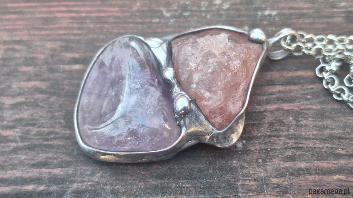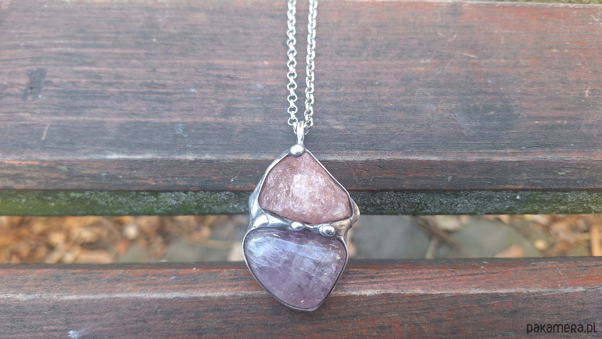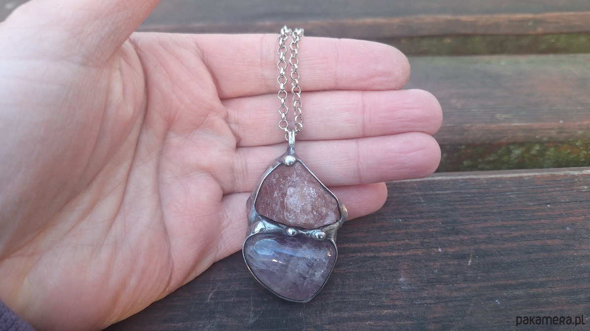 Wisiorek wykonany z miedzi, cyny, surowego kwarcu i ametystu. Wymiary ok. 4.5 na 2.5 cm. Zawieszony na łańcuszku o długości ok. 50 cm.