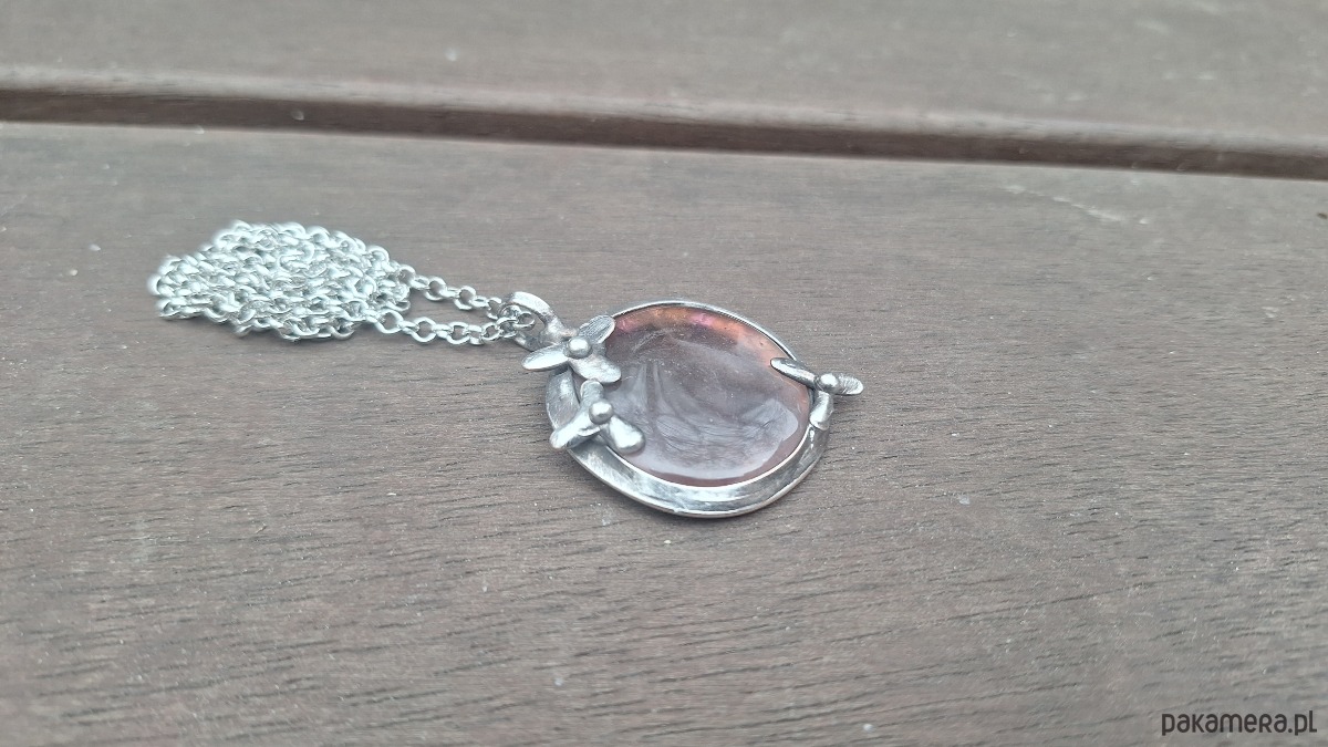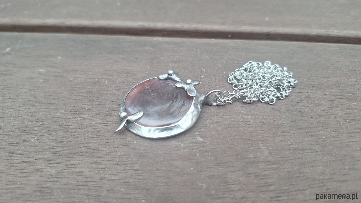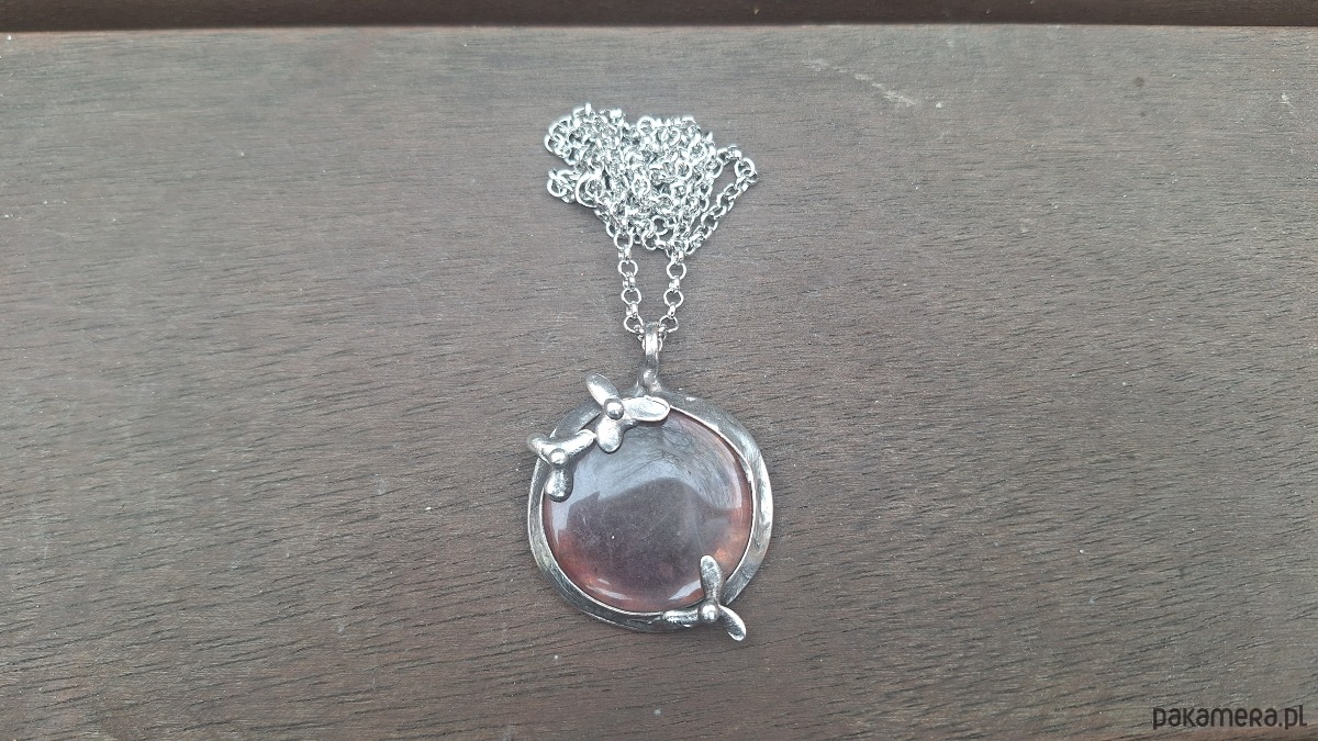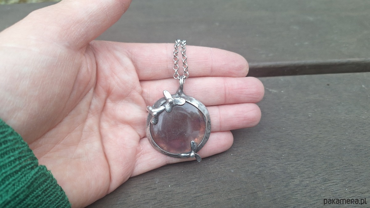 Wisiorek wykonany z miedzi, cyny i ametystu. Wymiary ok. 3.5 na 3.5 cm. Zawieszony na łańcuszku o długości ok. 50 cm.