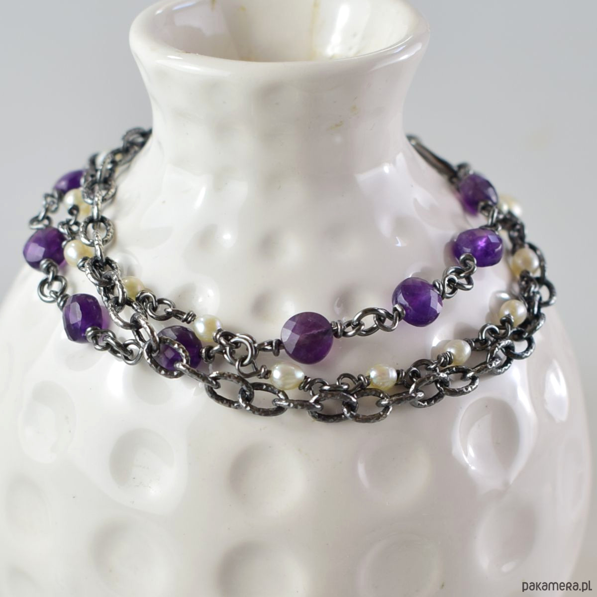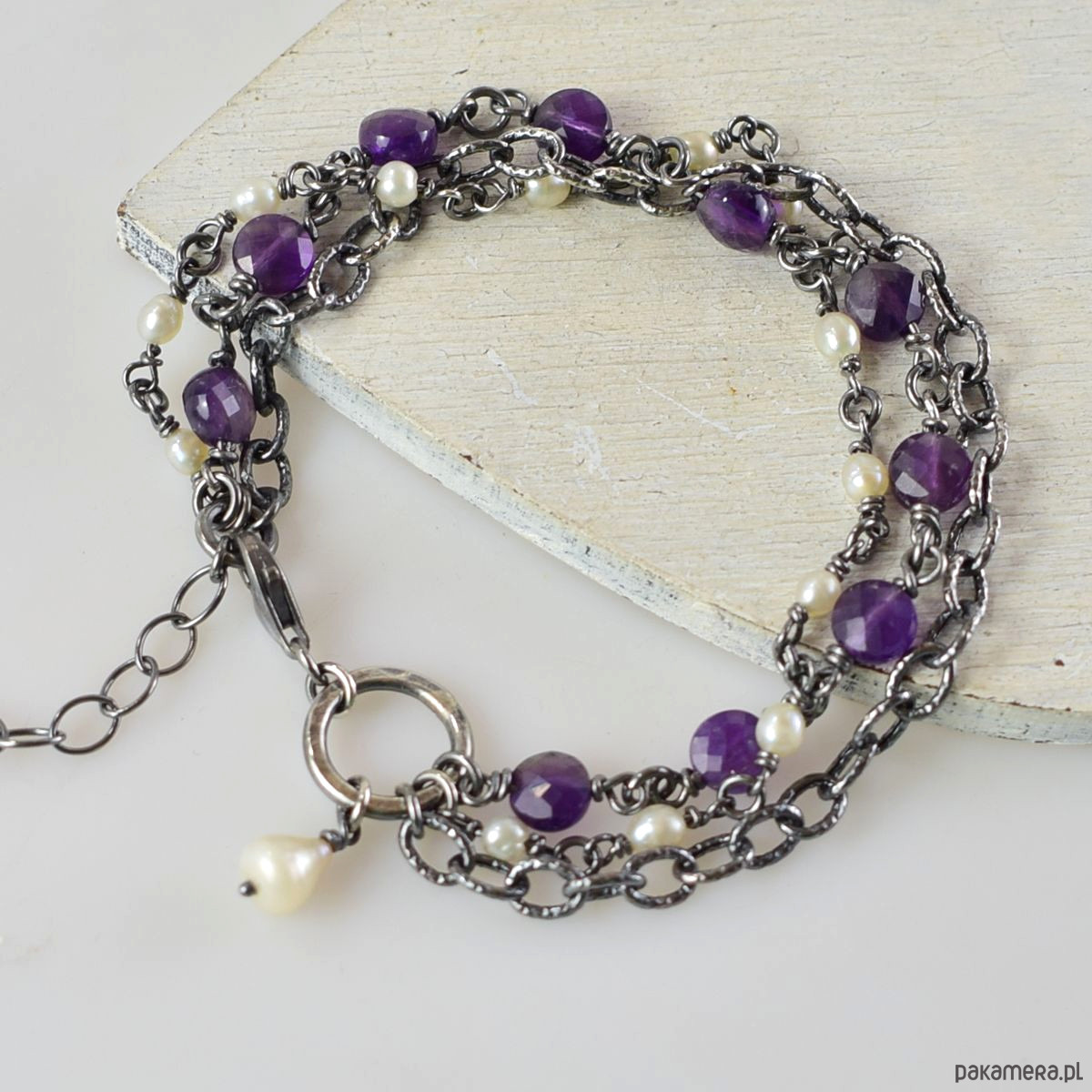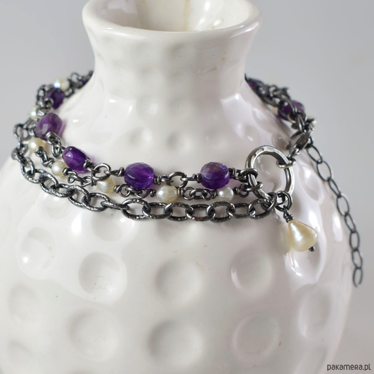 Bransoletka wykonana w całości ze srebra (próba 925) z ametystem i perłami. Całość została zoksydowana (przyciemniona) i wypolerowana. Długość regulowana 19,5 - 23 cm. Biżuteria zostanie ozdobnie zapakowana.