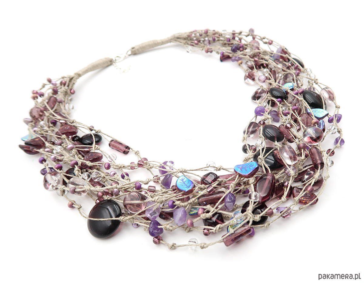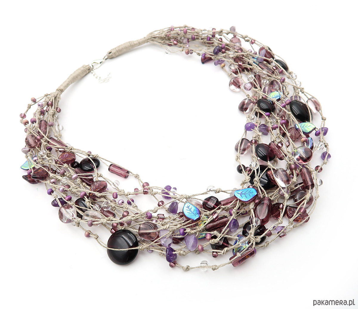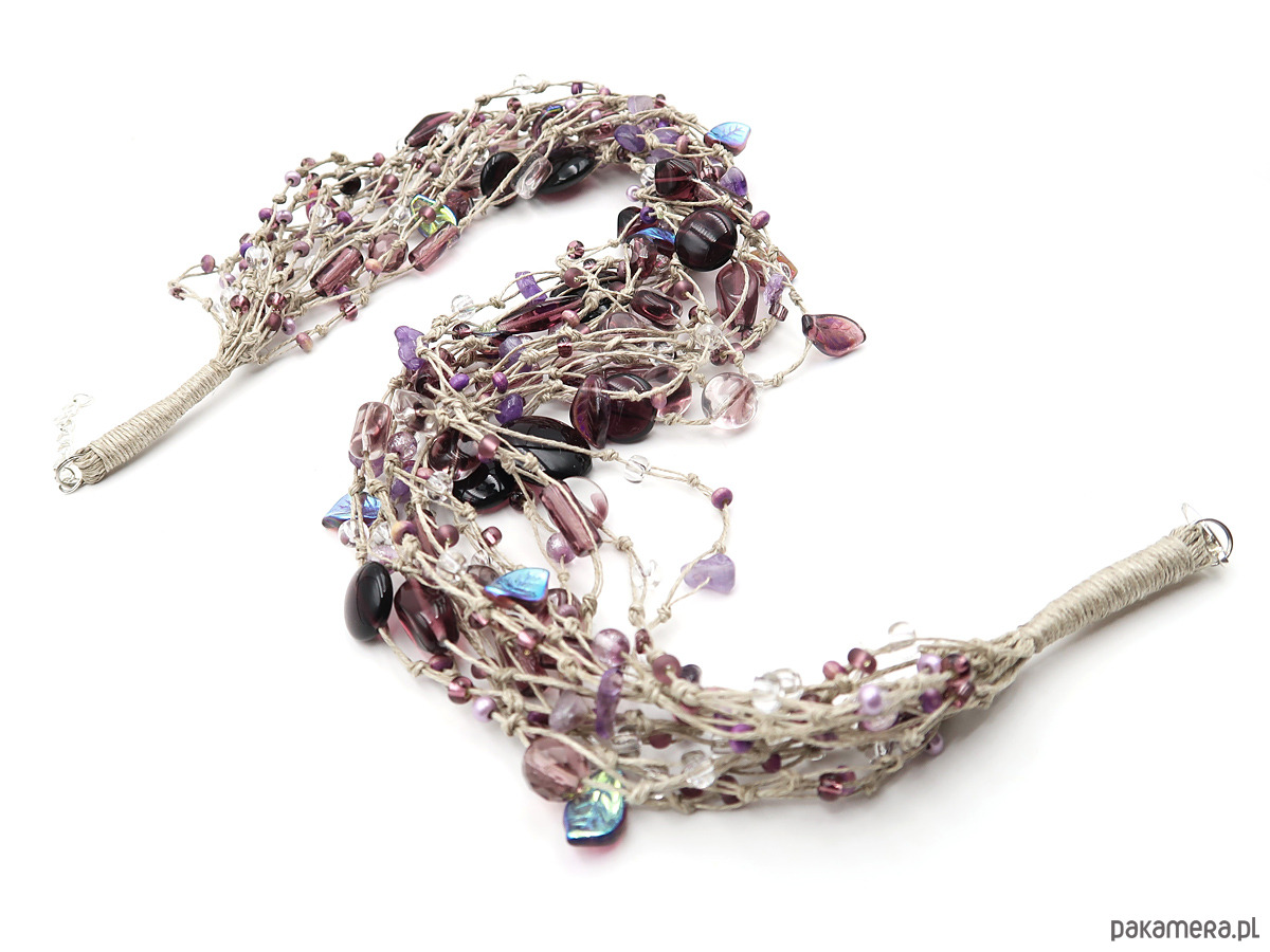 Kompozycja utrzymana jest w stonowanych ametystowych fioletach, przełamanych subtelnymi zielono-niebieskimi refleksami szklanych listków. W splocie wykorzystano czeskie szkło Jablonex oraz nieregularne bryłki naturalnego ametystu, które nadają całości organiczny, lekko magiczny charakter.