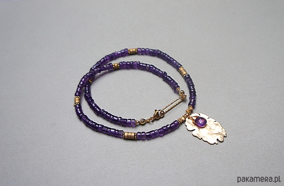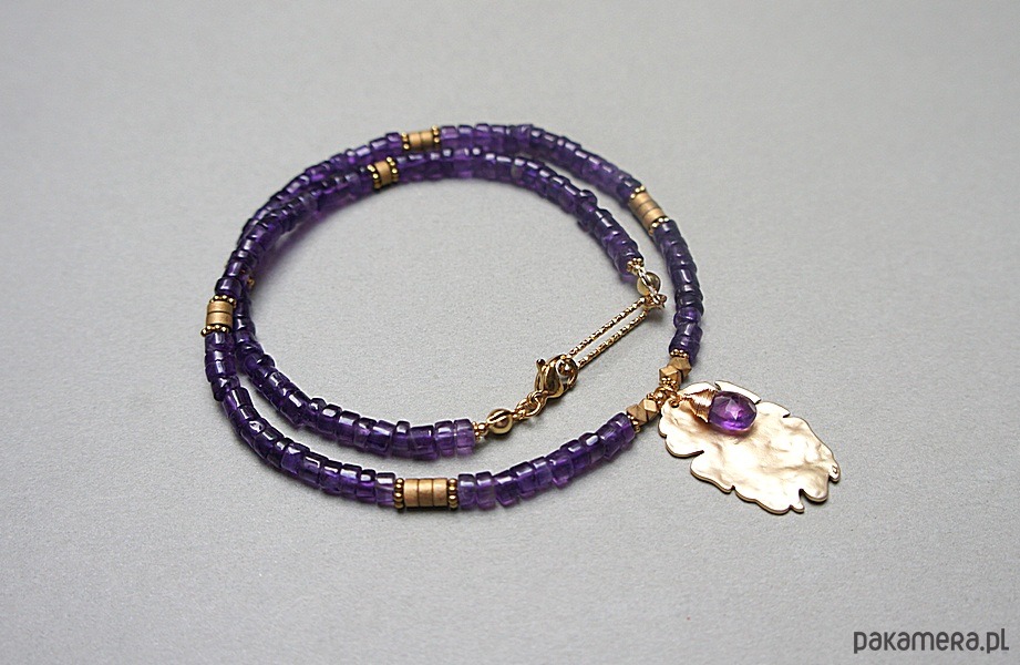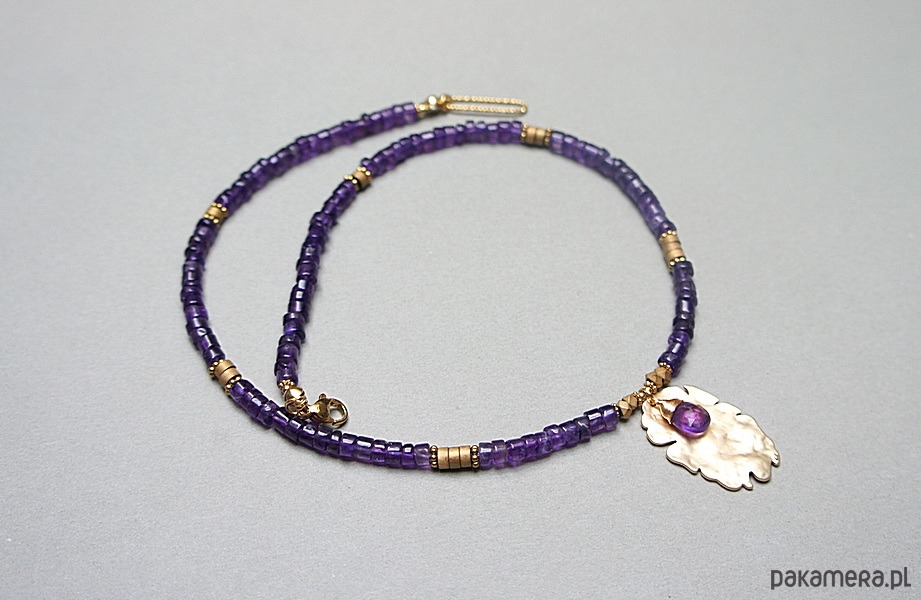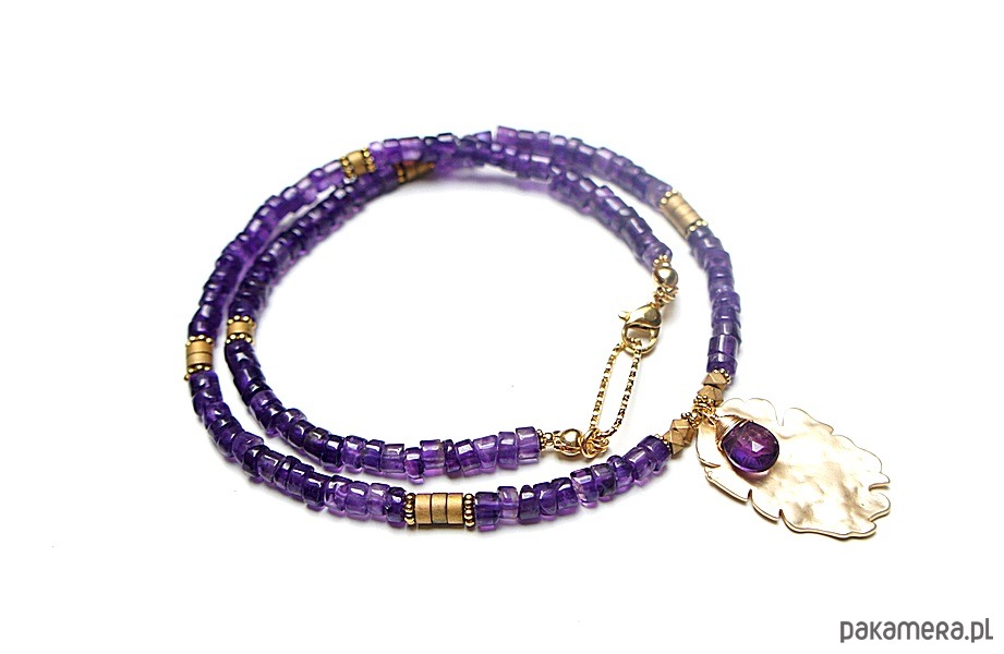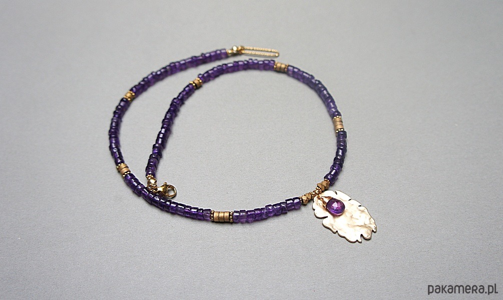 Krótki, delikatny naszyjnik wykonany z pozłacanej stali szlachetnej oraz naturalnych, szlachetnych kamieni - talarki nieregularnego ametystu [4 x 2mm] przekładek z hematytu [4 x 2mm i 3 x 2mm] oraz zawieszki brioletki z naturalnego ametystu [11mm], blaszka wykonana z mosiądzu platerowanego 14k złotem. Naszyjnik o długości 42,5cm.