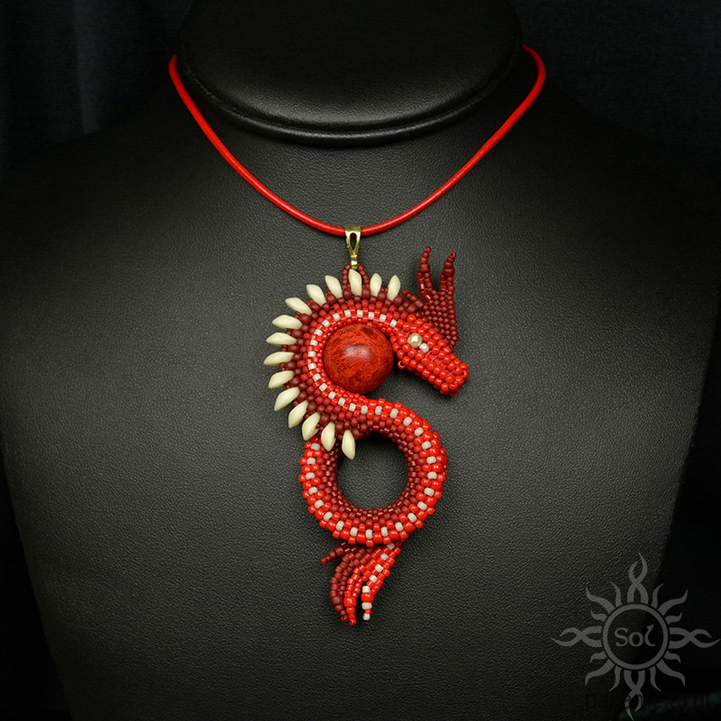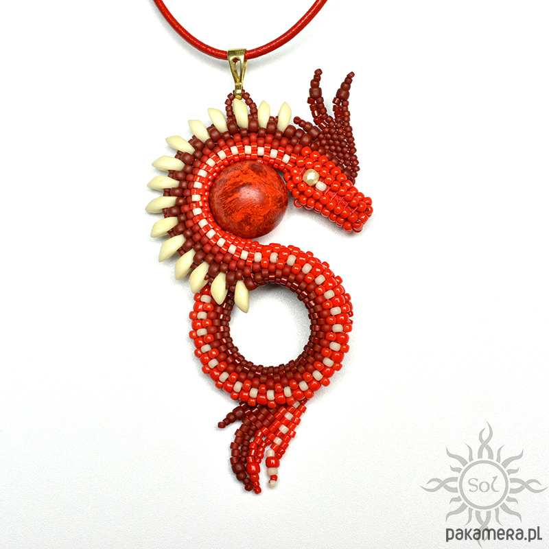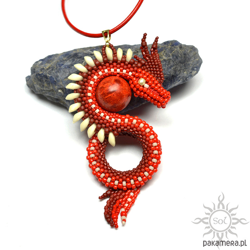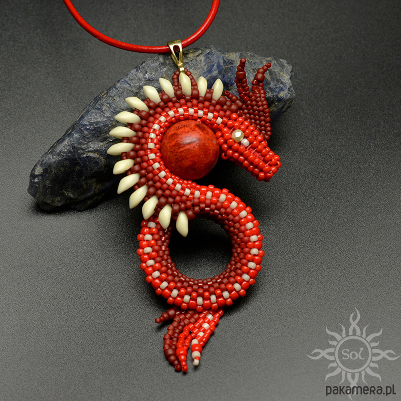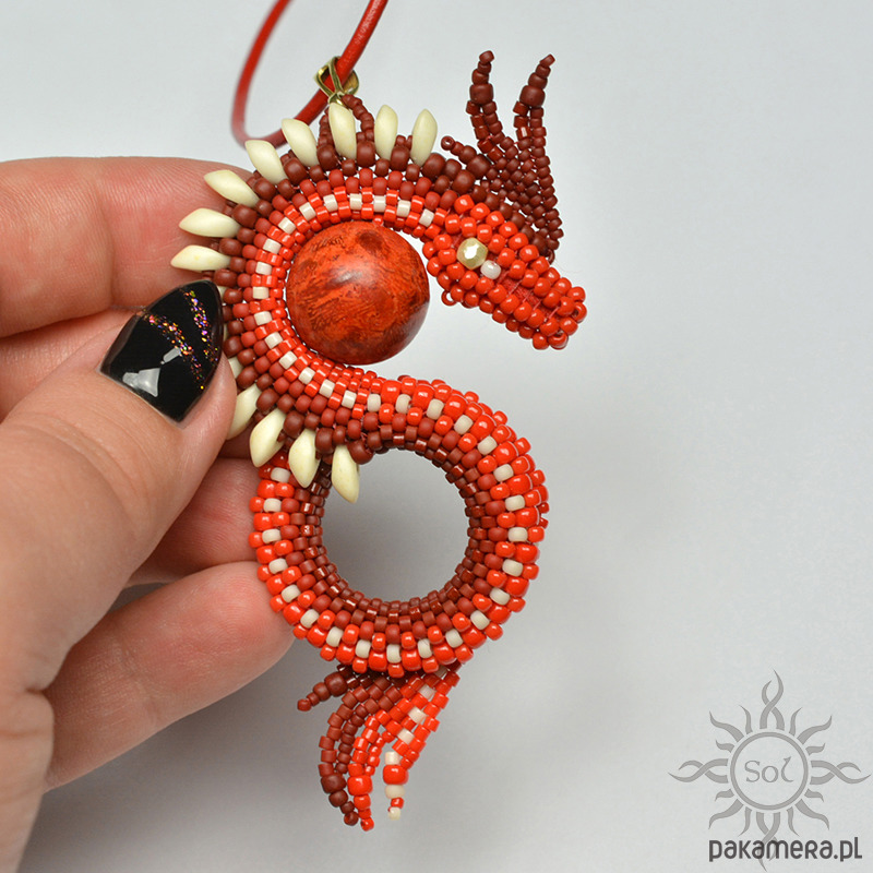Wyplotłam go czasochłonną techniką beadingu z najwyższej jakości japońskich koralików Toho i Miyuki w dwóch odcieniach czerwieni złamanych ecru. Oczy są zrobione z czeskich kryształów fire polish.